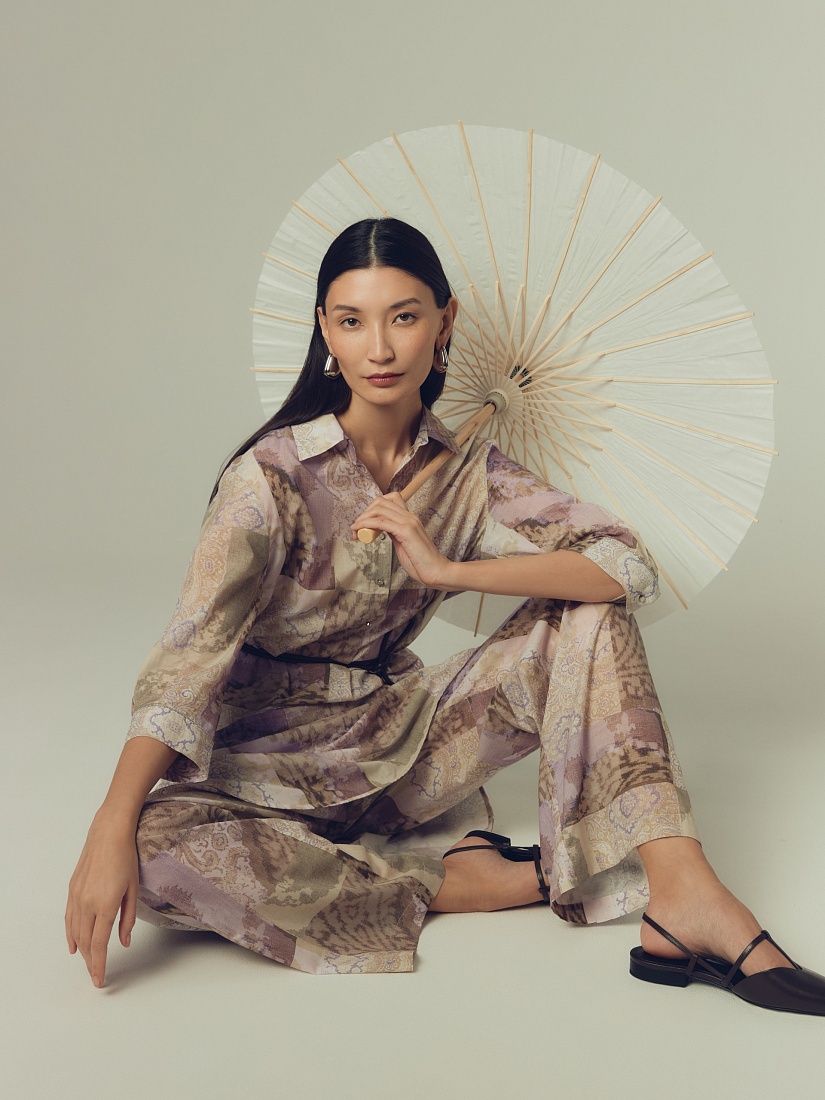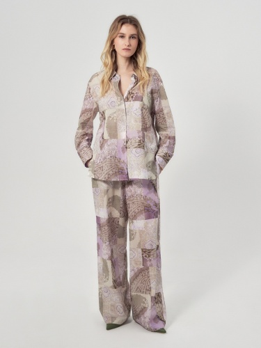 Брюки полной длины, из тонкой хлопковой ткани с этническим принтом в технике пэчворк, свободной формы, на поясе. В пояс вставлена резинка и кулиcка для лучшей фиксации.