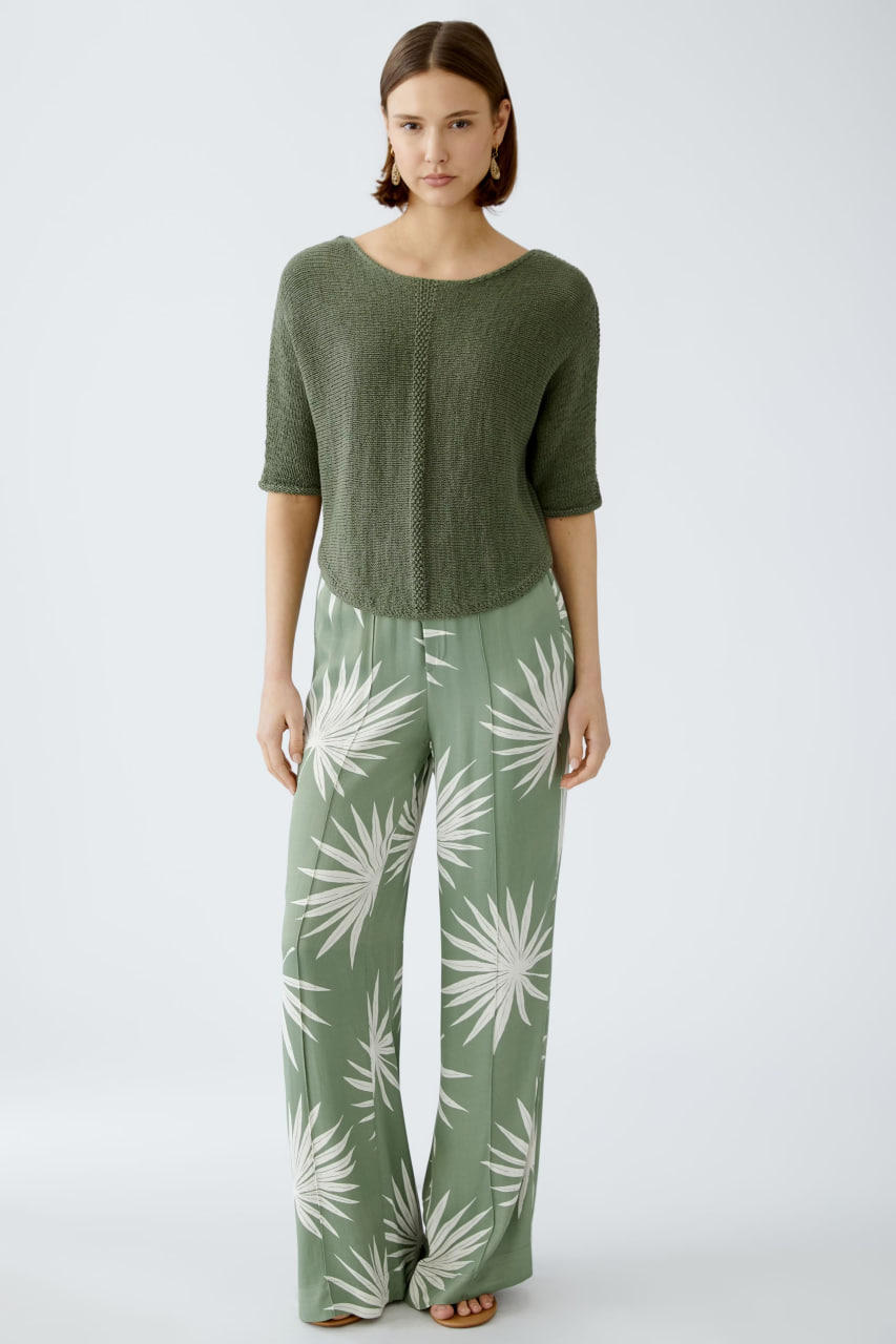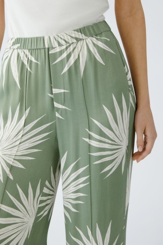 Роскошные брюки из вискозного атласа с эксклюзивным принтом пальм – каждая модель уникальна благодаря индивидуальному расположению рисунка. Свободный крой с высокой посадкой и удлинённым силуэтом создаёт элегантный образ, а эластичный пояс обеспечивает комфорт