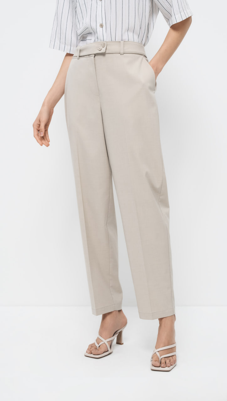 Брюки О-образного силуэта длиной 9/10 выполнены из летней вискозы со спандексом, обеспечивающим абсолютный комфорт за счет высокой эластичности. Цвет «белый сандал» придает изделию свежесть и легкость. Дополнительный съемный пояс со смещенной линией застежки добавляет изделию оригинальности, пуговицы на нем расположены в динамичном порядке, придавая брюкам уникальный стильный вид.