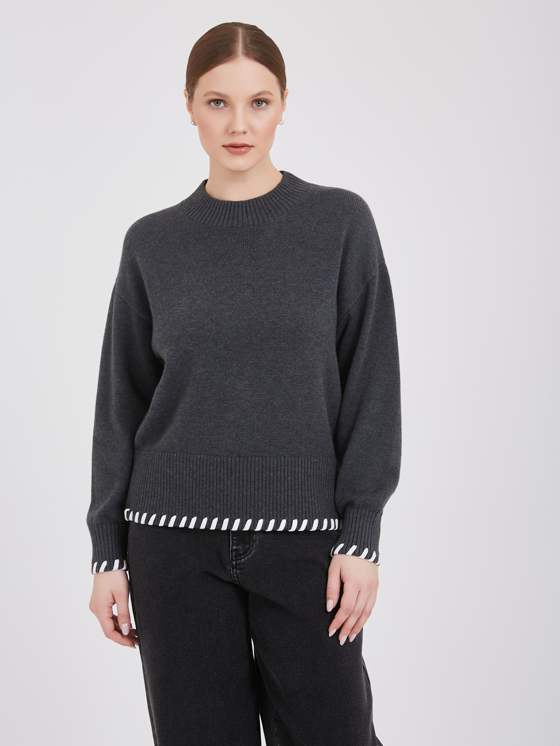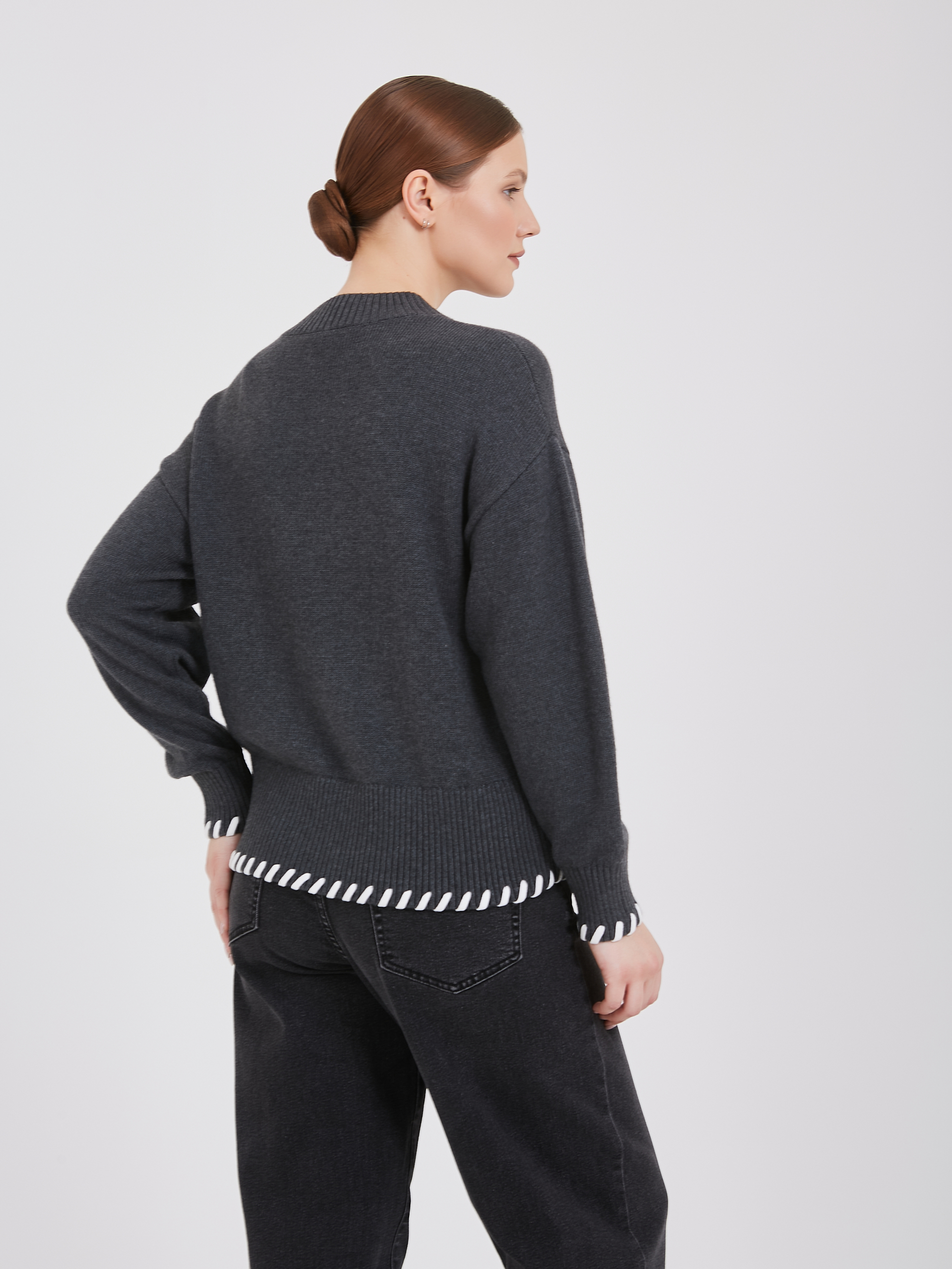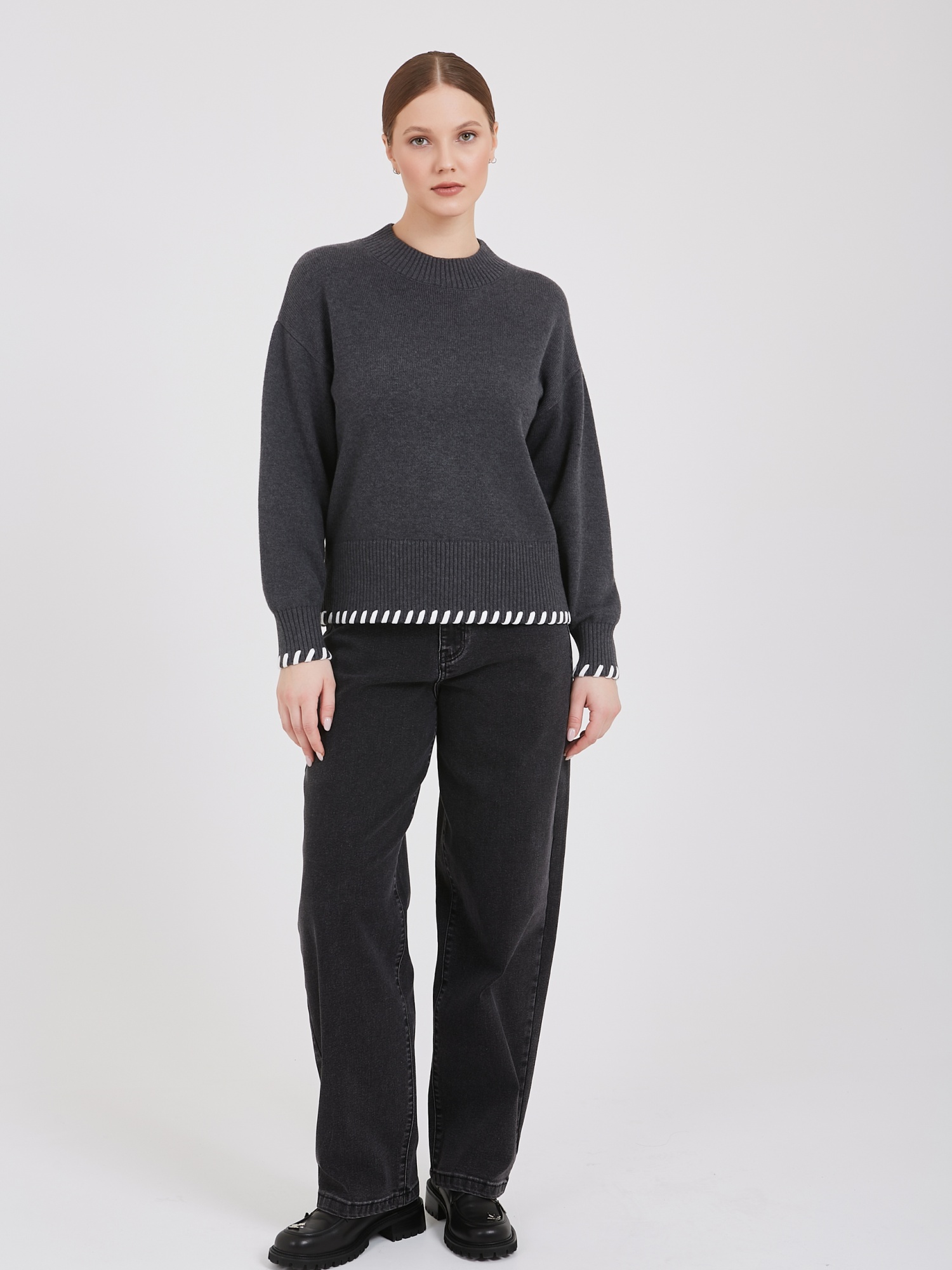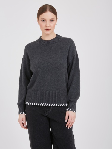 Женский темно-серый свитер свободного кроя. Длинные рукава и круглый вырез подчеркивают элегантность образа. Горизонтальные белые полосы на нижней части изделия и манжетах создают стильный акцент. Натуральный высококачественный материал приятен к телу и идеально подходит для прохладной погоды. Осень-Зима'25/26. Капсула "Вишневый сад"