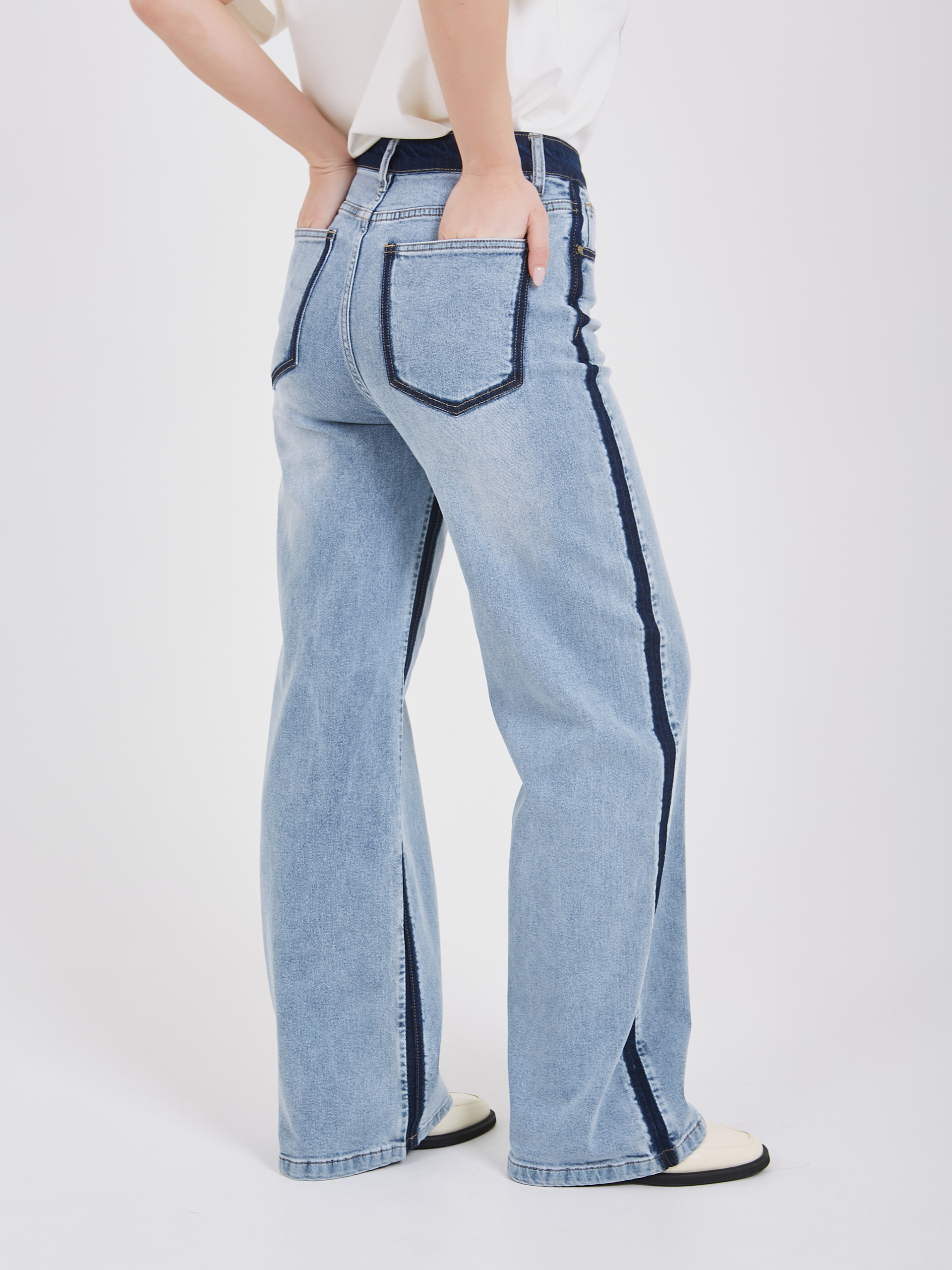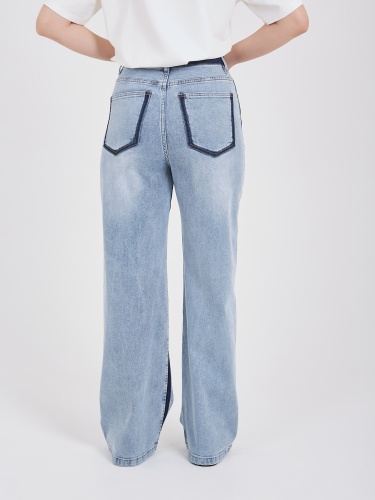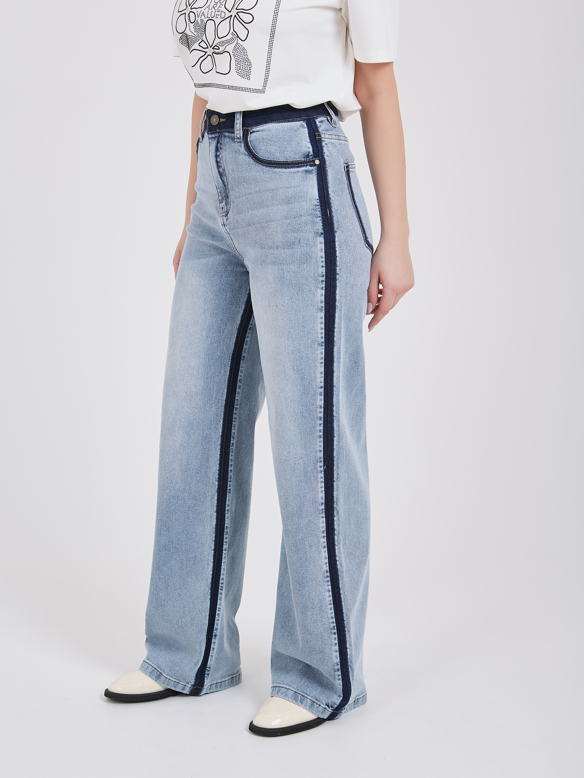 Джинсы поражают необычным эффектом выварки и двойным лампасом по внешним и внутренним швам, который заметно вытягивает силуэт и визуально увеличивает длину ног. Данная модель характеризуется высокой посадкой, полной длиной, прямой формой брючин и достаточно плотной тканью, что особенно актуально в осенне-зимний сезон. Эти джинсы прекрасно сидят на любой фигуре, подчеркивая ее преимущества и создавая стильный и современный образ. Осень-Зима'25/26. Капсула "Вино из одуванчиков"
