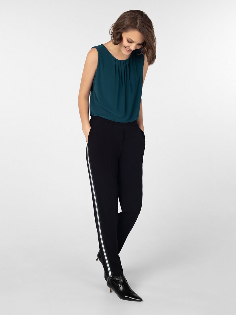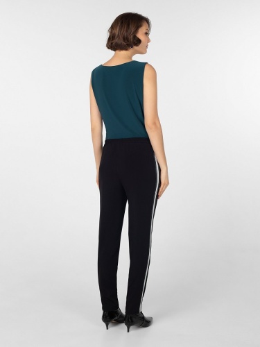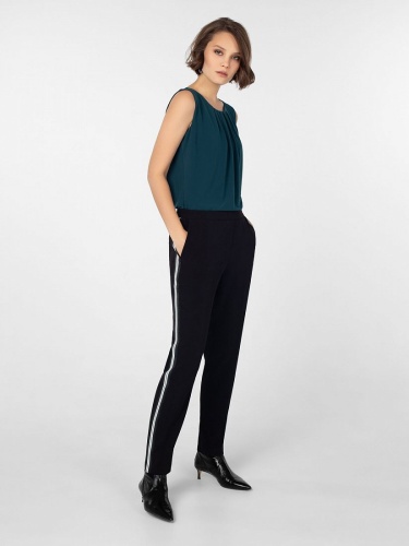 Брюки из костюмной ткани зауженного к низу силуэта на притачном поясе с резинкой и боковыми карманами. По бокам лампасы контрастного цвета.