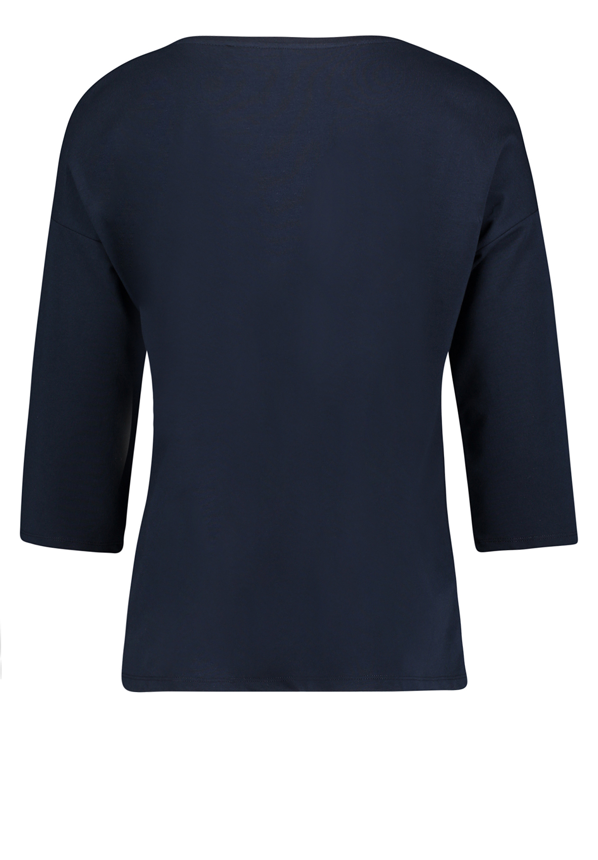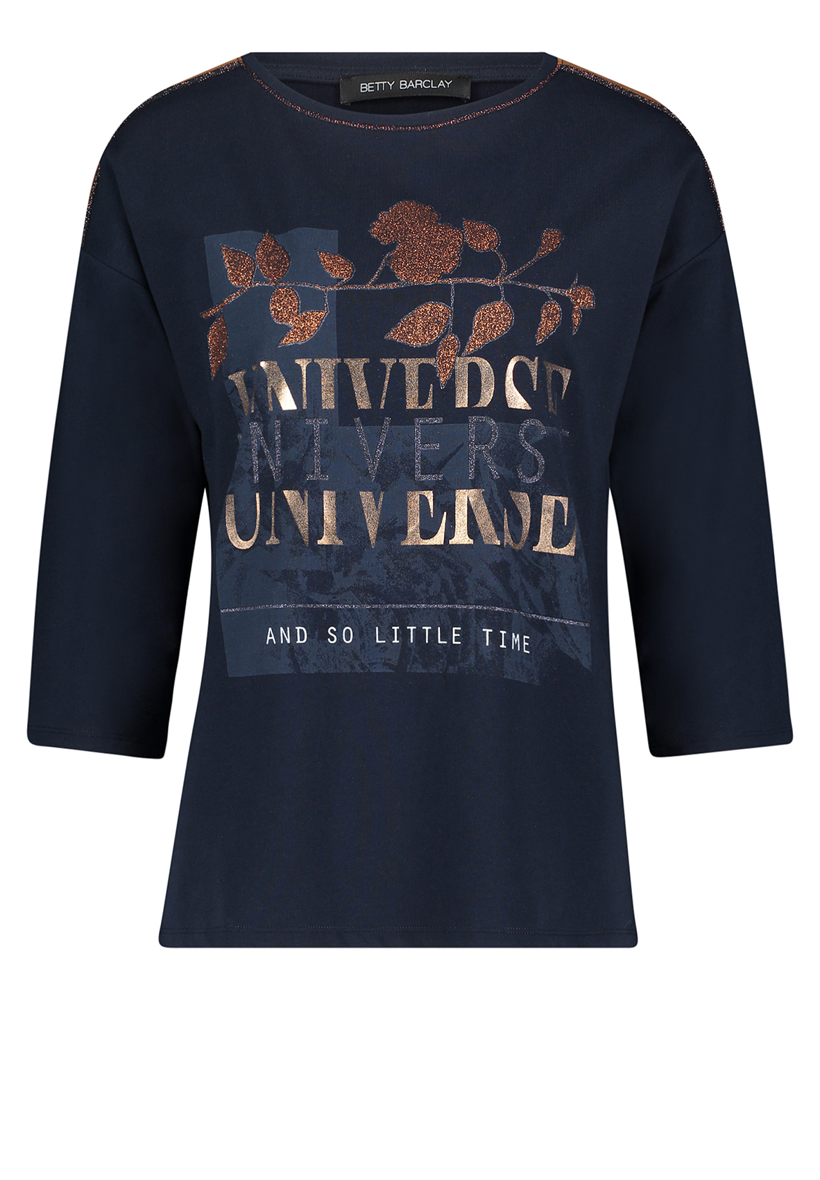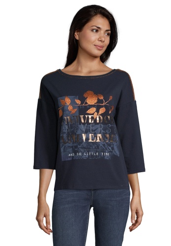 Джемпер с металлизированным принтом - яркий акцент вашего образа. Комфортный прямой покрой, горловины-лодочка, рукава 3/4 со спущенным плечом. Отделка горловины и рукавов с нитью люрекса придает роскошный блеск. Приятный эластичный материал из смеси хлопка и модала.