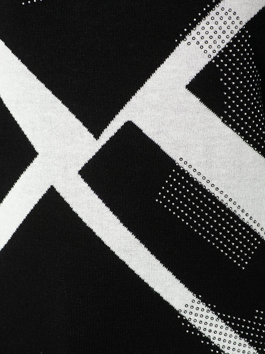 Удлиненный джемпер привлекает внимание своим контрастным геометрическим рисунком. Слегка приталенный силуэт, круглый вырез горловины, втачные рукава полной длины. Декор стразами создает более демократичный образ. Материал из хлопковой смеси приятен к телу и удобен в ношении.