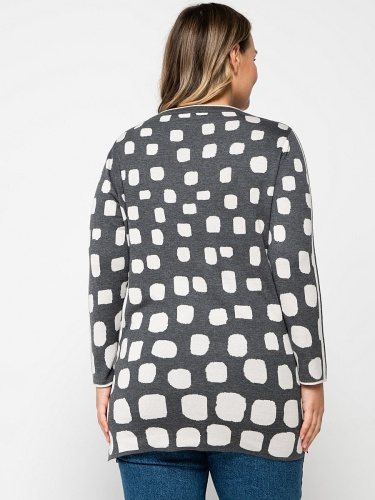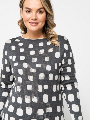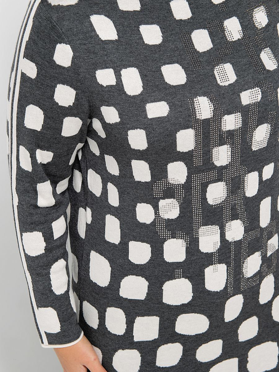 Удлиненный джемпер полуприлегающего силуэта. Вырез горловины "лодочка", втачные рукава полной длины. Абстрактный контрастный принт и декор стразами создают современный образ. Материал из хлопковой смеси приятен к телу и удобен в ношении.
