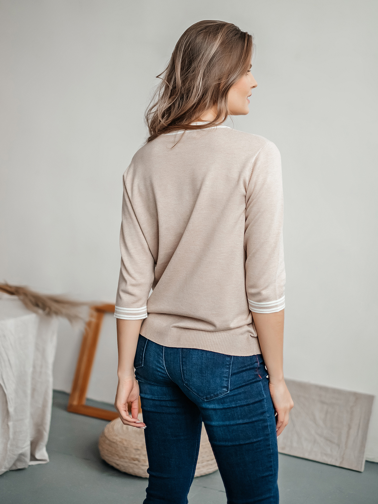 Теплый джемпер в горох - стильный вариант на каждый день. Свободный покрой, круглый вырез горловины и втачные рукава 3/4. Вырез оформлен декоративным элементом в виде банта. Приятный к телу материал из вискозной смеси обеспечивает комфорт.
