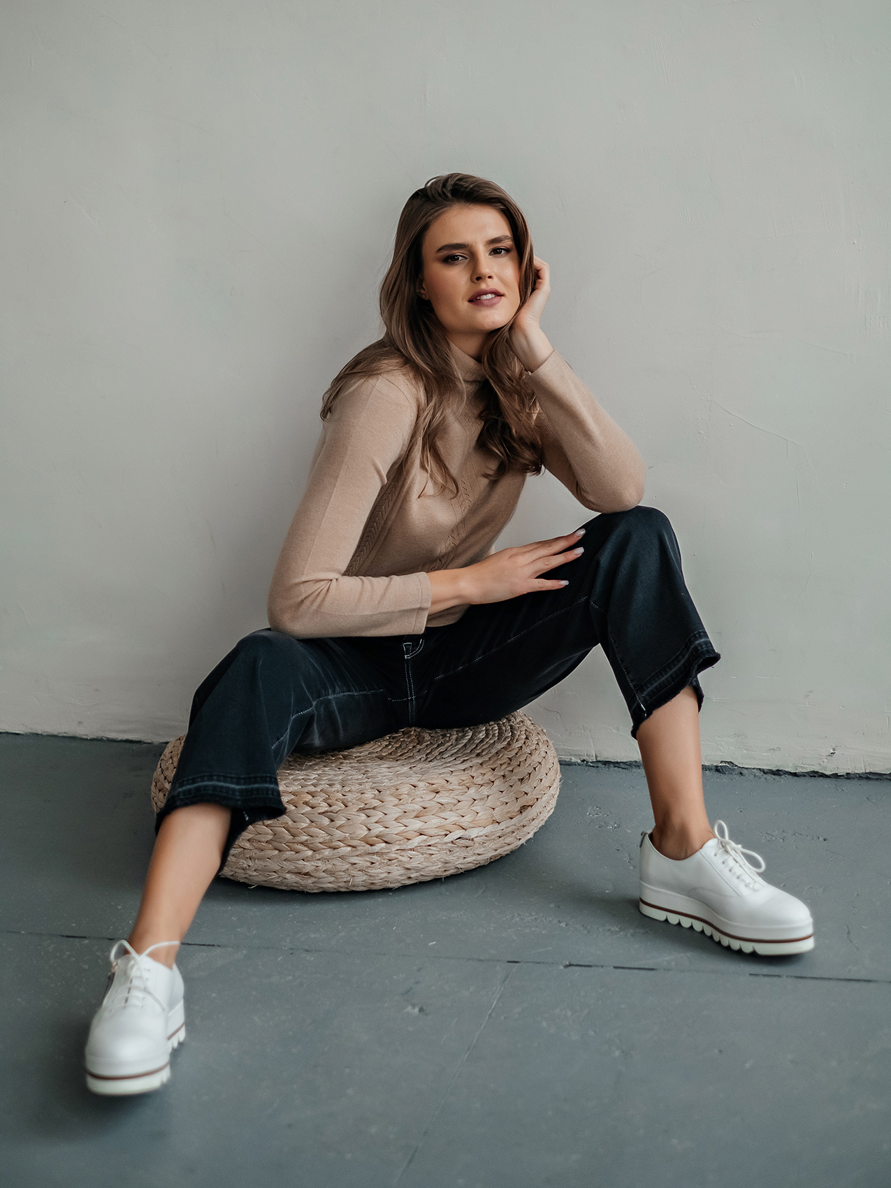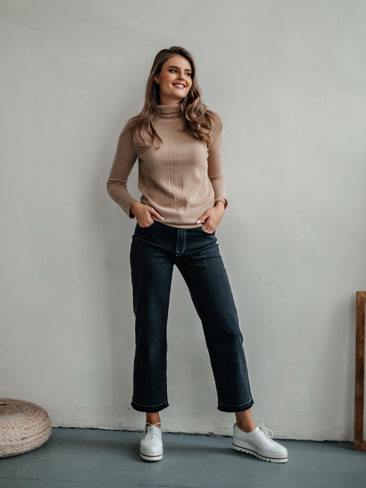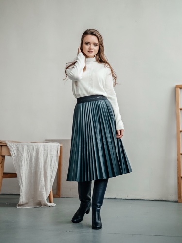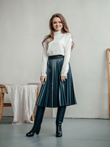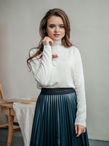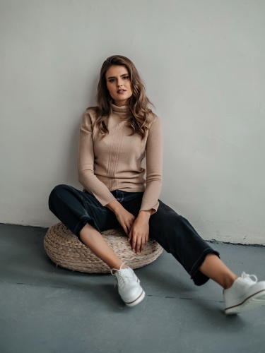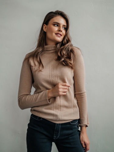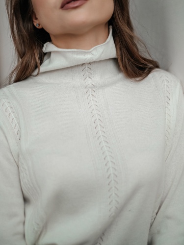Лаконичный джемпер свободного покроя смело можно назвать базовой вещью. Воротник-воронка, рукава полной длины. Особый шарм данной модели придают ажурные элементы машинной вязки. Мягкий смесовый материал из шерсти и кашемира обеспечивает комфорт и сохранение тепла. Этот универсальный джемпер просто великолепен в сочетании как с брюками, так и с юбкой.