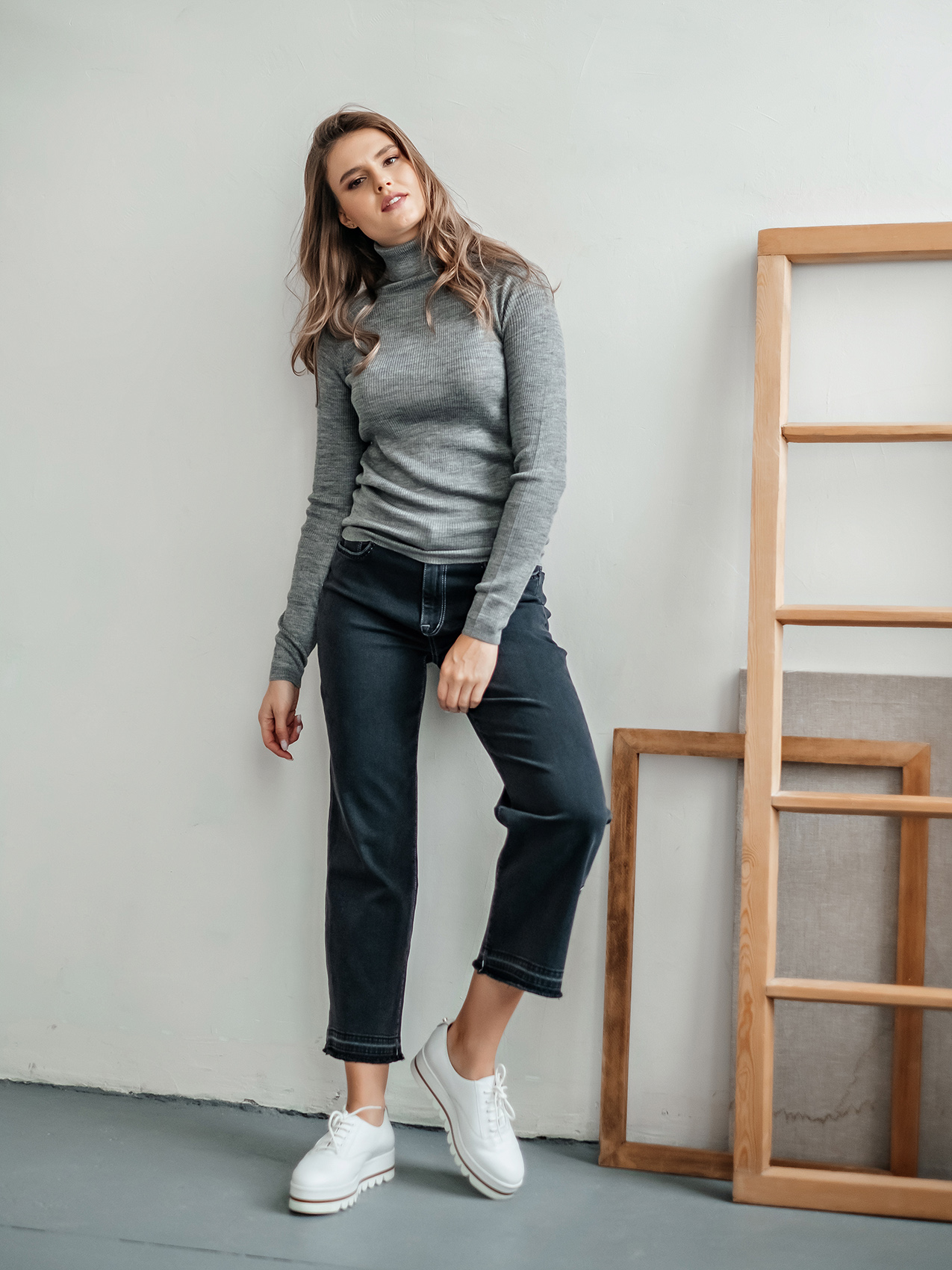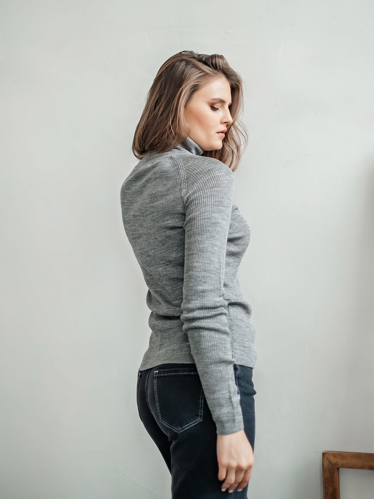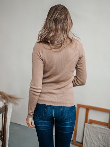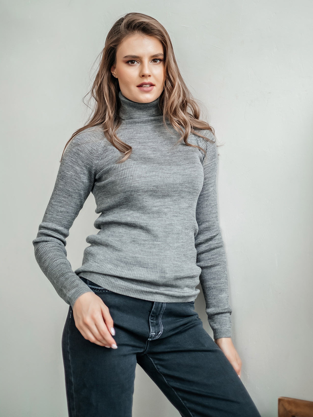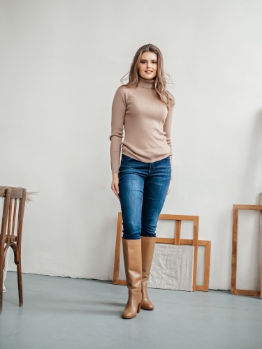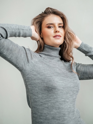 На сайте указаны российские размеры Ткань: смесовая ткань средней плотности. В составе: 45% акрил, 32% тенсель, 23% шерсть. Крой: базовый однотонный джемпер приталенного силуэта в мелкий рубчик. Модель, напоминающая привычную водолазку, выделяется длинным воротом, который защищает от холода и ветра. Универсальная модель с шерстью в составе идеальный вариант для зимы и межсезонья. Джемпер представлен в трех стильных оттенках – сером, бежевом и темно-синем. Отделка: ткань в мелкий рубчик прекрасна в своей простоте. Базовый компаньон для джинсов, брюк, джемперов, сарафанов, юбок и рубашек.