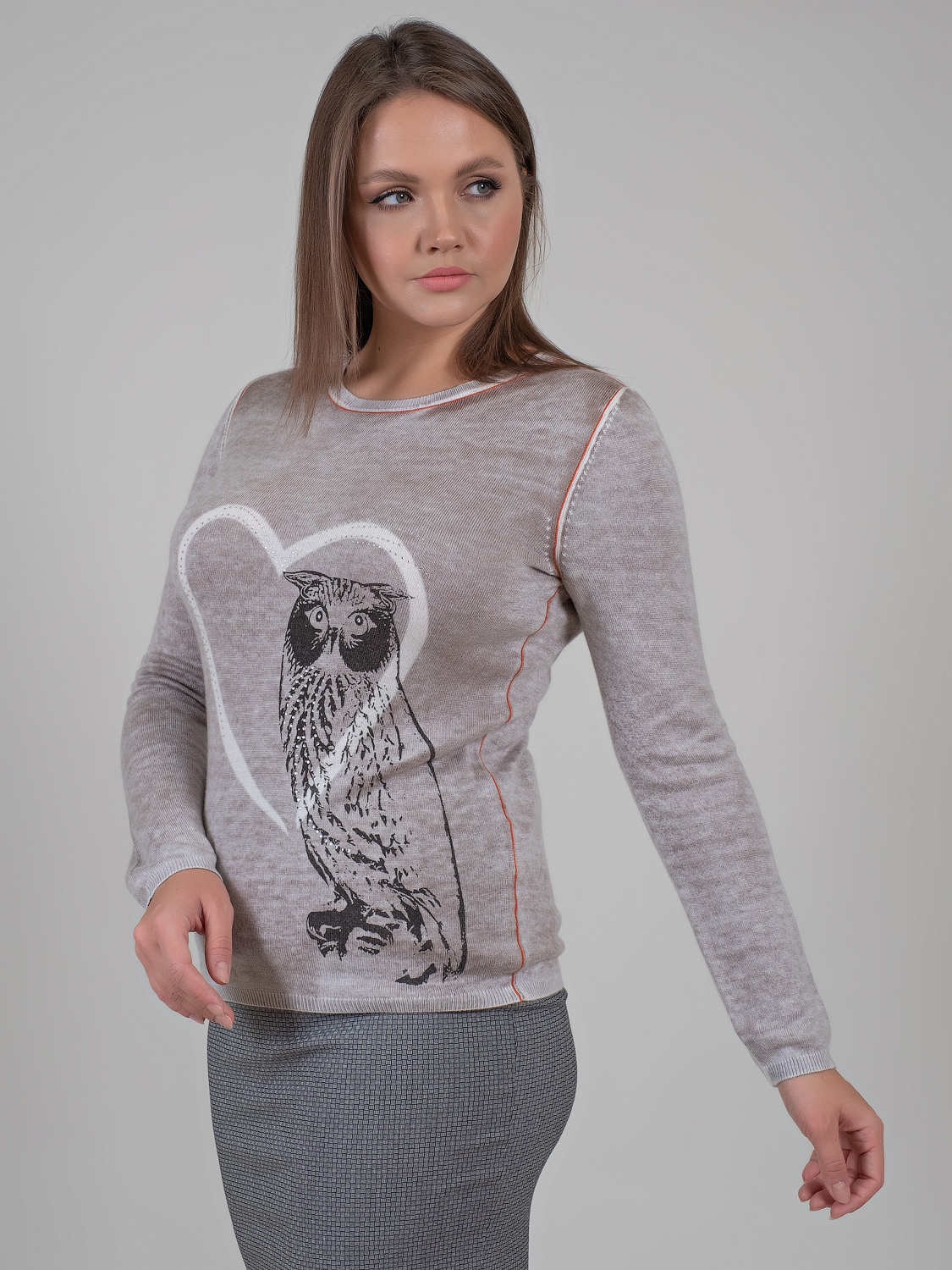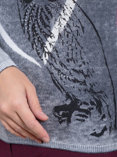 Мягкий джемпер с изображением совы и стразами может стать частью современного образа. Овальная горловина, вточной рукав полной длины.
