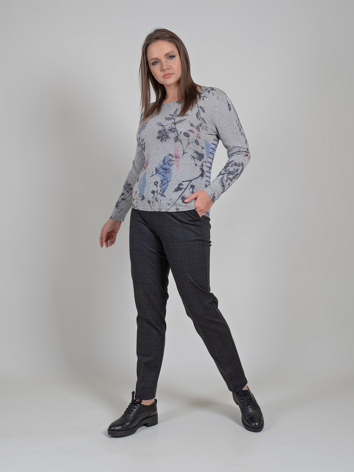 На сайте указаны российские размеры. Ткань: комфортный телу смесовый материал. В составе: 60% вискоза, 40% хлопок. Крой: слегка приталенный джемпер с длинным рукавом и круглым вырезом. Прикрывает зону живота, подчеркивает достоинства фигуры. Легкий, но при этом теплый трикотаж с хлопком и вискозой дарит комфорт. Отделка: оригинальный принт в природном стиле освежает образ и приближает наступление тепла даже в разгар холодов. Сочетайте с брюками, джинсами и юбками из ассортимента Stern.