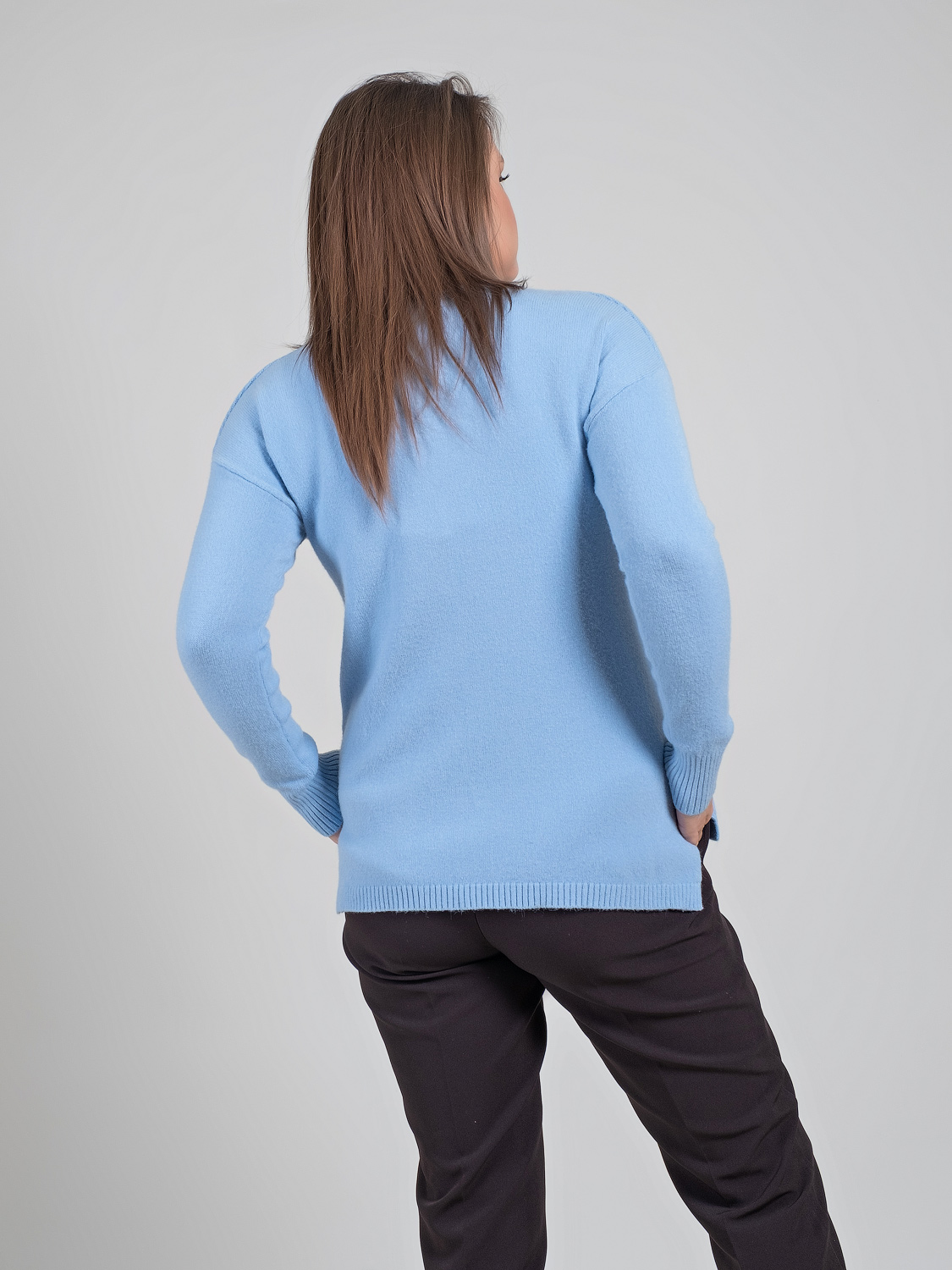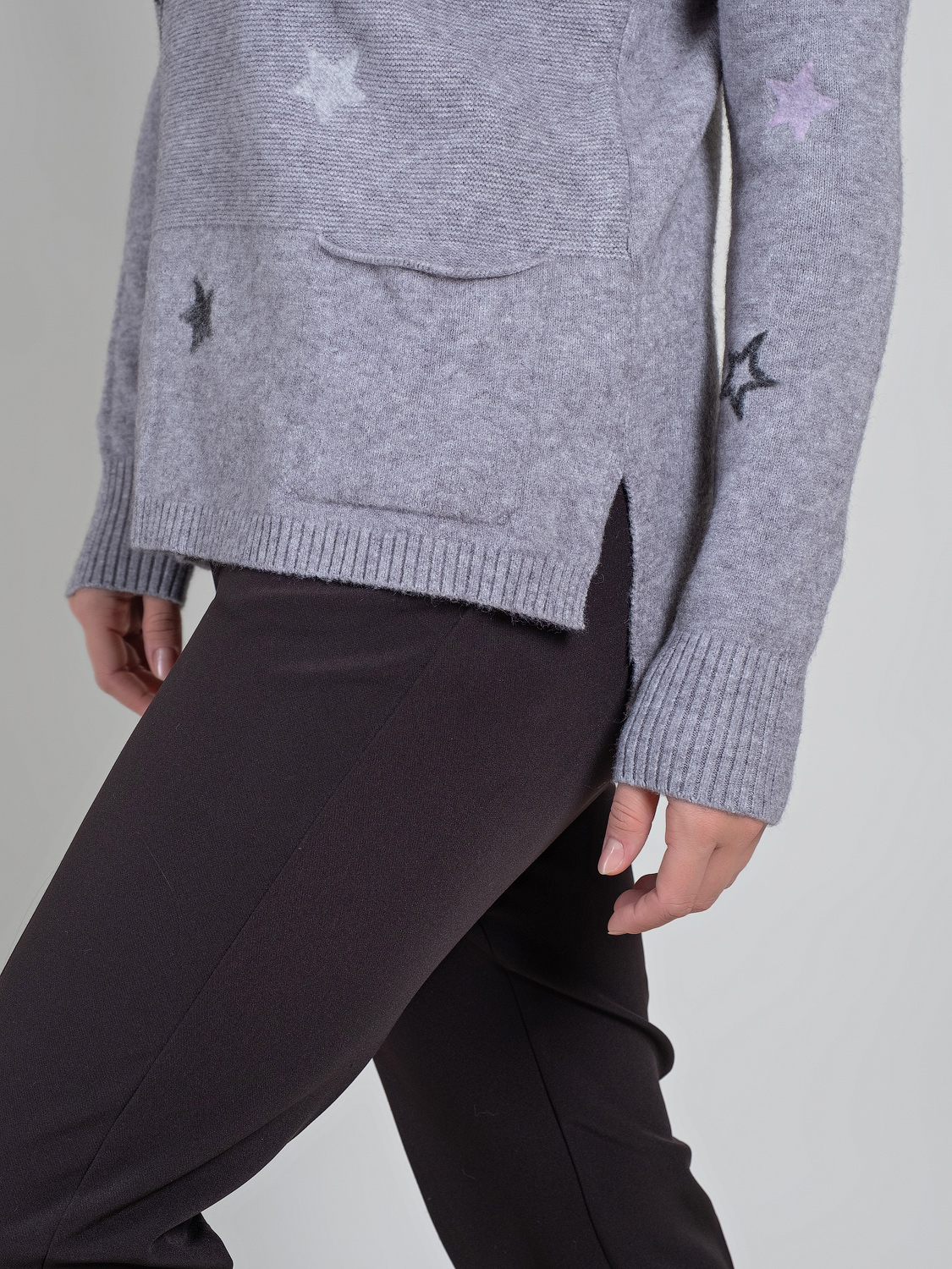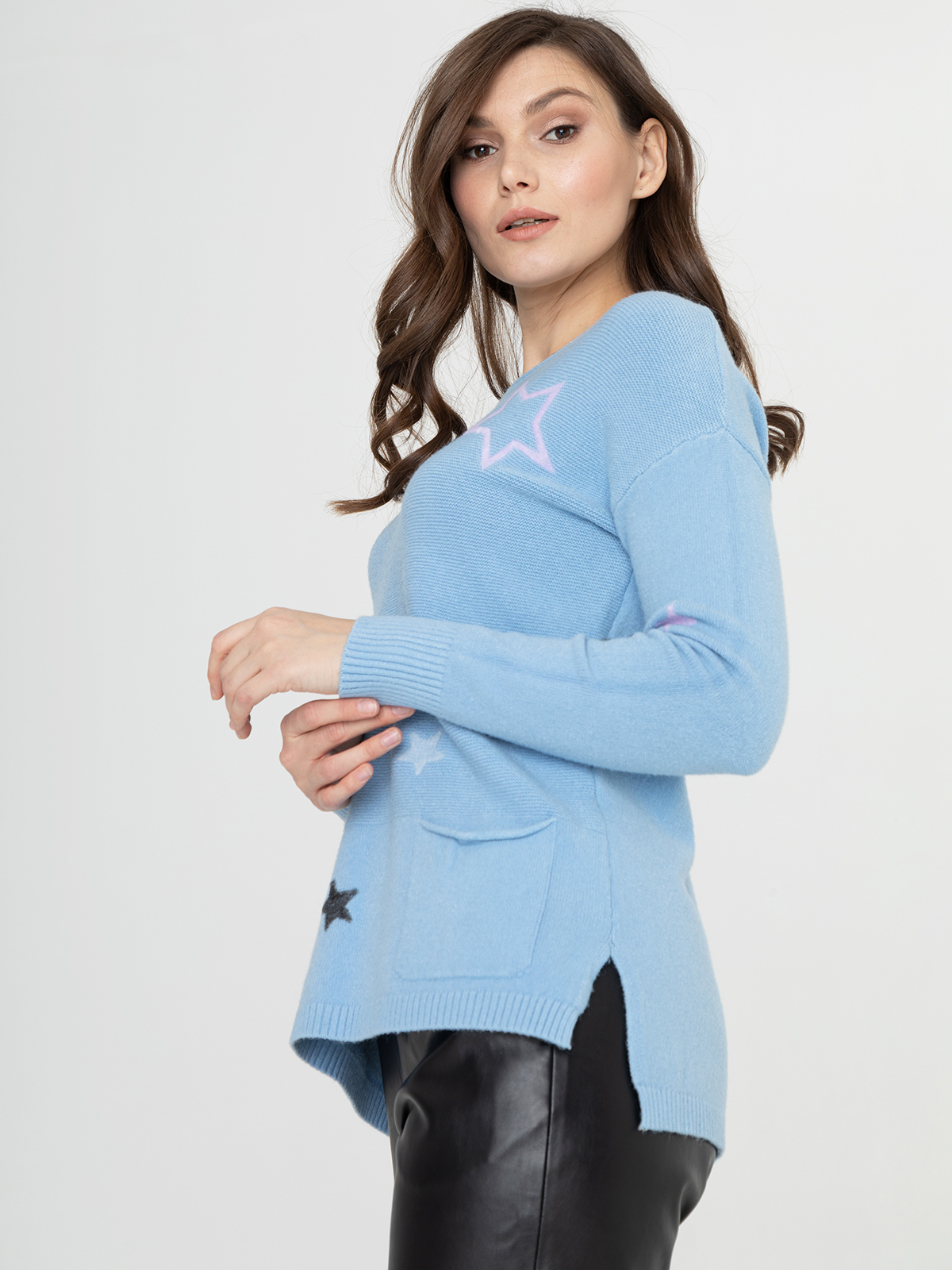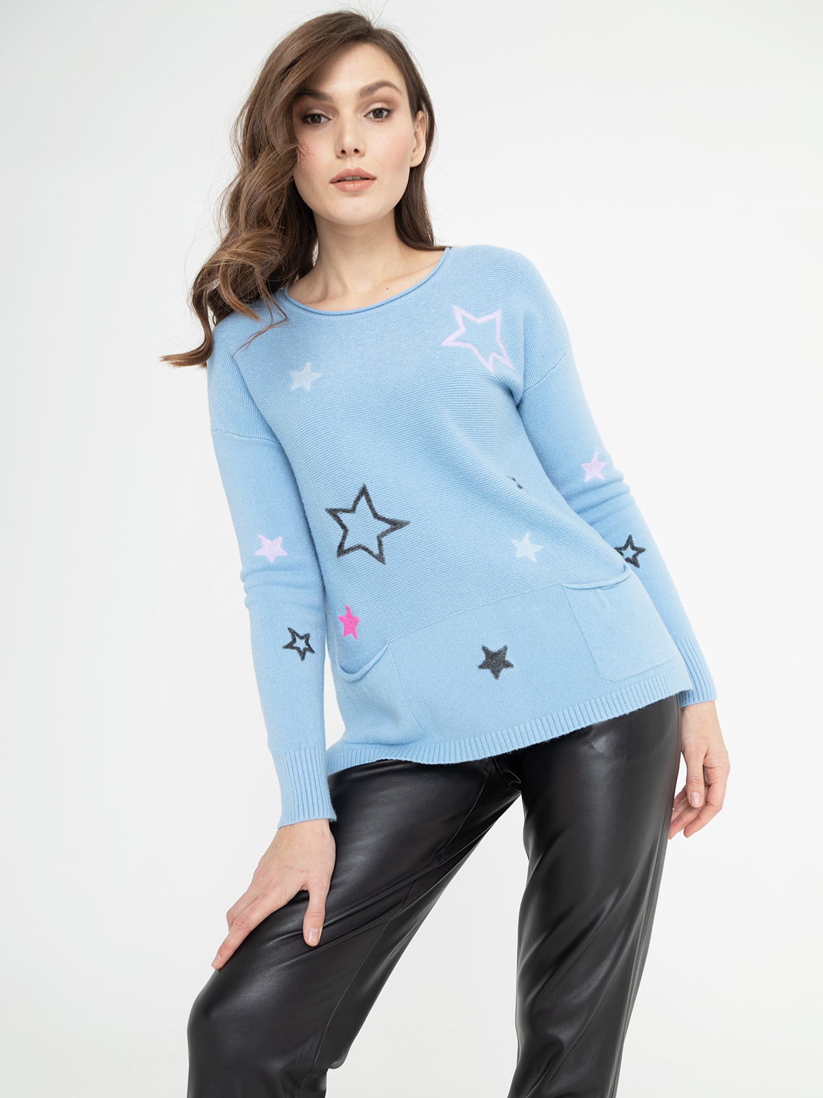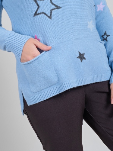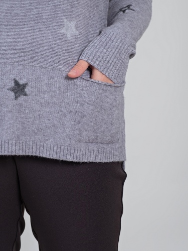 В мягком джемпер будет тепло и уютно холодной зимой. Оригинальный звездный принт придаст неформальность образу.Овальная горловина, втачной рукав полной длины со спущенным плечом, удлиненная спинка. Спереди имеется два накладных кармана.