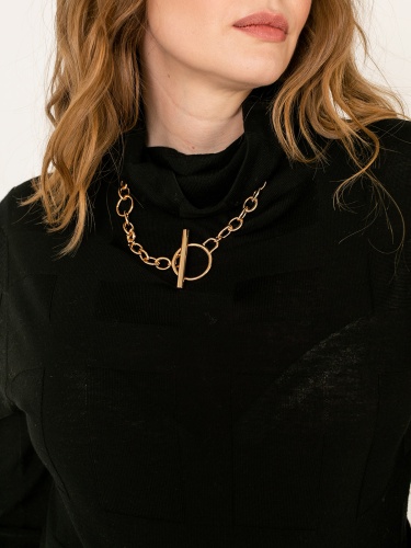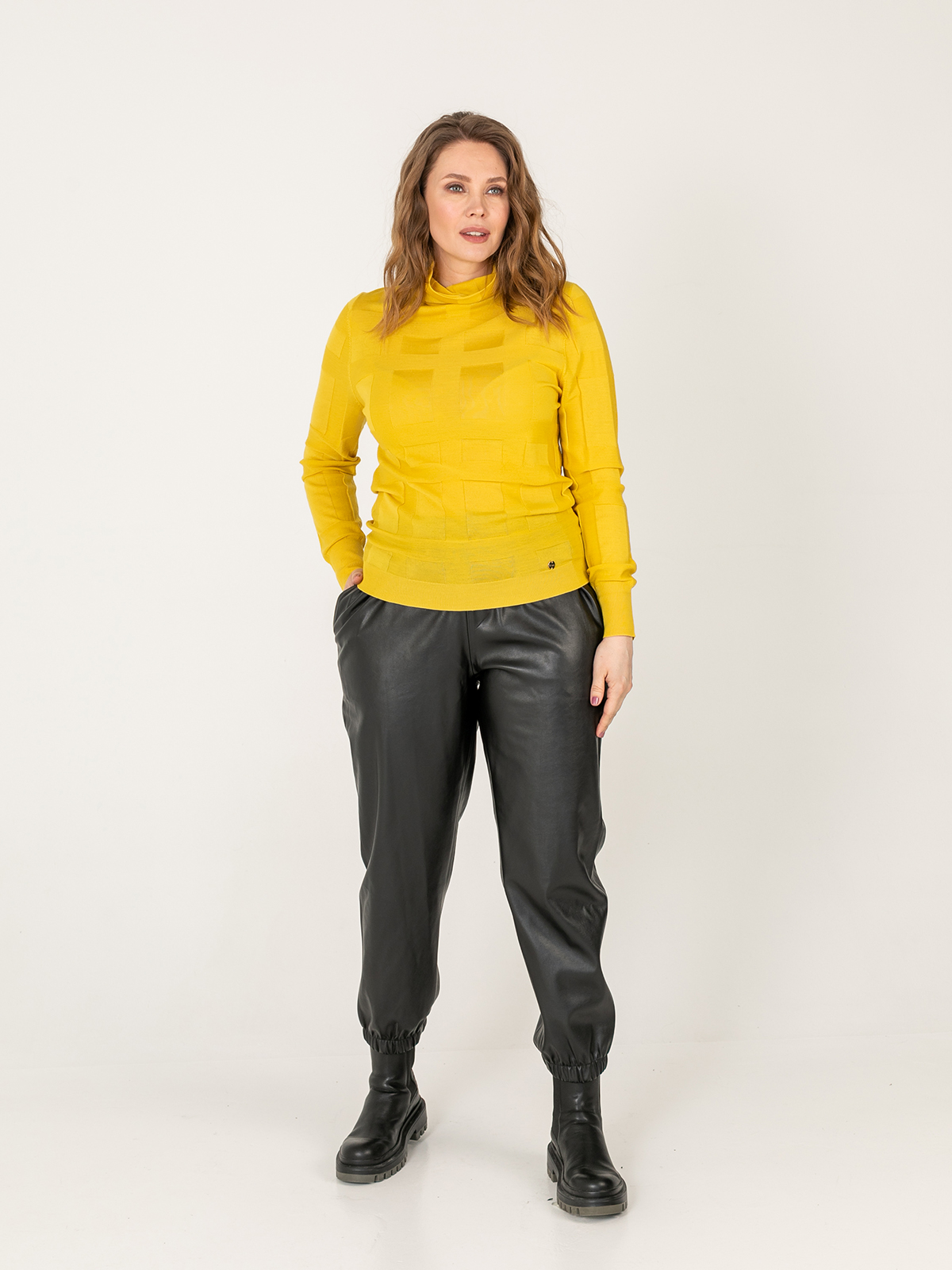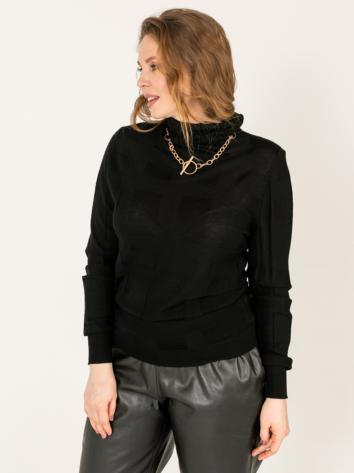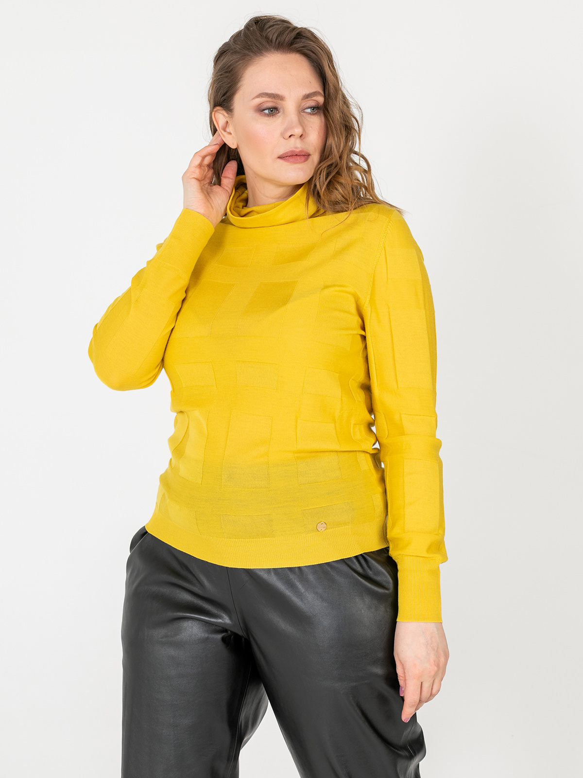 Однотонная водолазка – базовый элемент гардероба любой женщины. Геометрическая фактура задает динамику образу. Материал из натуральной шерсти. Втачной рукав полной длины, ворот-хомут.