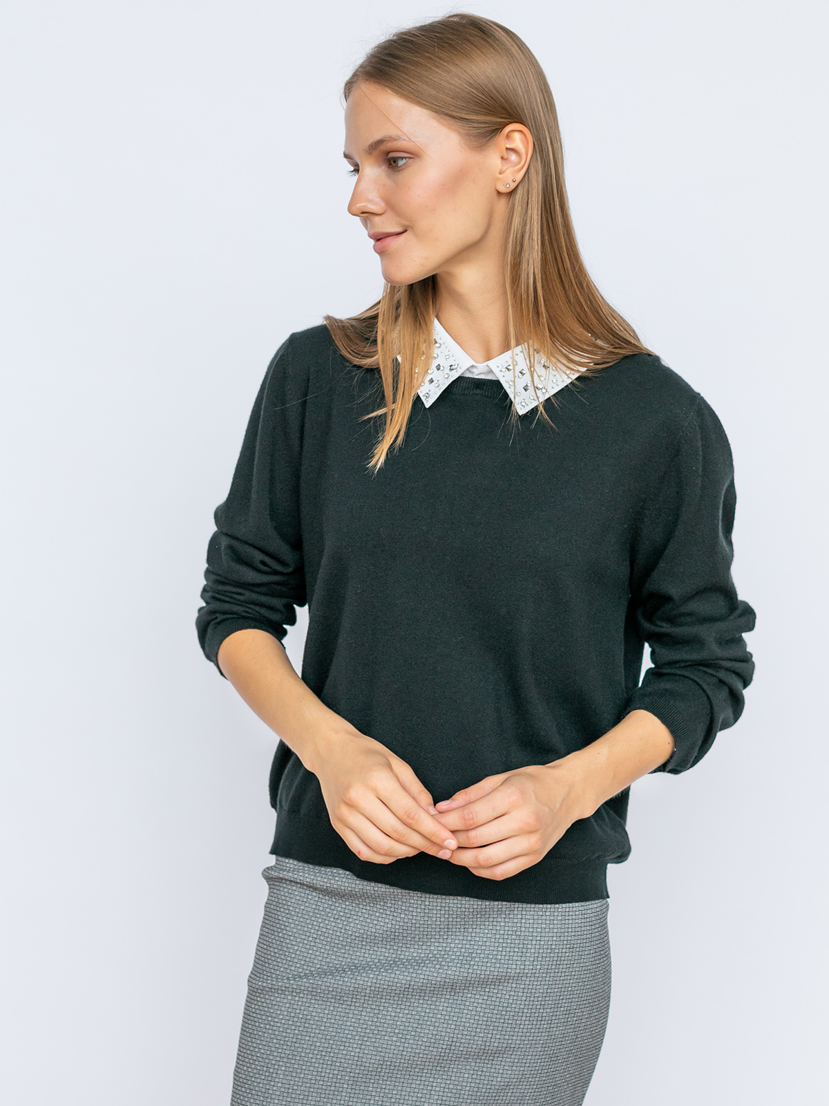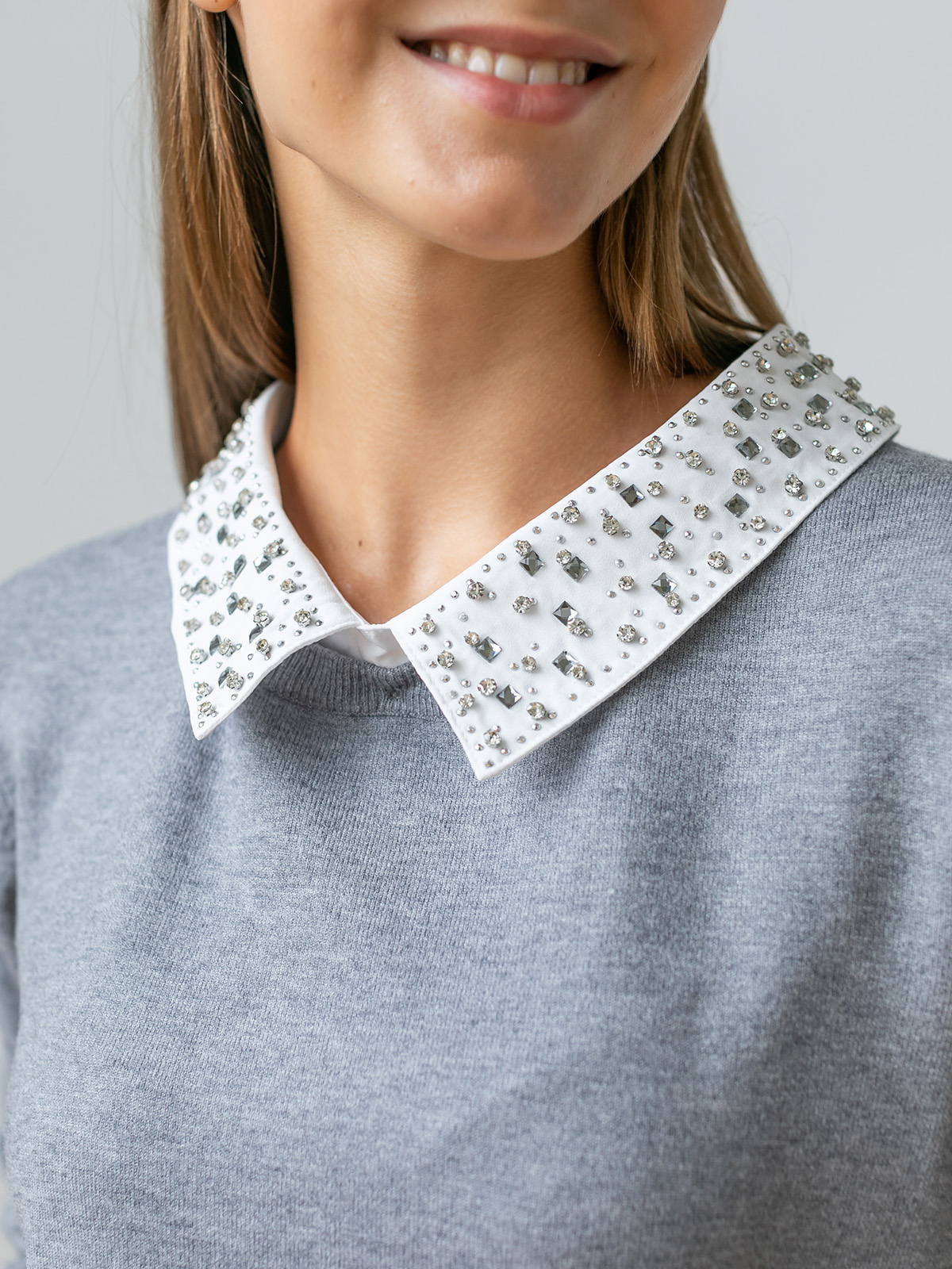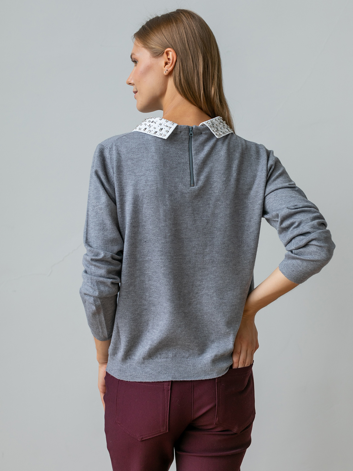 Джемпер с имитацией модели-двойки – элегантный вариант верха для образа в деловом стиле. Свободный крой подходит для фигур разного типа. Длинный втачной рукав с эластичной манжетой. Функциональный акцент в виде замка-молнии на спинке. Белый отложной воротничок декорирован стразами. Джемпер хорошо сочетается как с юбкой, так и с брюками.