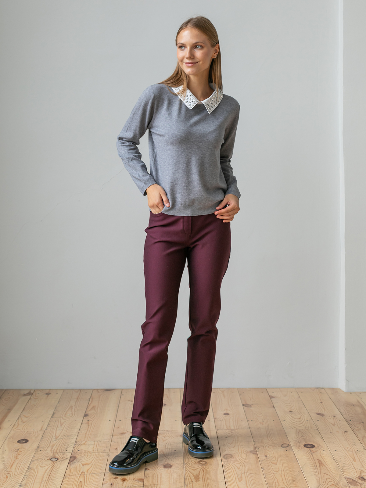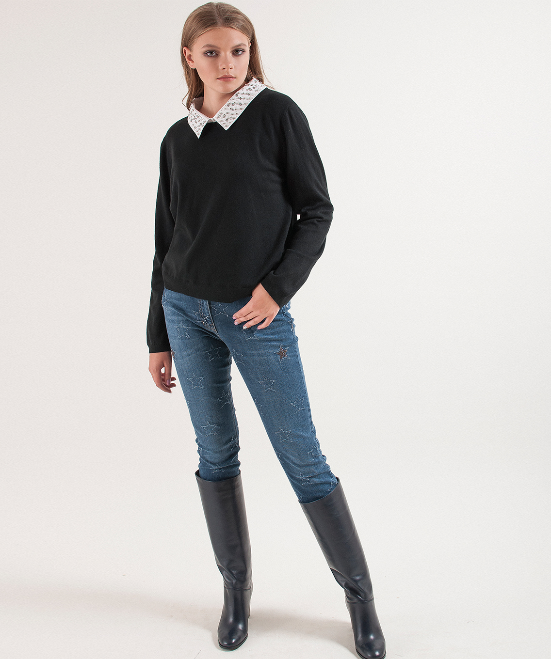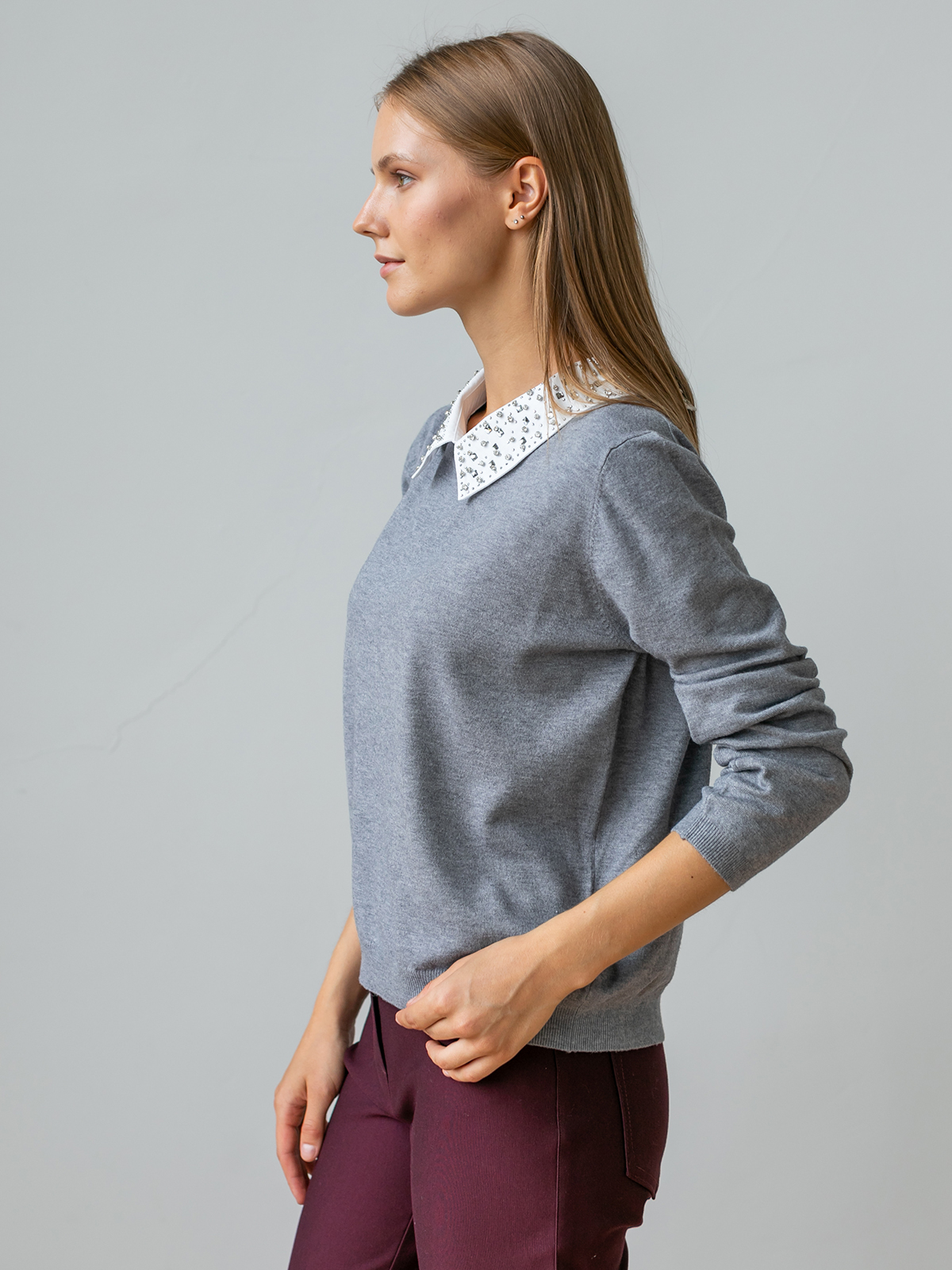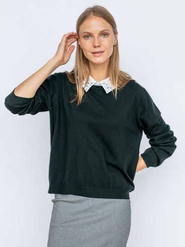 Джемпер с имитацией модели-двойки – элегантный вариант верха для образа в деловом стиле. Свободный крой подходит для фигур разного типа. Длинный втачной рукав с эластичной манжетой. Функциональный акцент в виде замка-молнии на спинке. Белый отложной воротничок декорирован стразами. Джемпер хорошо сочетается как с юбкой, так и с брюками.