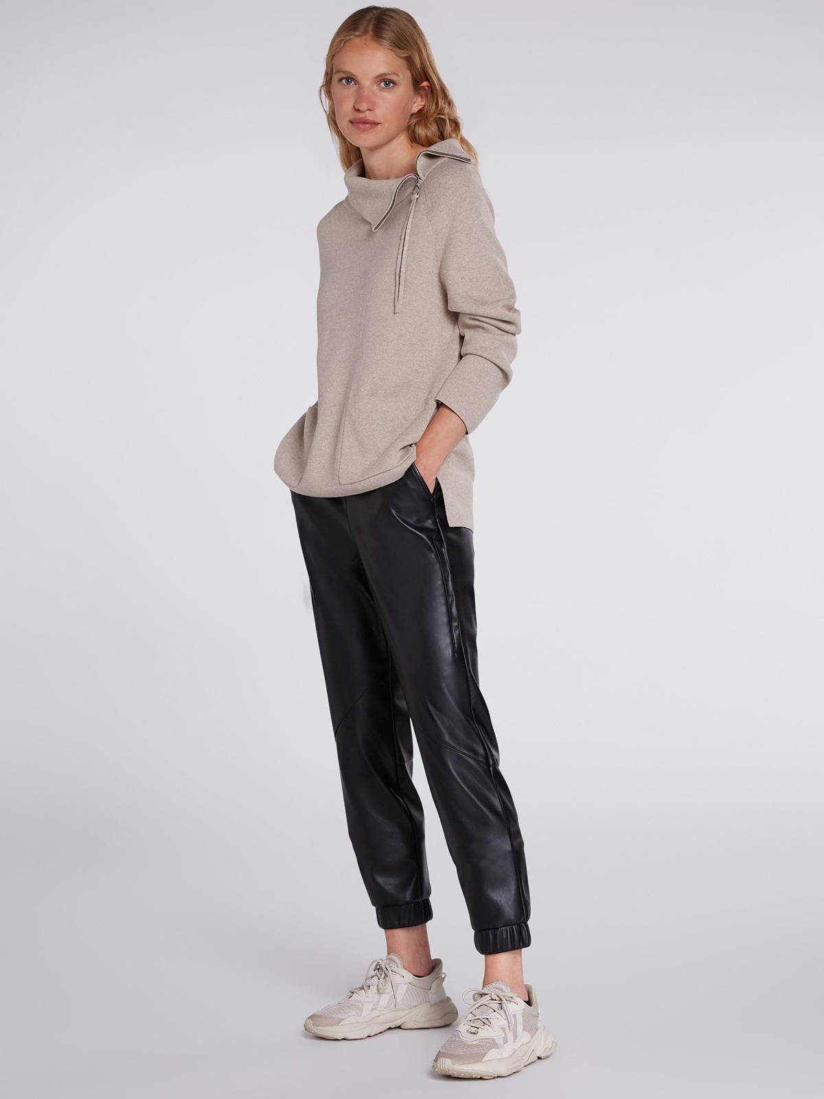 Бежевый джемпер с воротником-стойкой на молнии. Прямой покрой, разрезы сбоку, удлиненная спинка изделия. Два накладных кармана спереди. Приятный трикотаж из смесового хлопка приятен к телу и обеспечивает комфортное ношение. Длина 60 см для размера 42. Рост модели 178 см, ее размер – 42 (российский).
