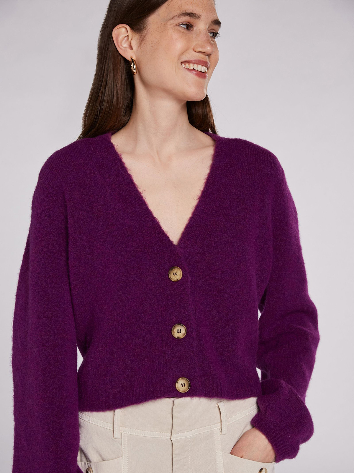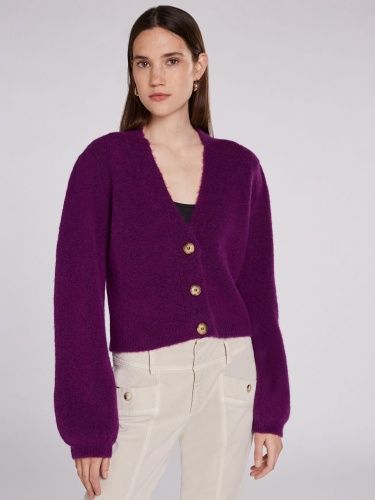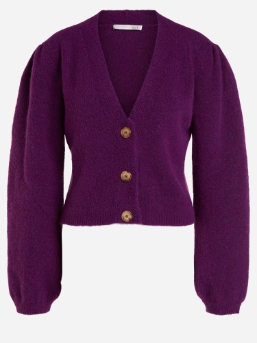 Кардиган насыщенного фиолетового оттенка с V-образным вырезом и контрастными пуговицами. Рыкава епископа – широкие рукава, стянутые у запястья – стильный атрибут данной модели. Материал из смесовой шерсти мягок и приятен к телу. Длина 50 см для размера 42. Рост модели 178 см, ее размер – 42 (российский).