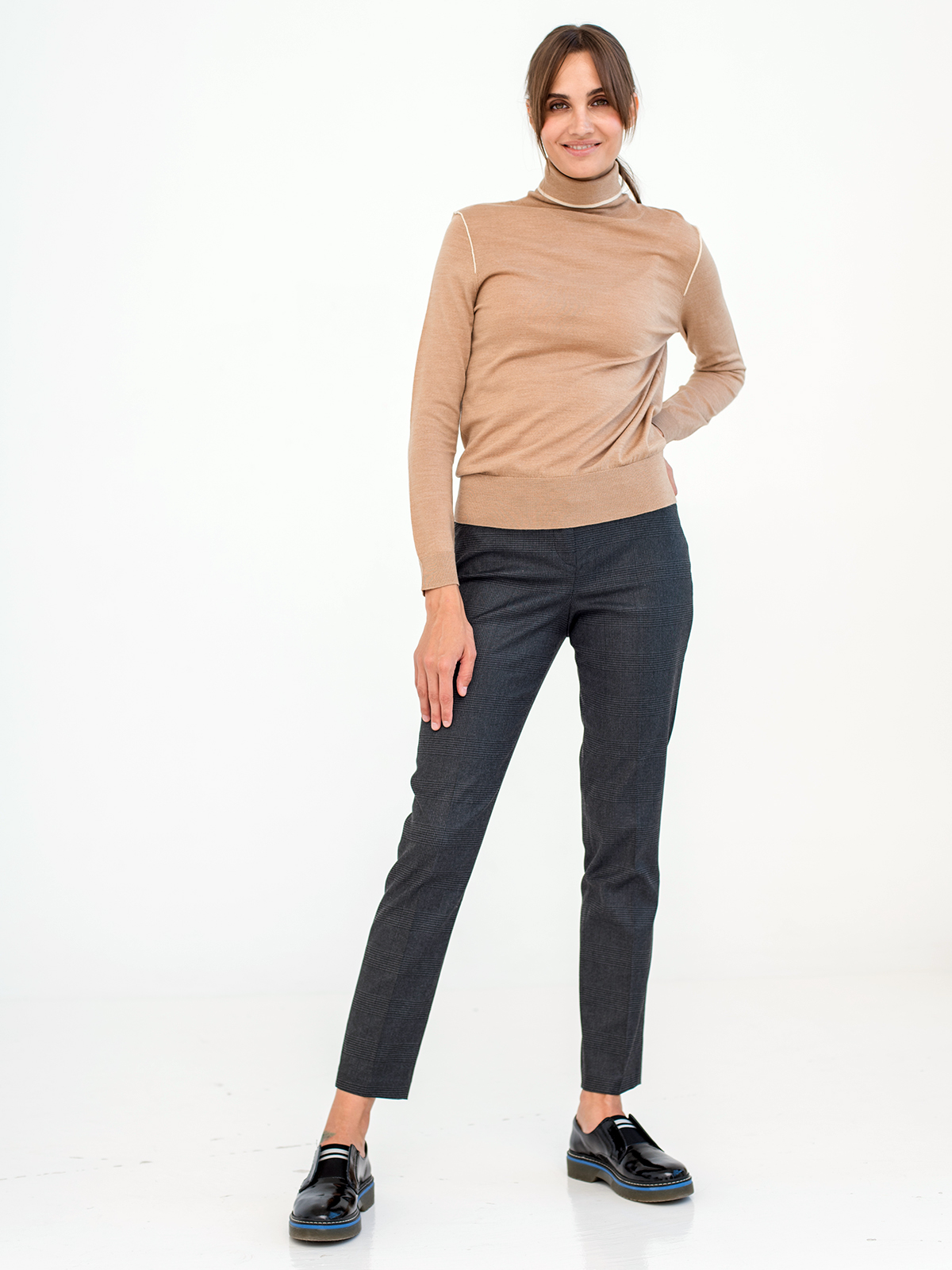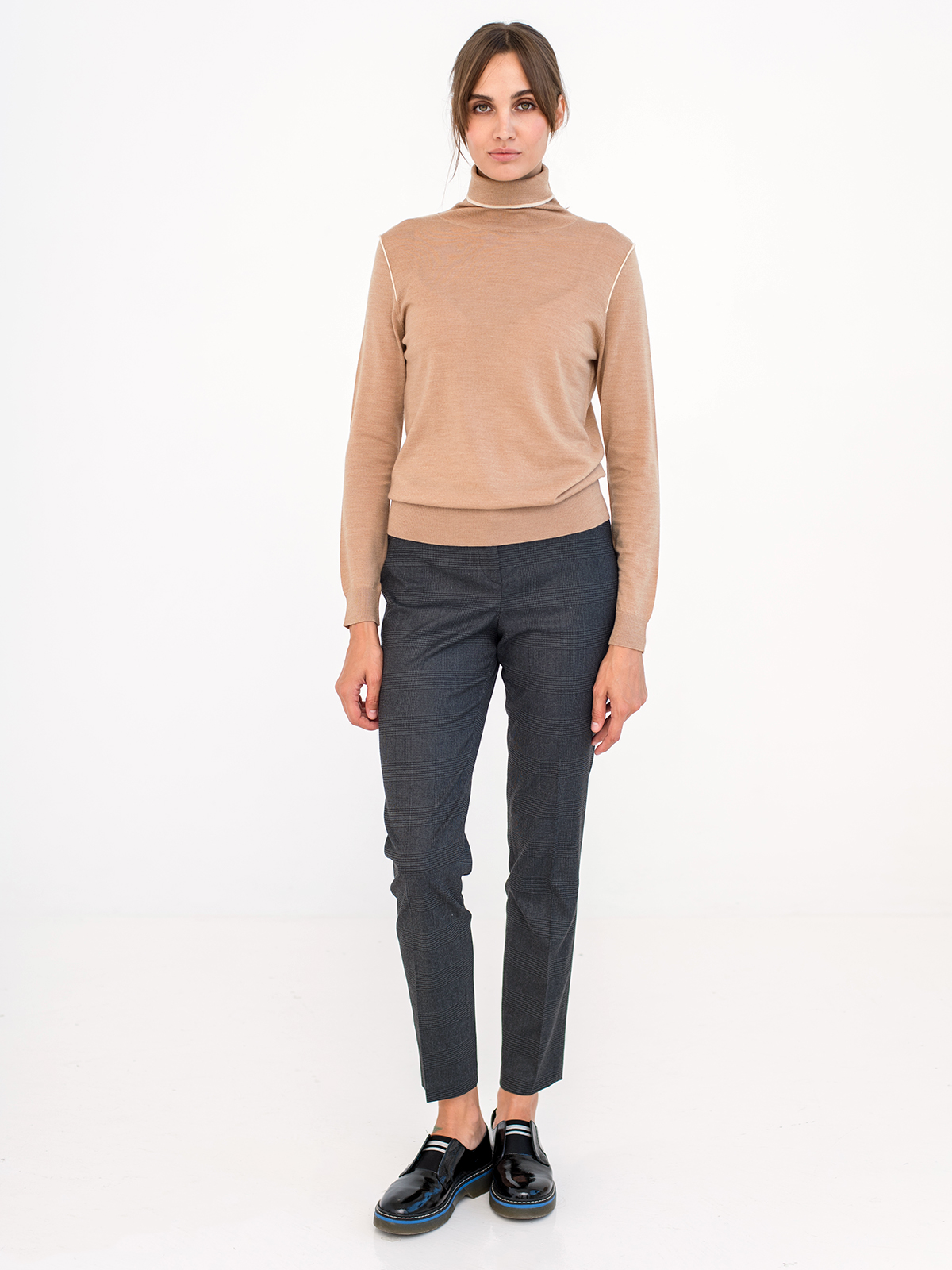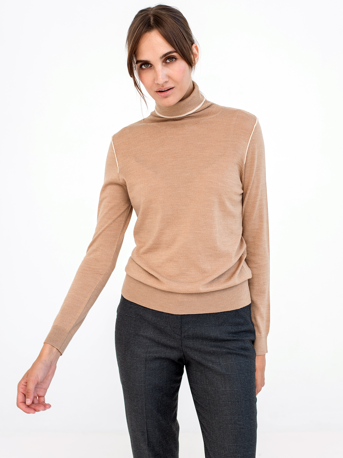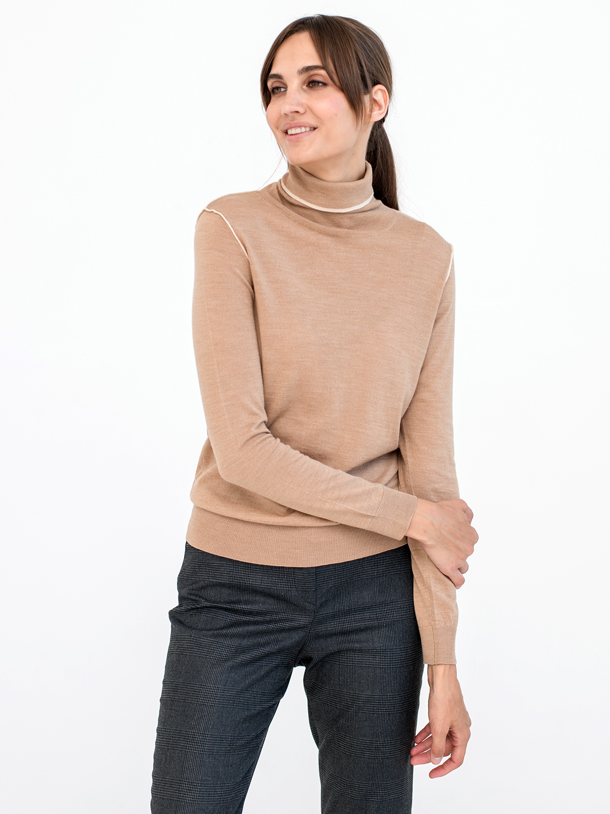 Однотонный базовый джемпер-водолазка в нюдовой расцветке. Прямой крой подходит для любого типа фигуры. Акценты в виде контрастной ленты по краю воротника и на плечах. Длинные рукава с манжетами в рубчик. Джемпер может выступать в качестве самостоятельного верха или надеваться под жакет или блейзер.