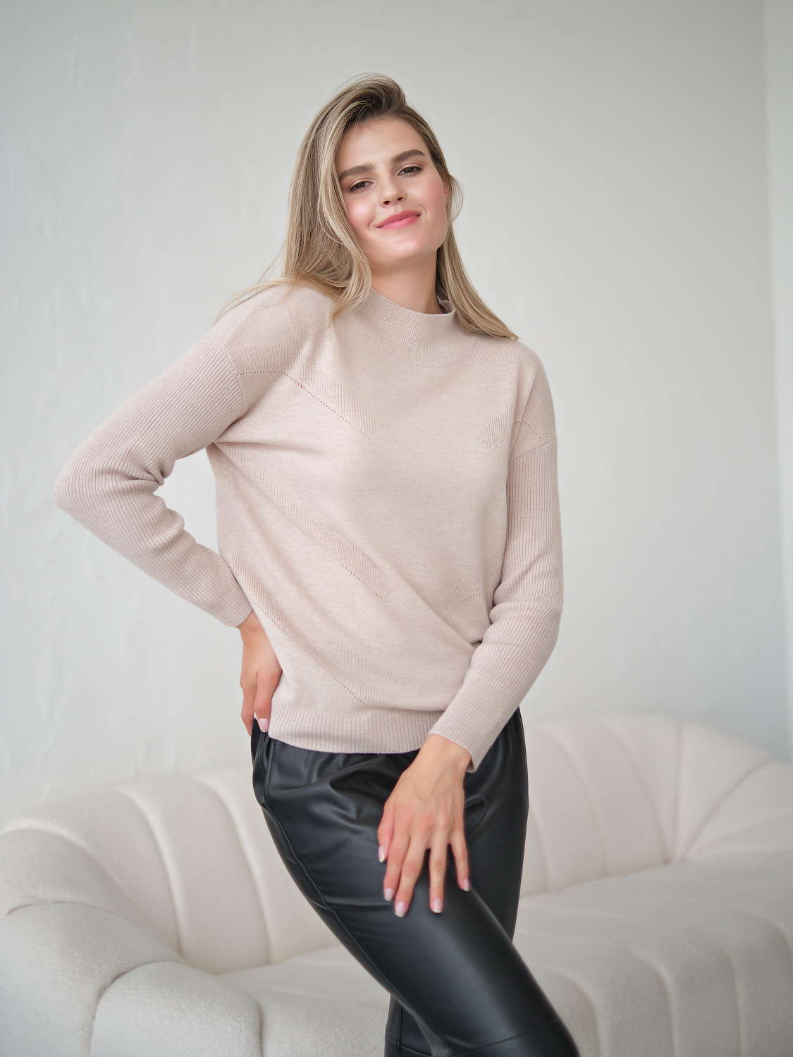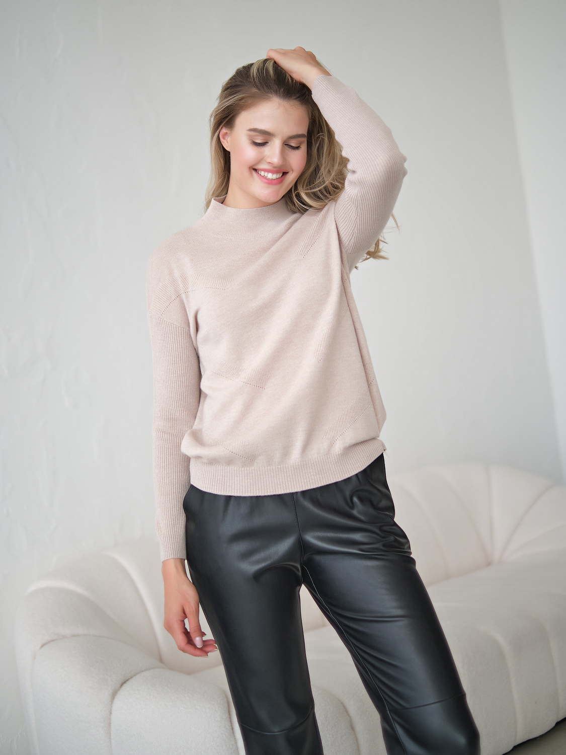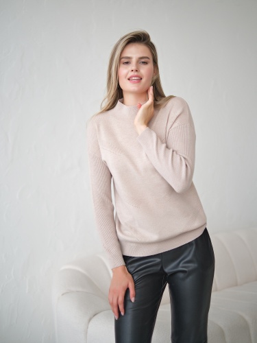 Однотонный джемпер из 100% шерсти – базовый вариант верха для холодного времени года. Джемпер может выступать как самостоятельный верх или надеваться под жакет или блейзер. Свободный силуэт подходит любому типу фигуры. Длинные рукава в рубчик, спущенная линия плеч, воротник-стойка.
