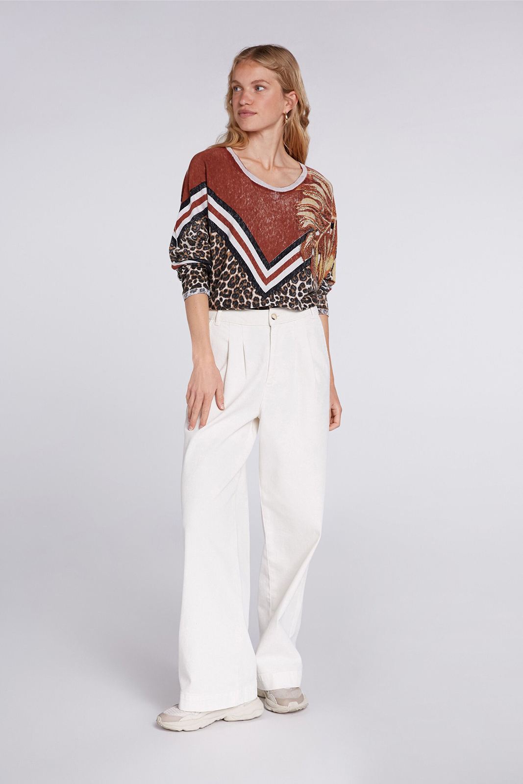 Джемпер свободного силуэта с анималистичным дизайном. Широкий овальный вырез горловины, спущенная линия плеч. Длина 62 см для 42 российского размера. Рост модели 178 см, ее размер - 42.