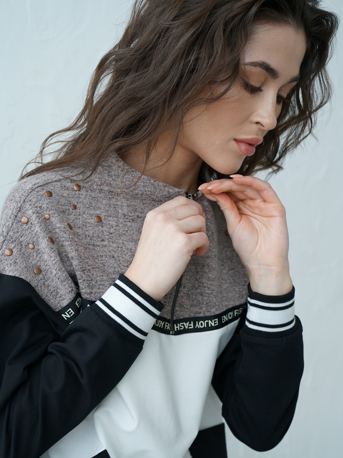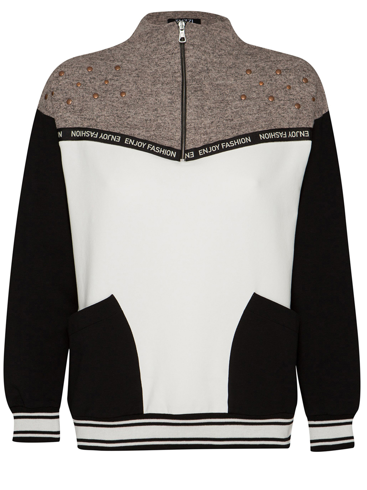 Джемпер в спортивном стиле выполнен из смесового хлопка. Высокий воротник-стойка на молнии, свободный силуэт, спущенная линия плеч. Длинные втачные рукава с эластичными манжетами. Контрастные накладные карманы.