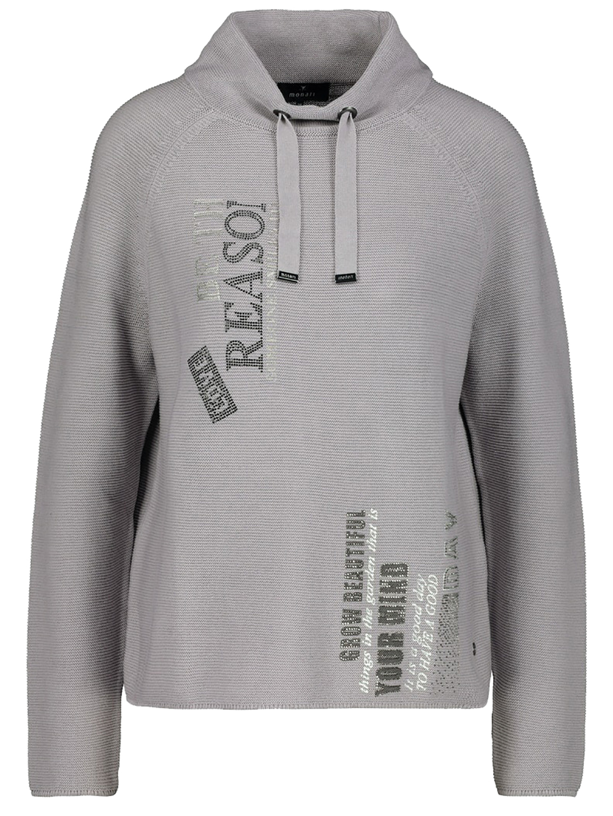 Однотонный свитшот в рубчик прямого кроя. Воротник-стойка с кулиской и широким шнурком в тон изделия. Длинные рукава-реглан