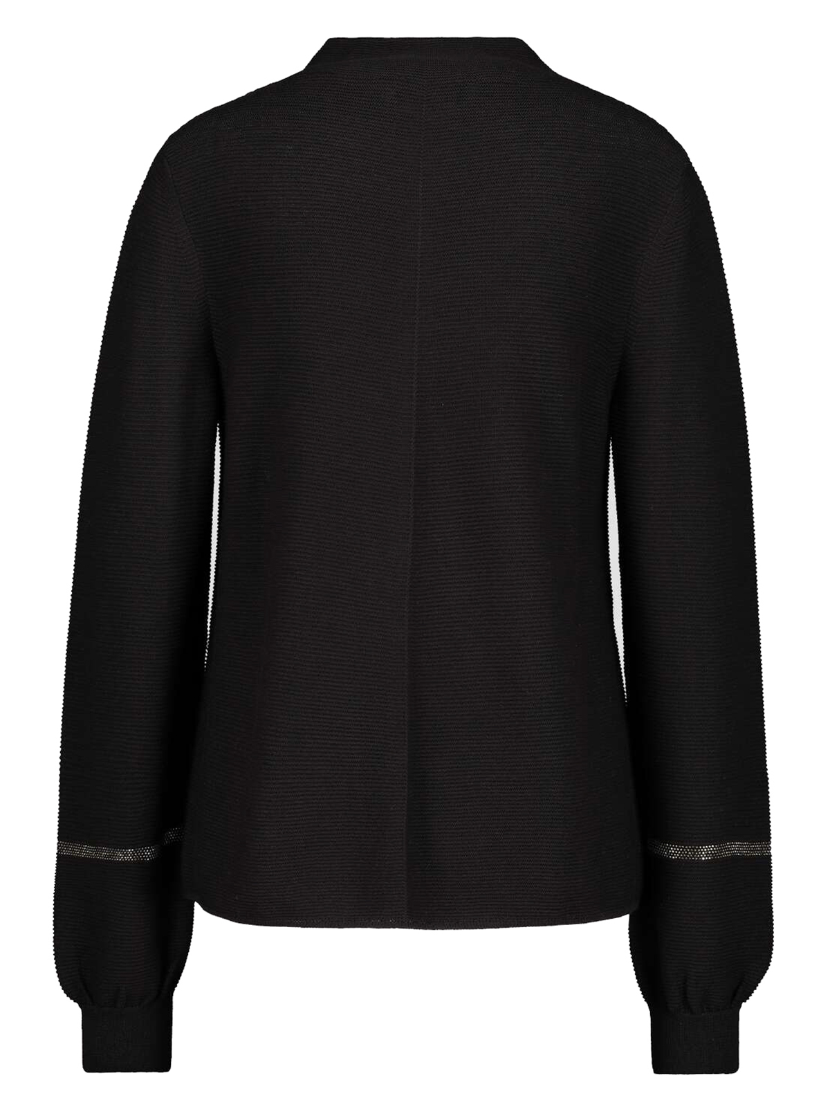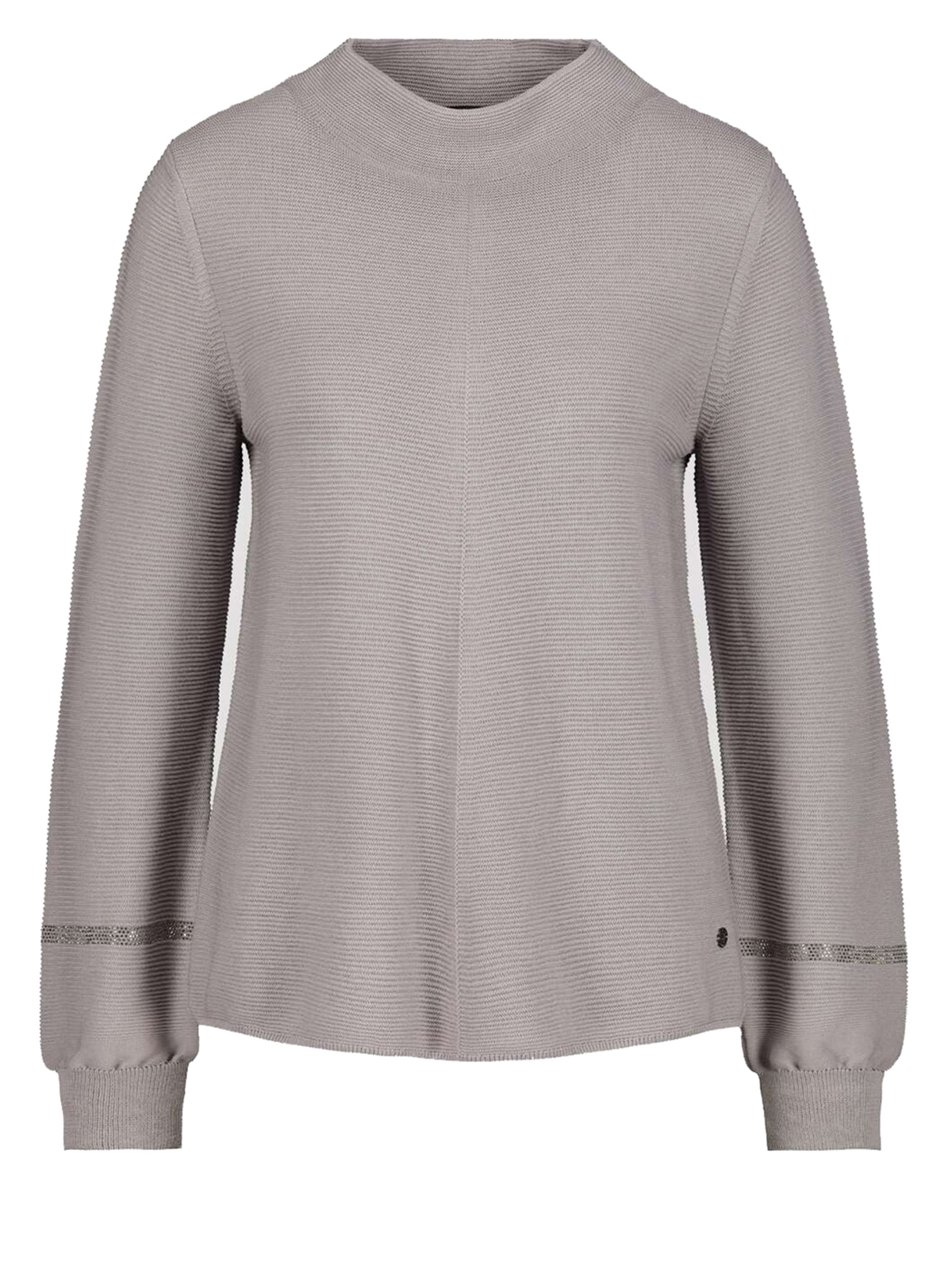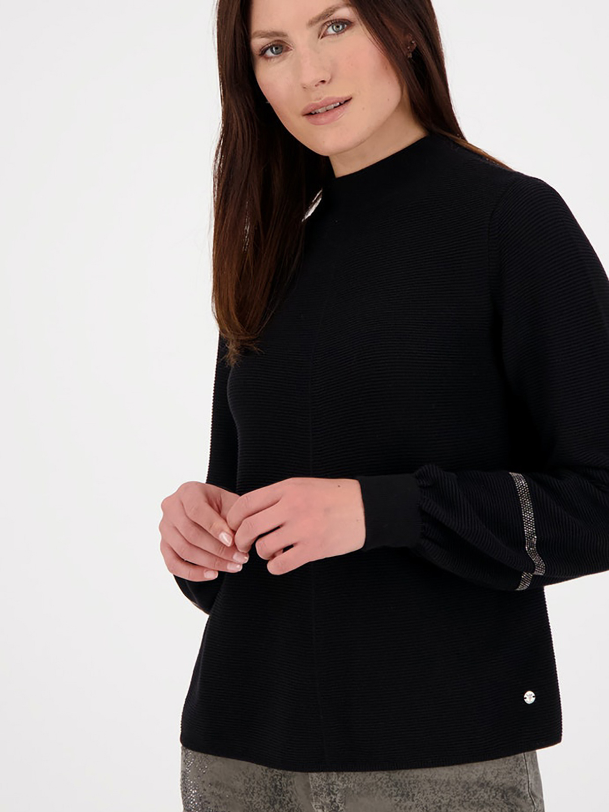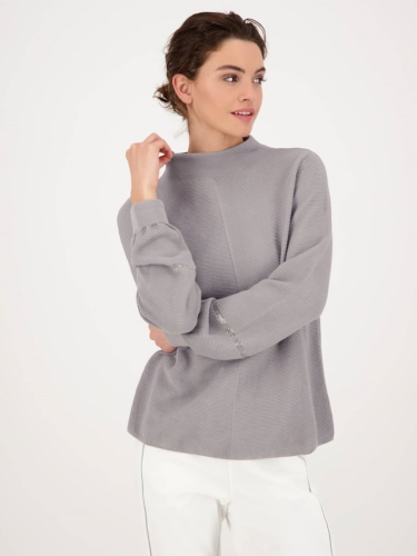 Однотонный джемпер в рубчик со швом по центру. Прямой крой, свободный силуэт, широкий воротник-стойка. Длинные втачные рукава с манжетами. В качестве декора серебристая лента на рукаве.