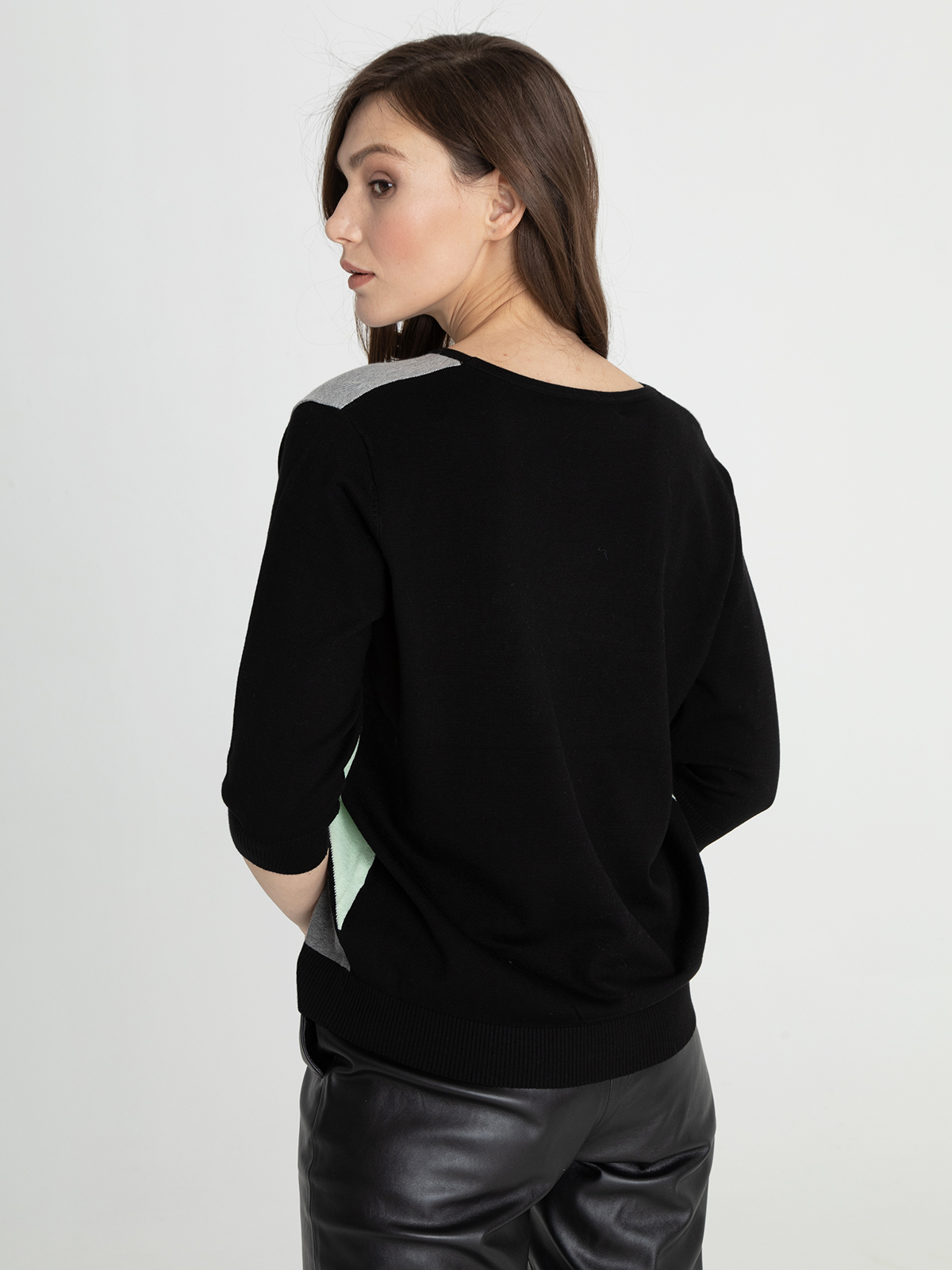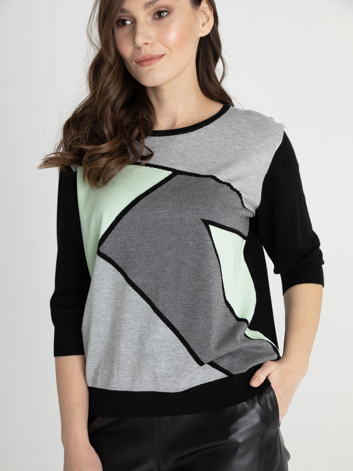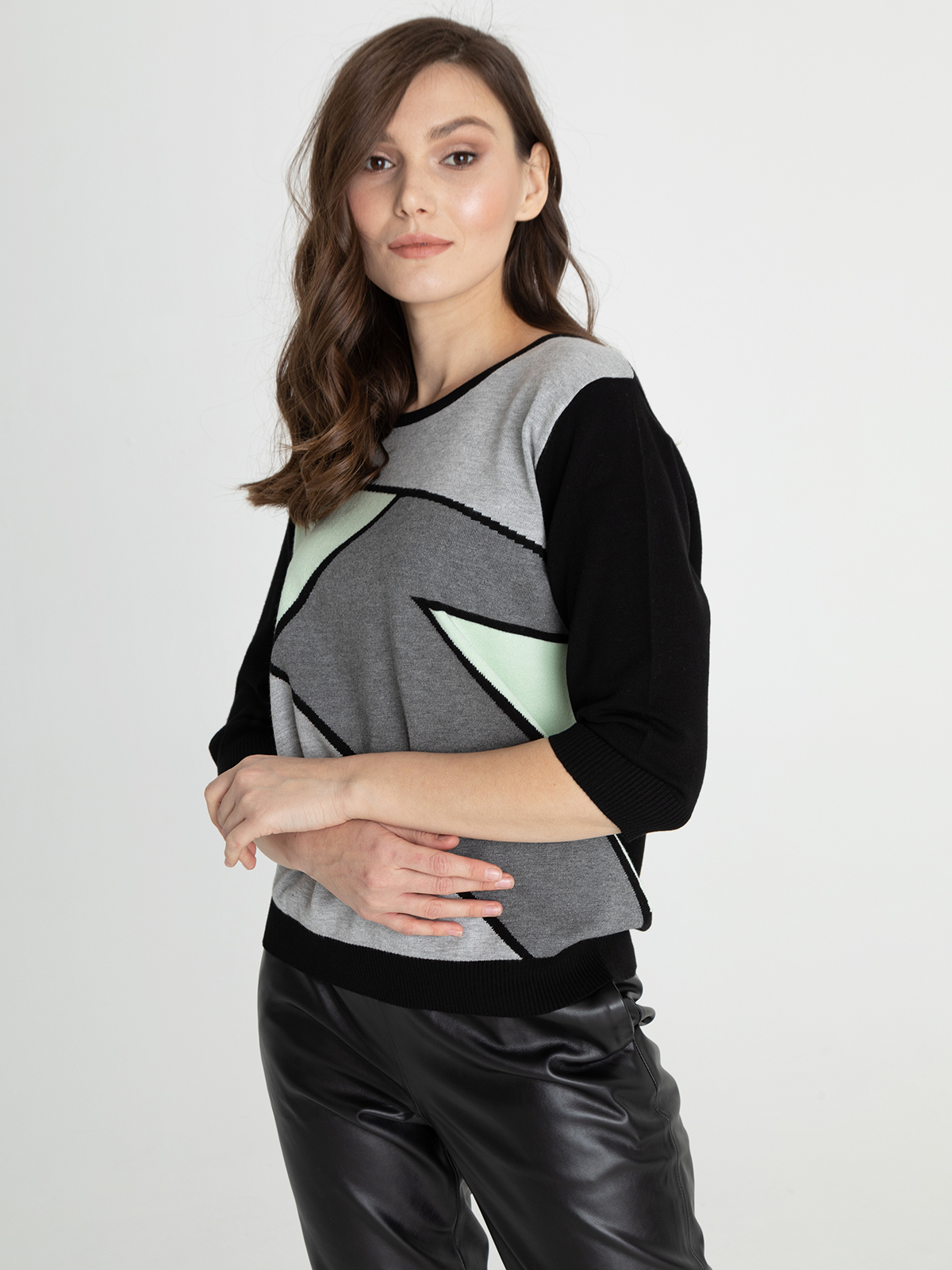 Джемпер в стиле пэчворк. Базовая цветовая гамма, прямой силуэт. Однотонные черные рукава длиной 3/4. Овальный вырез горловины обрамлен черной бейкой.
