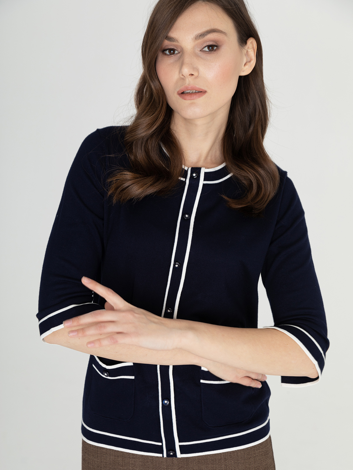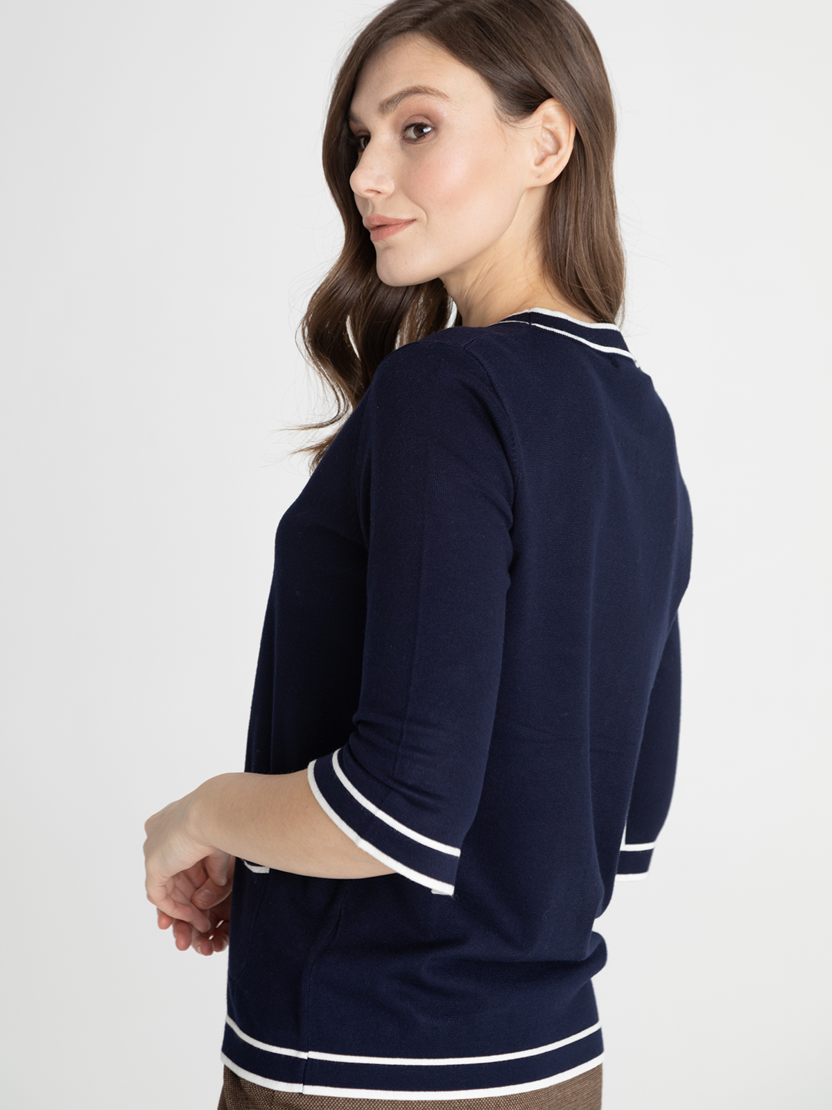 Элегантный темно-синий джемпер с контрастной отделкой по контуру изделия. Круглый вырез горловины, планка с пуговицами. Короткие втачные рукава, два накладных кармана спереди.