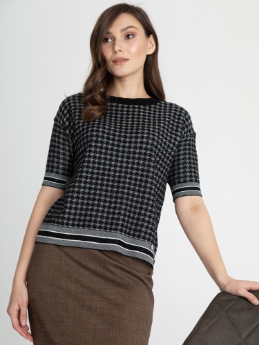 Джемпер прямого кроя с узором гусиная лапка по всей поверхности изделия. Короткий втачной рукав, спущенная линия плеч. Круглый вырез горловины, обрамлен черной бейкой в рубчик.
