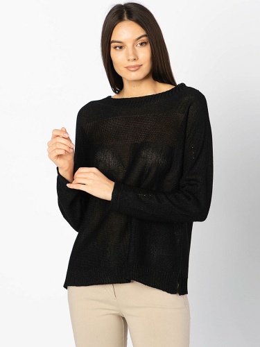 Приятный к телу джемпер из вискозы и полиэстера. Свободный покрой. Вырез "лодочка", длинные рукава. Небольшие разрезы по бокам. Длина изделия по спинке: 65 см.