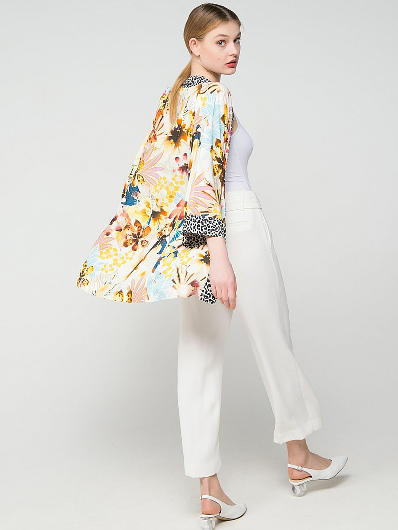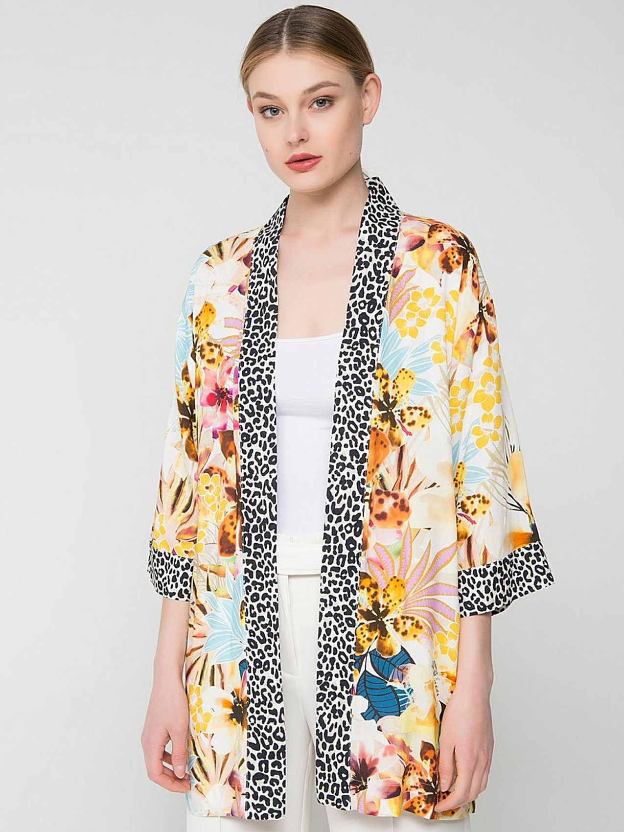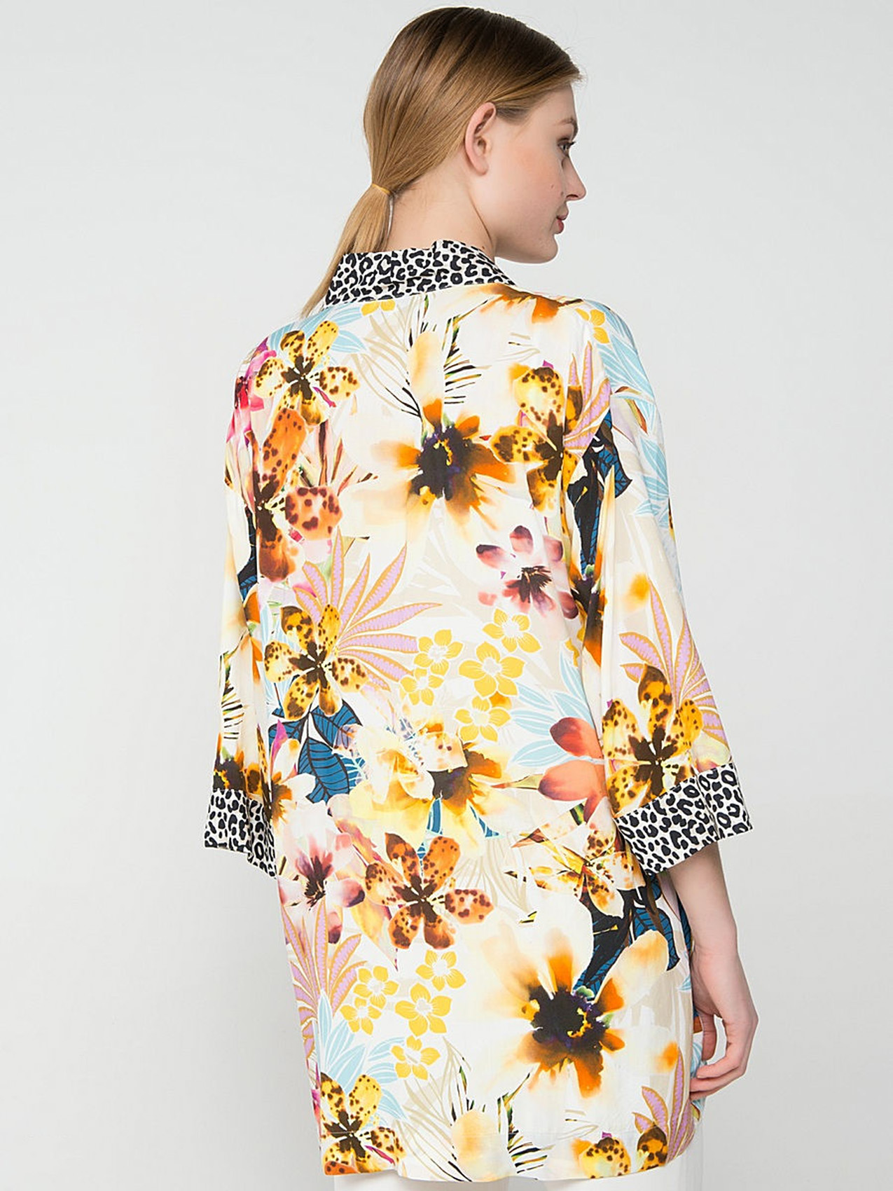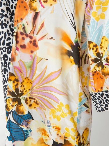 Вискозный кардиган демонстрирует удачное сочетание трендовых принтов - цветочного и звериного. Рукав 3/4, свободный покрой. То, что нужно, чтобы лето заиграло всеми красками!