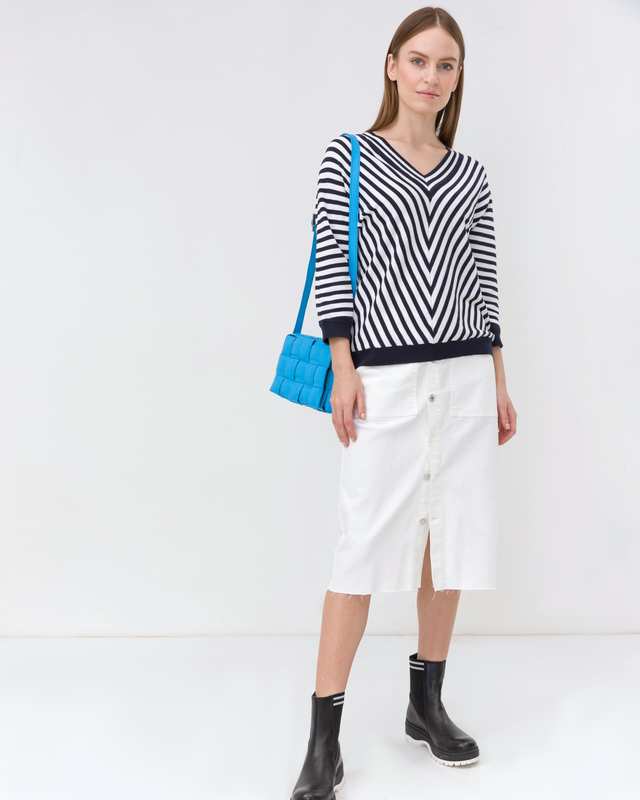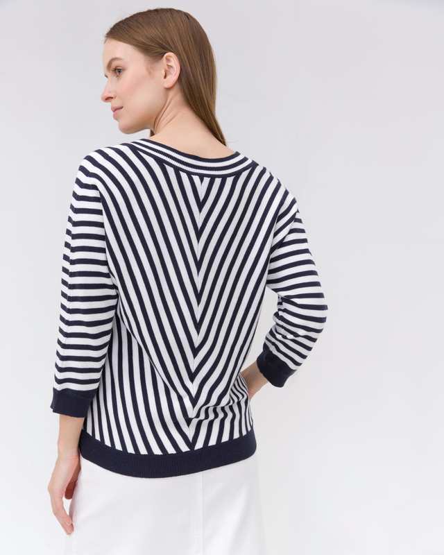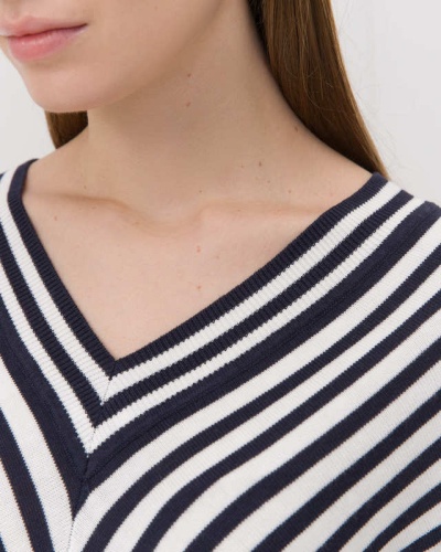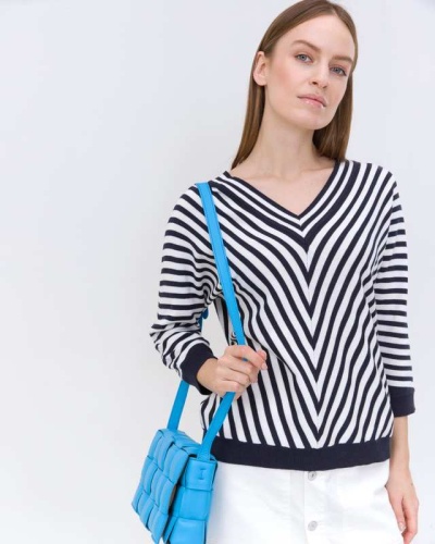 Джемпер с V-образным вырезом выполнен в геометрическом узоре. Цельнокроеный рукав ¾ с трикотажным манжетом. Состав материала – хлопок и вискоза.