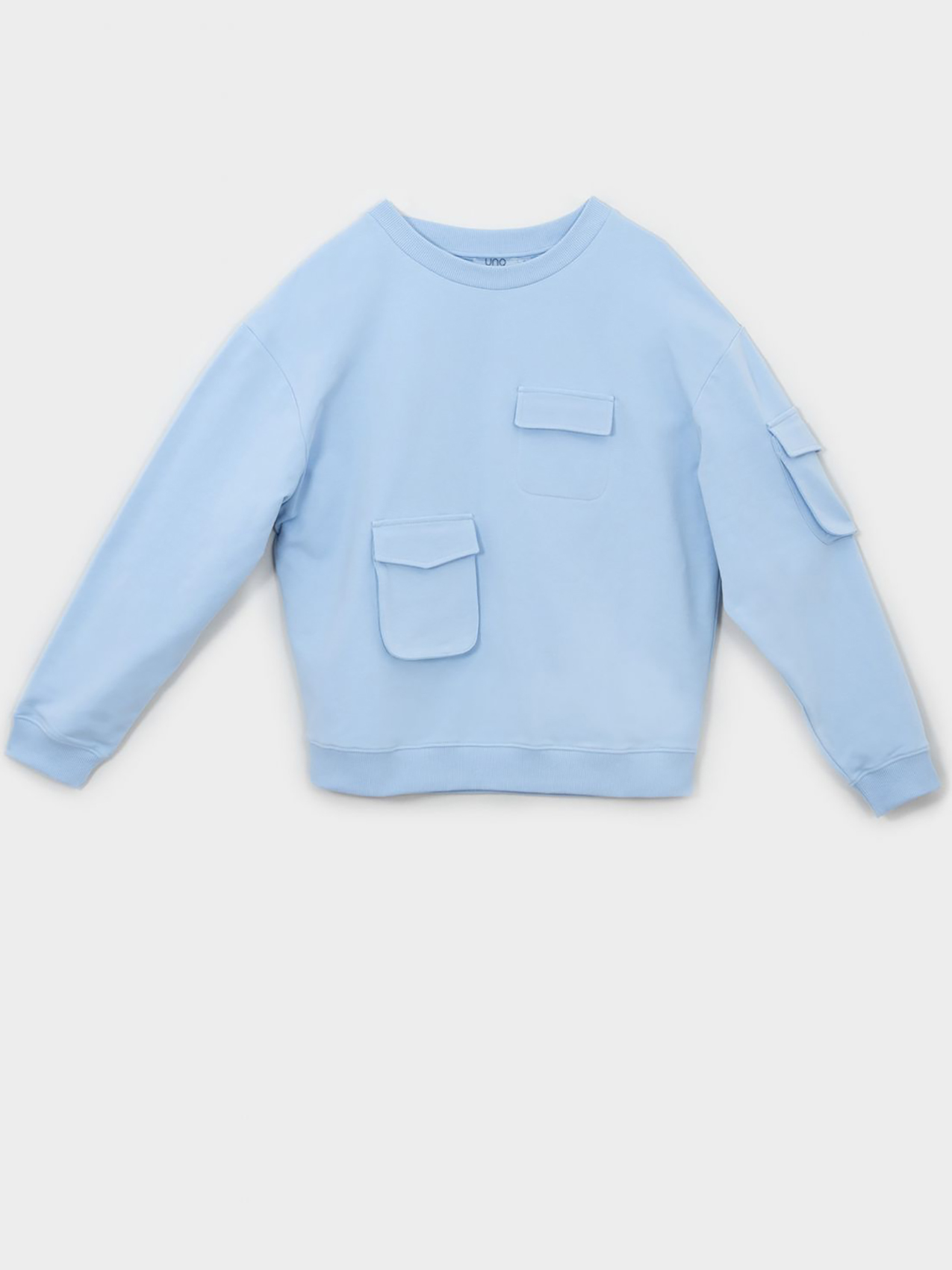 Оригинальный однотонный свитшот с тремя ассиметричными накладными карманами. Втачной рукав полной длины со спущенной линией плеч. Круглый вырез горловины, эластичный пояс по низу изделия.