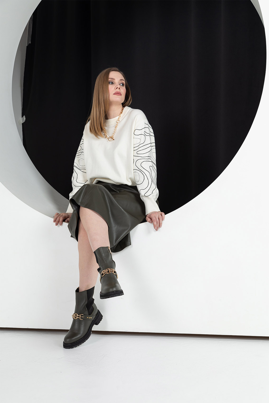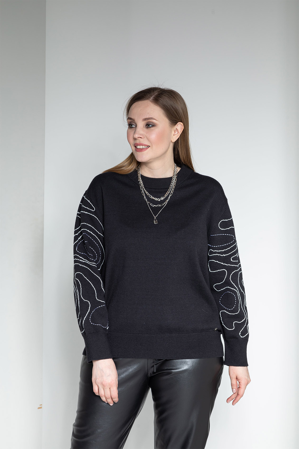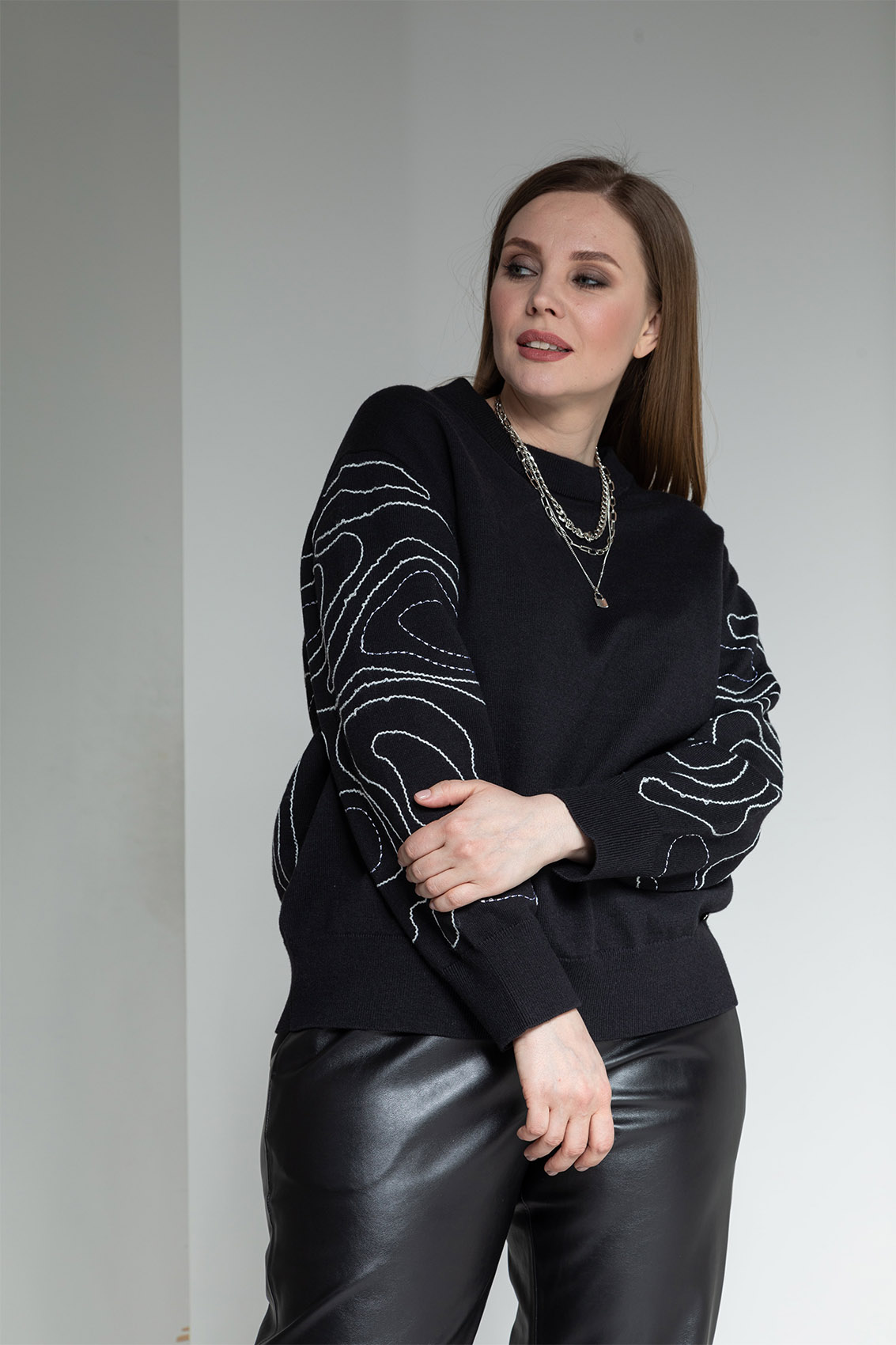 На сайте указаны российские размеры. Ткань: 60% хлопок, 30% нейлон, 10% шерсть. Крой: джемпер свободного силуэта по типу свитшота. Плотная структура ткани хорошо держит форму и позволяет скрыть несовершенства фигуры. Свободные рукава дарят максимум комфорта и удобства. Представлен в двух классических цветах – черном и белом. Отделка: рукава украшены контрастными строчками в разном исполнении. Подберите идеальный низ в разделах юбок и брюк на сайте Stern.