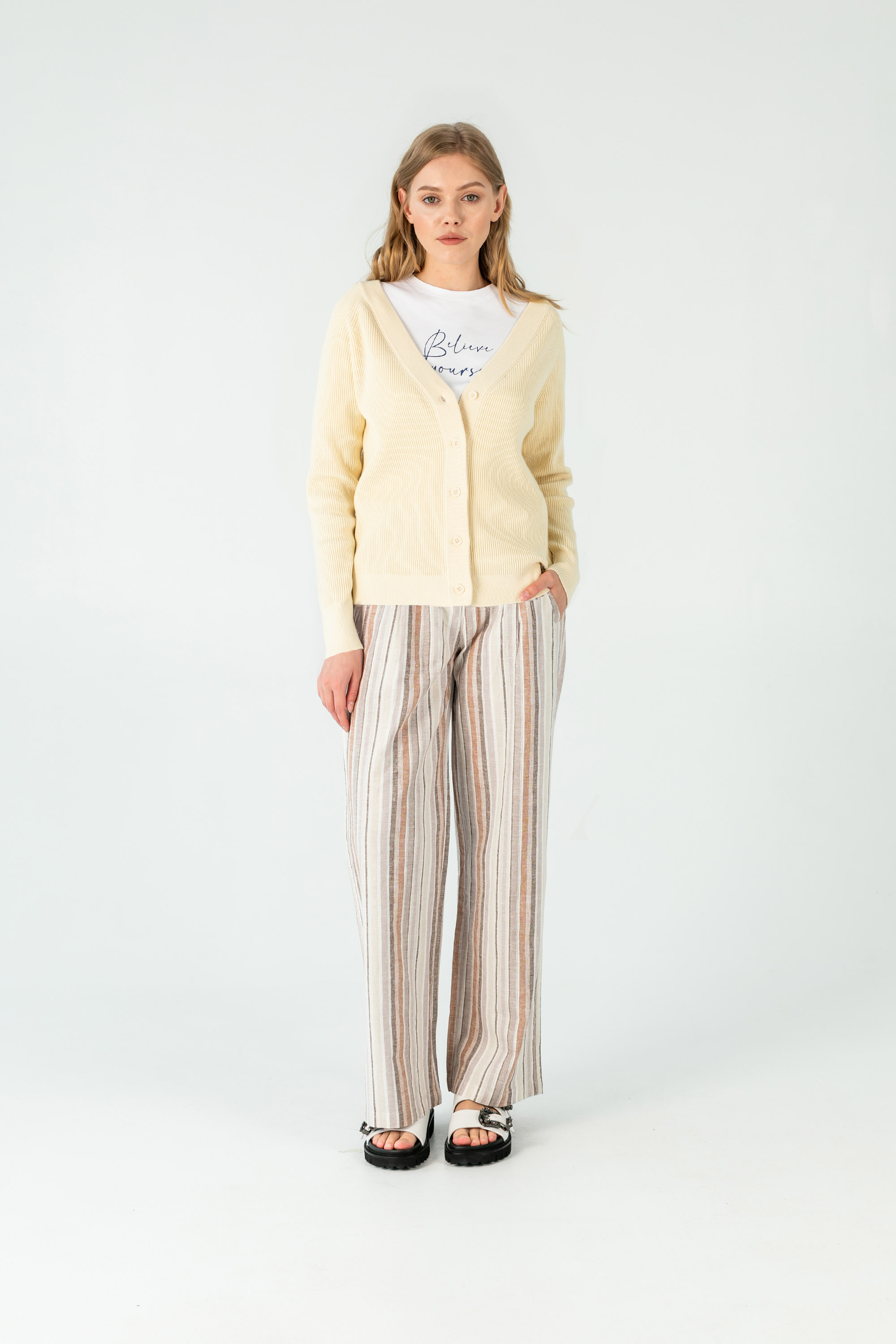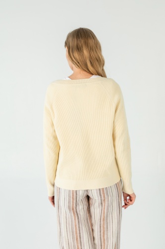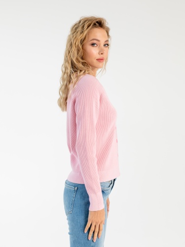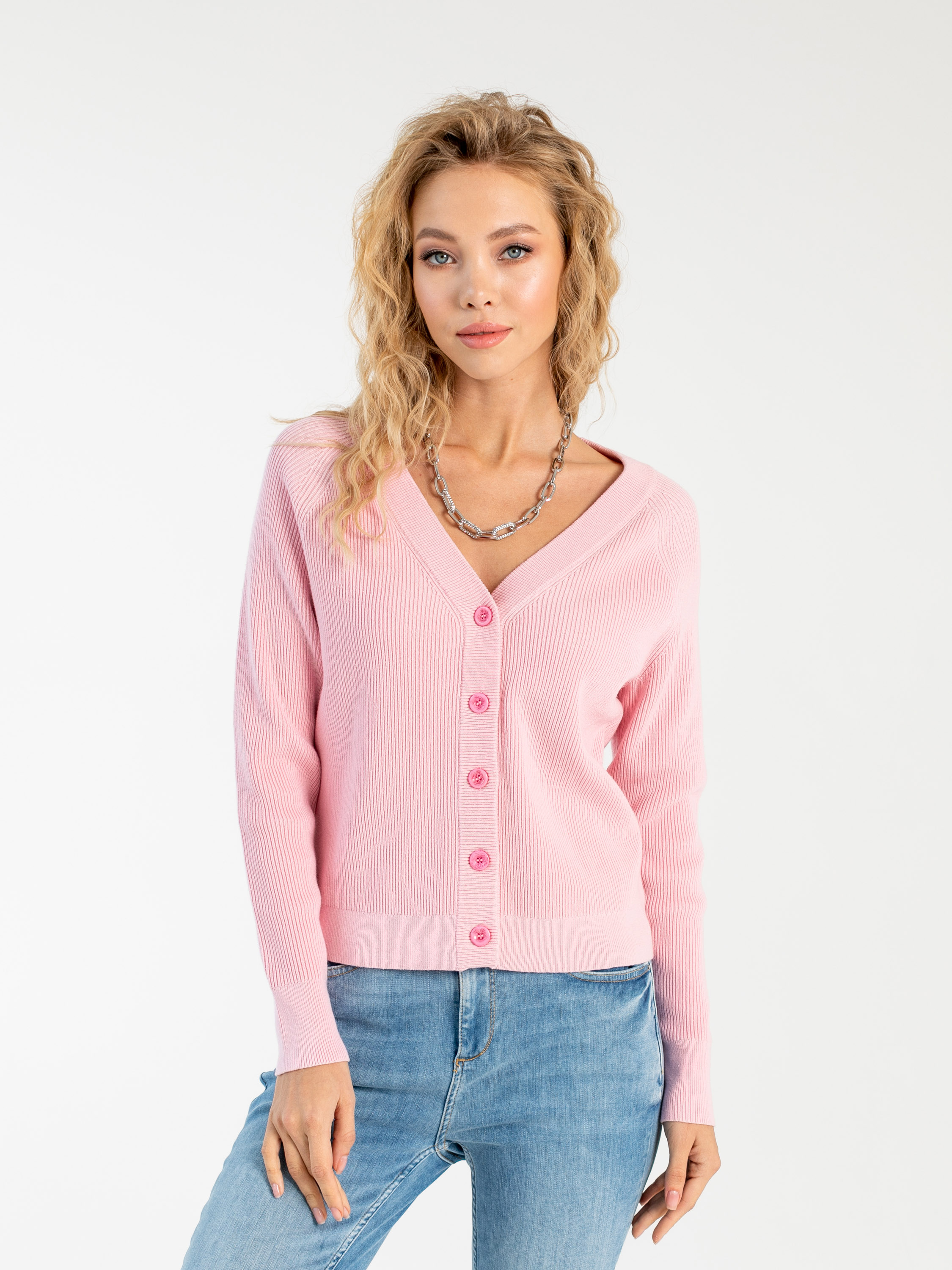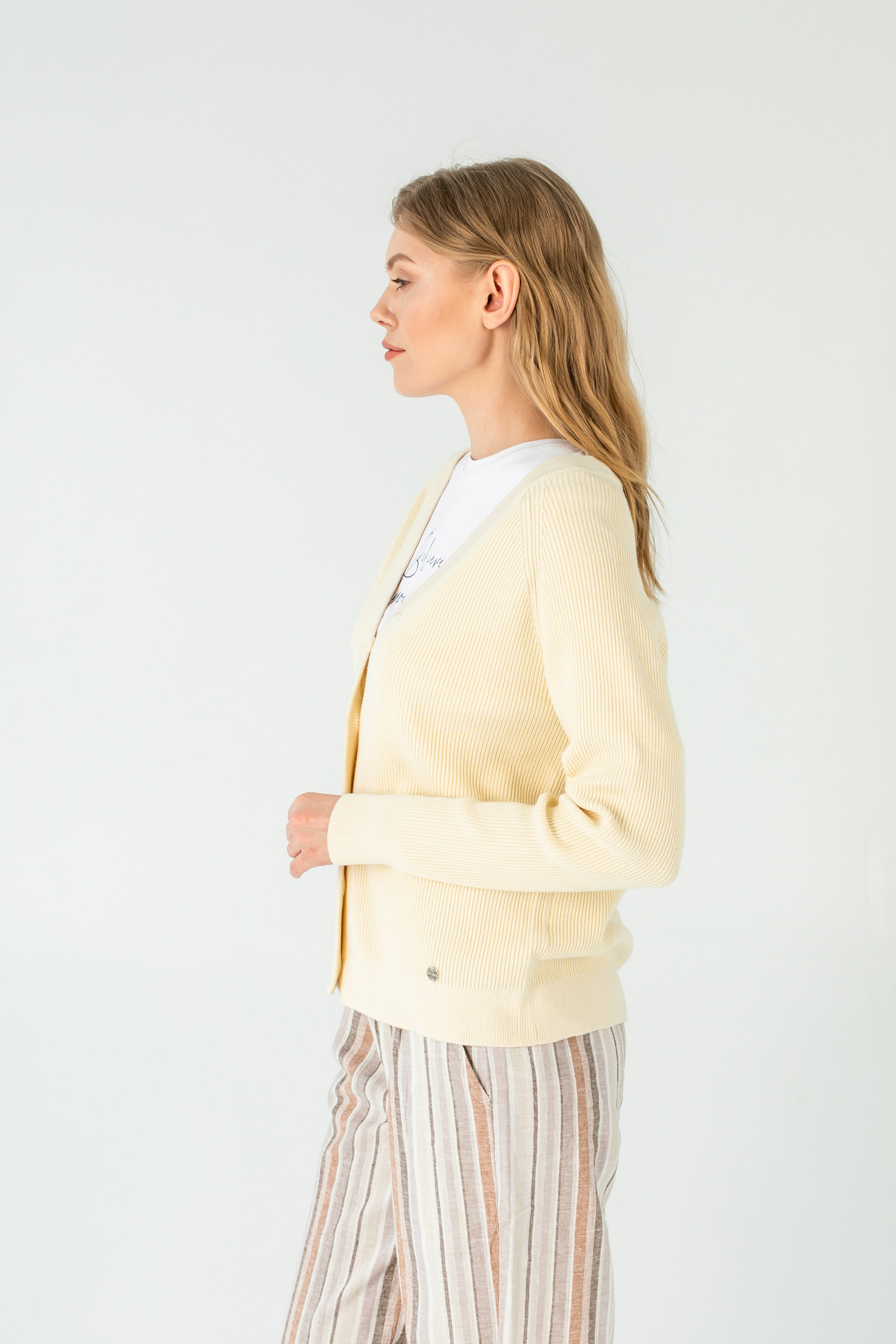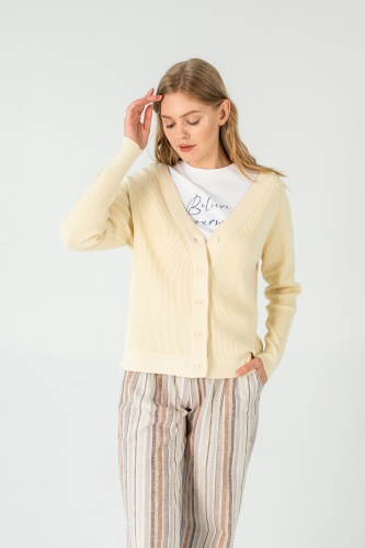 На сайте указаны российские размеры. Ткань: кардиган выполнен из трикотажного материала – смеси хлопка и акрила. Крой: прямой силуэт универсален для любого типа фигуры. Кардиган из трикотажа средней плотности с V-образным вырезом можно носить самостоятельно, либо дополнять футболками, водолазками и блузками. Длину рукава с широким манжетом-резинкой можно регулировать до нужного уровня. Отделка: фактура «лапша» приятна на ощупь и визуально удлиняет силуэт благодаря вертикальным полосам. Стильные круглые пуговицы делают образ ярче и интереснее, а скромный фирменный подвес в нижней части кардигана приковывает взгляды. Кардиган отлично впишется как в повседневные и деловые образы с брюками, джинсами и юбками из коллекции Stern. Рост модели 177 см.