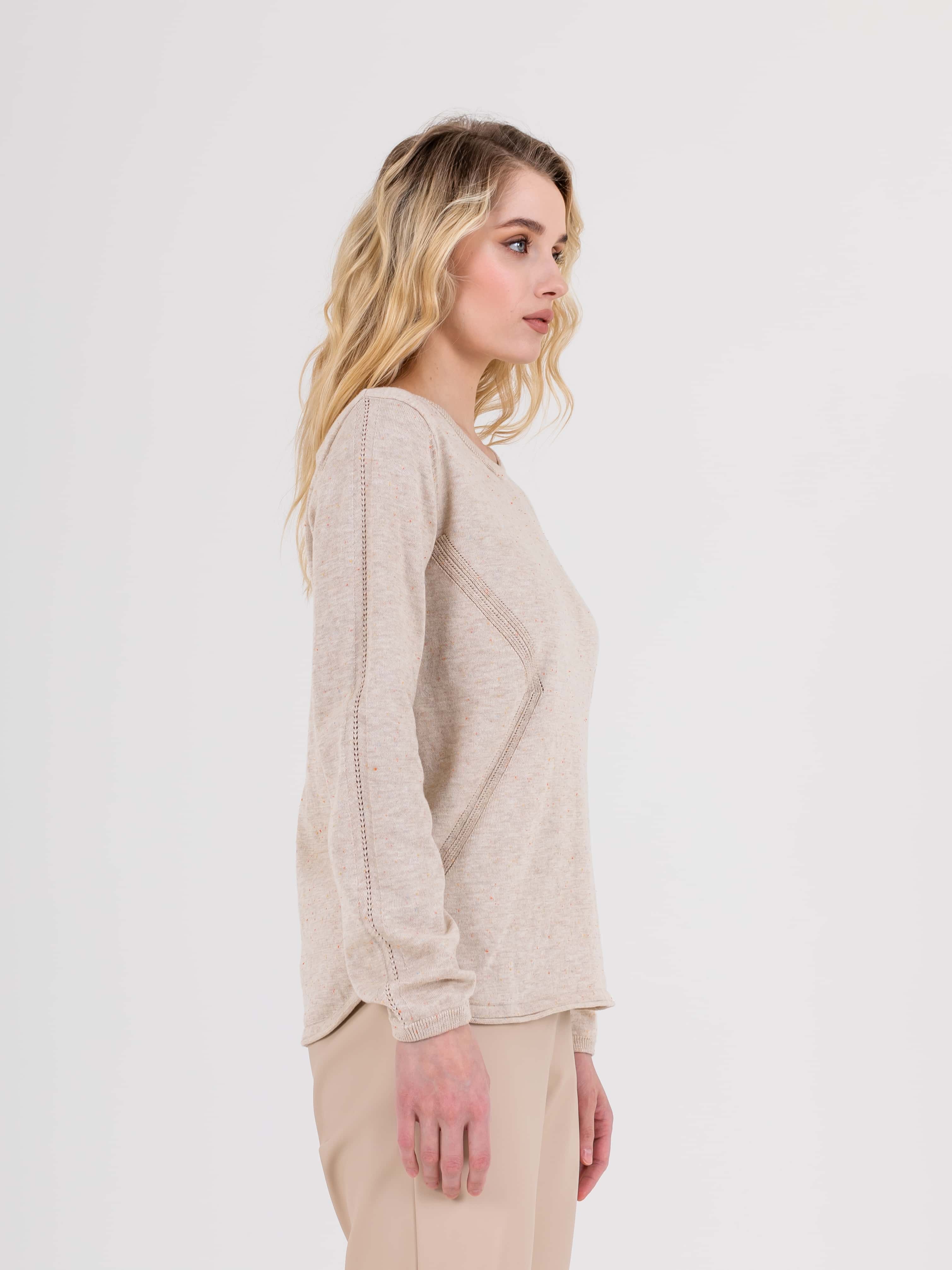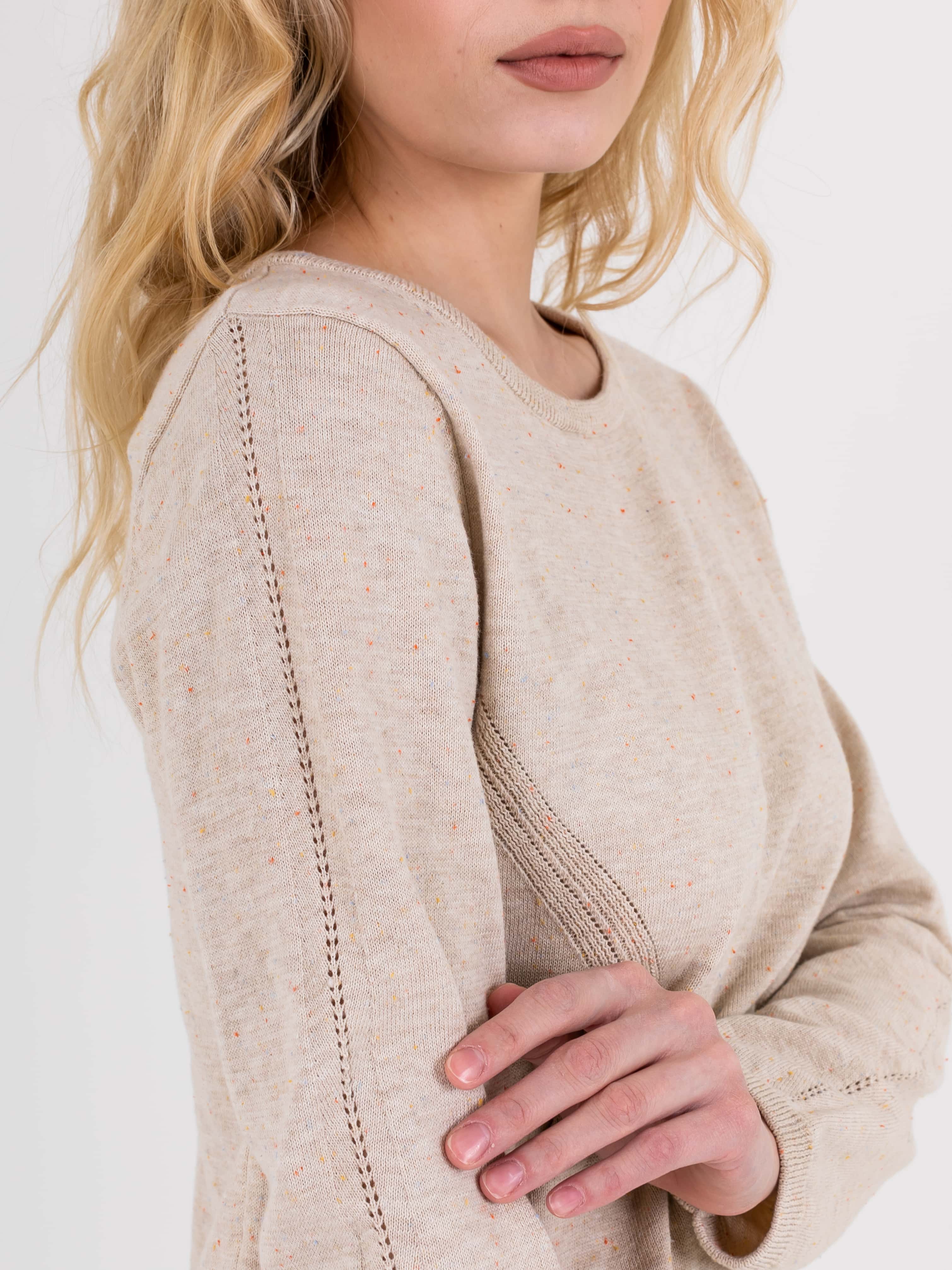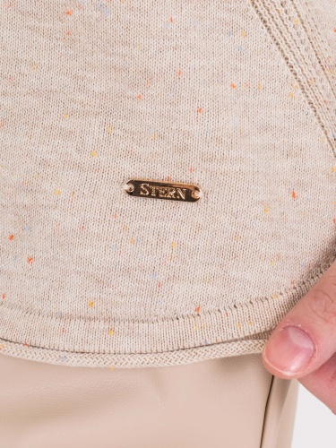 На сайте указаны российские размеры. Ткань: 65% хлопок, 35% полиэстер. Крой: джемпер свободного силуэта с круглым вырезом. Универсальная модель отличается простым, но удобным кроем и идеальной посадкой на женщин разного роста и комплекций. Выполнен из приятного трикотажа с хлопком. Отделка: передняя часть джемпера и рукава украшены выбитыми узорами, которые придают особое очарование всему образу. В структуре ткани присутствуют цветные вкрапления, которые добавляют свежести образу. Сочетайте с кожаными или трикотажными брюками, а также юбками из ассортимента Stern. Рост модели - 177 см