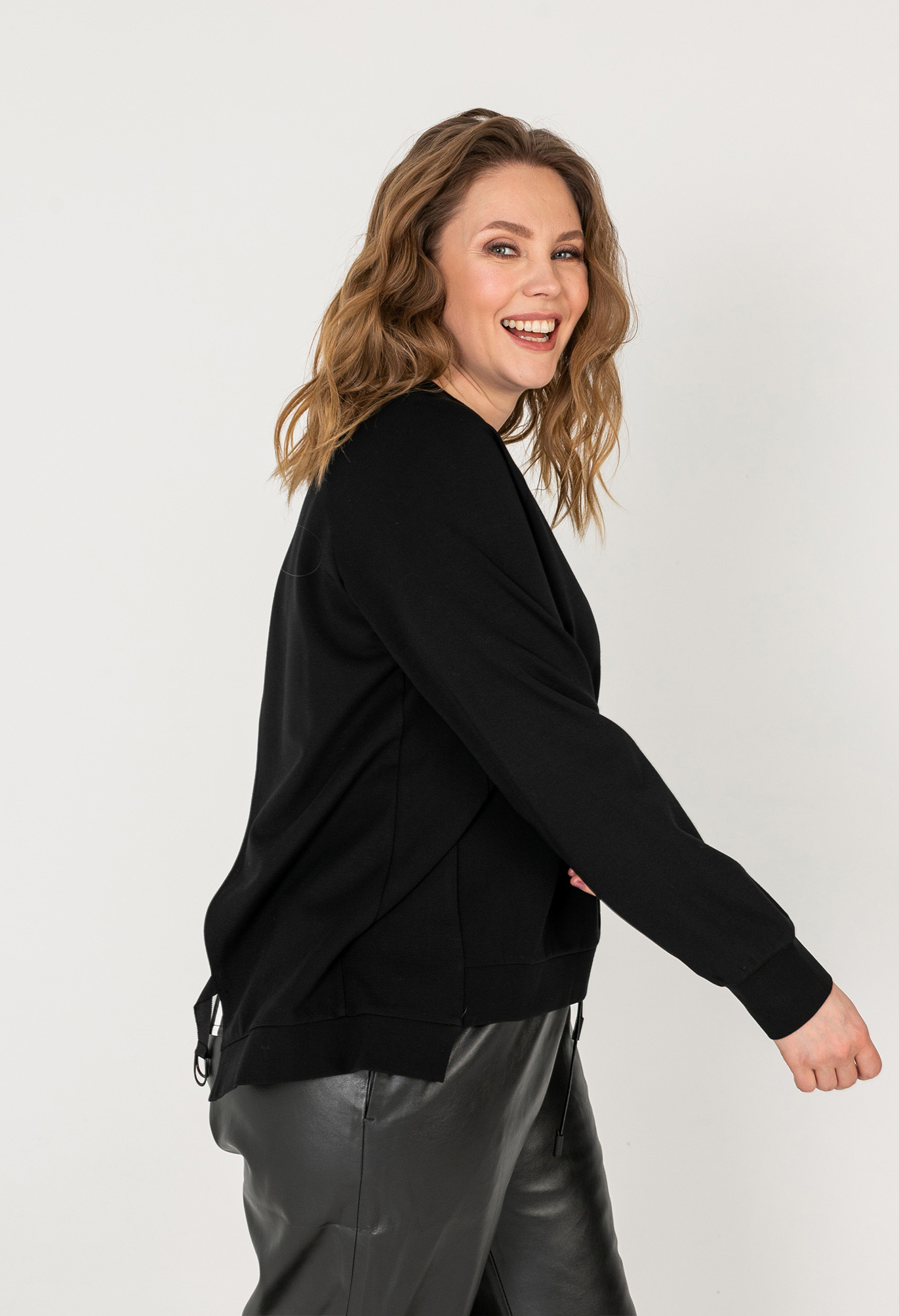 На сайте указаны российские размеры. Состав: смесовая ткань средней плотности. В составе: 30% хлопок, 65% вискоза, 5% эластан. Отделка: 96% полиэстер, 4% эластан. Крой: лаконичный джемпер прямого силуэта с длинным рукавом и круглым вырезом. Идеально садится по фигуре, скрывая недостатки, а насыщенный черный цвет визуально делает образ еще стройнее. Отделка: спинка джемпера украшена декоративной вставкой из гладкой ткани, детали основного материалы соединяются перемычкой в цвет. Обратите внимание на коллекцию кожаных брюк в соответствующем разделе нашего сайта. Они идеально подходят к этому джемперу.
