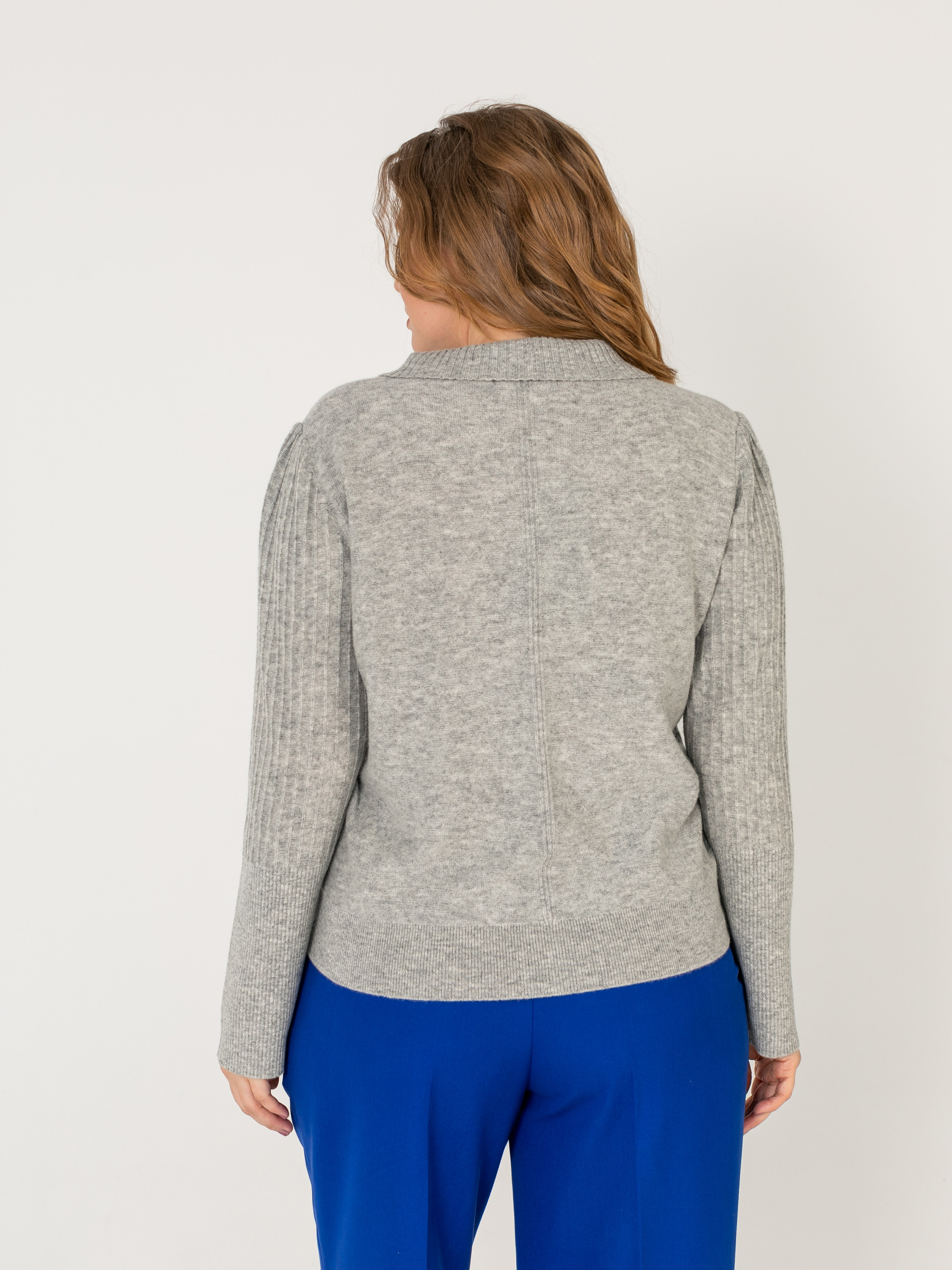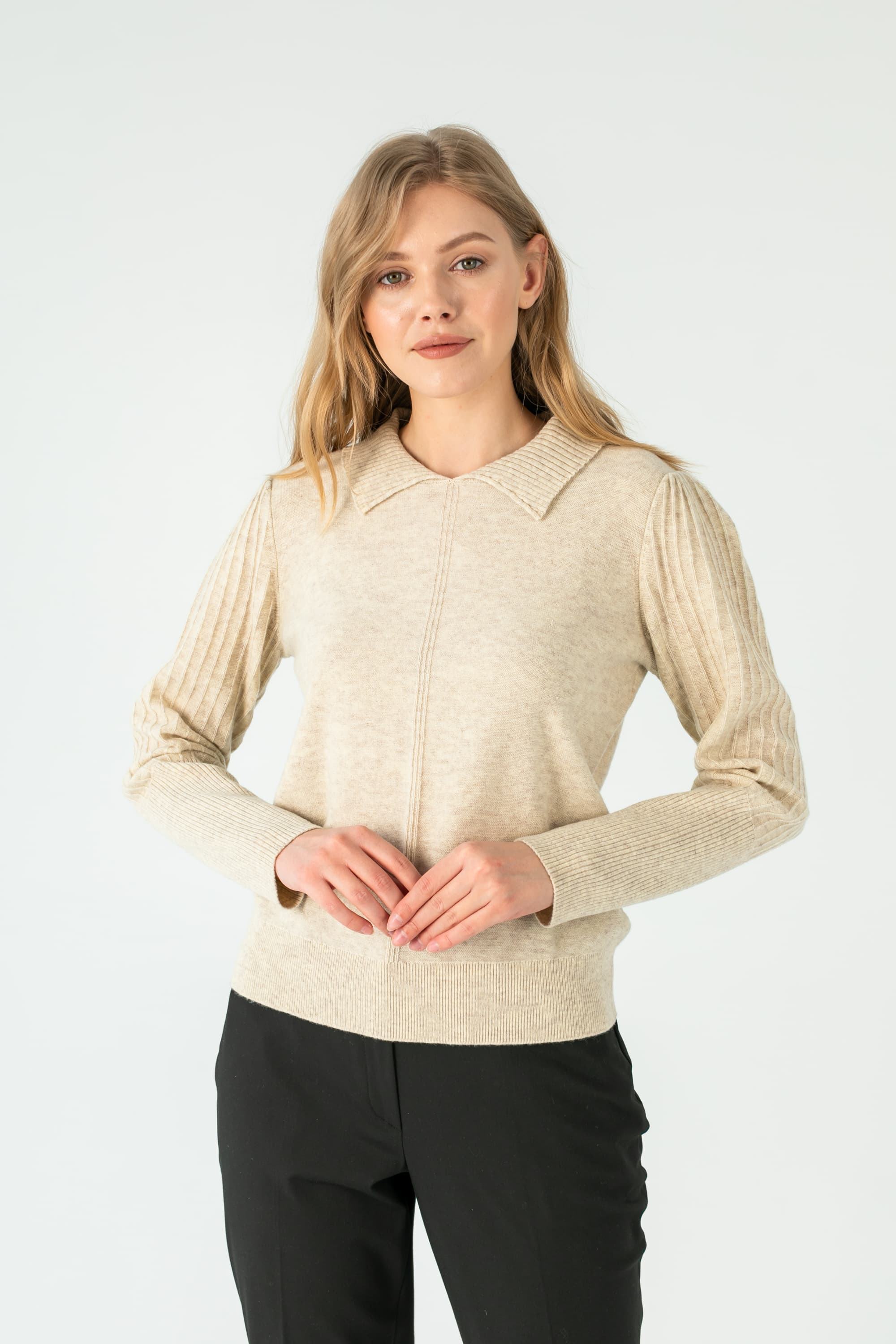 На сайте указаны российские размеры. Крой: джемпер прямого силуэта с длинным рукавом. Шерсть в составе дарит непревзойденное тепло, материал приятен телу, не колется и не натирает. Универсальная модель отличается простым, но удобным кроем и идеальной посадкой на женщин разного роста и комплекций. Представлен в двух сдержанных оттенках – сером и бежевом. Отделка: аккуратный треугольный воротничок добавляет истинного благородства и аристократизма этому джемперу. Фактурная полоса по центру изделия создает дополнительную вертикаль, которая гармонирует с рубчиком на рукавах. Подберите идеальный низ в разделах юбок и брюк на сайте Stern.