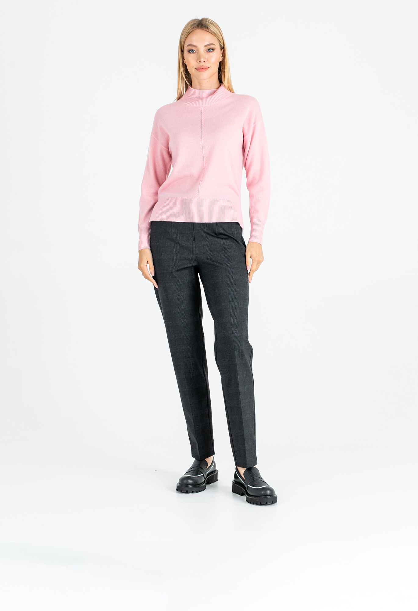 На сайте указаны российские размеры. Ткань: 90% шерсть мериноса, 10% кашемир. Крой: джемпер прямого силуэта средней длины. Имеет слегка приподнятый ворот-резинку, который подчеркивает красоту шеи, но главное – защищает горло от ветра и холода. Прикрывает зону живота, не поднимается при движении. Разрезы по бокам добавляют комфорта при движении. Представлен в двух цветах – коричневом и розовом. Отделка: увеличенная по сравнению с передней частью задняя половина джемпера прикрывает часть бедер и скрывает возможные несовершенства фигуры. Передняя и задние части украшены рельефным узором «елочкой». Подберите идеальный низ в разделах юбок и брюк на сайте Stern. Рост модели - 177 см
