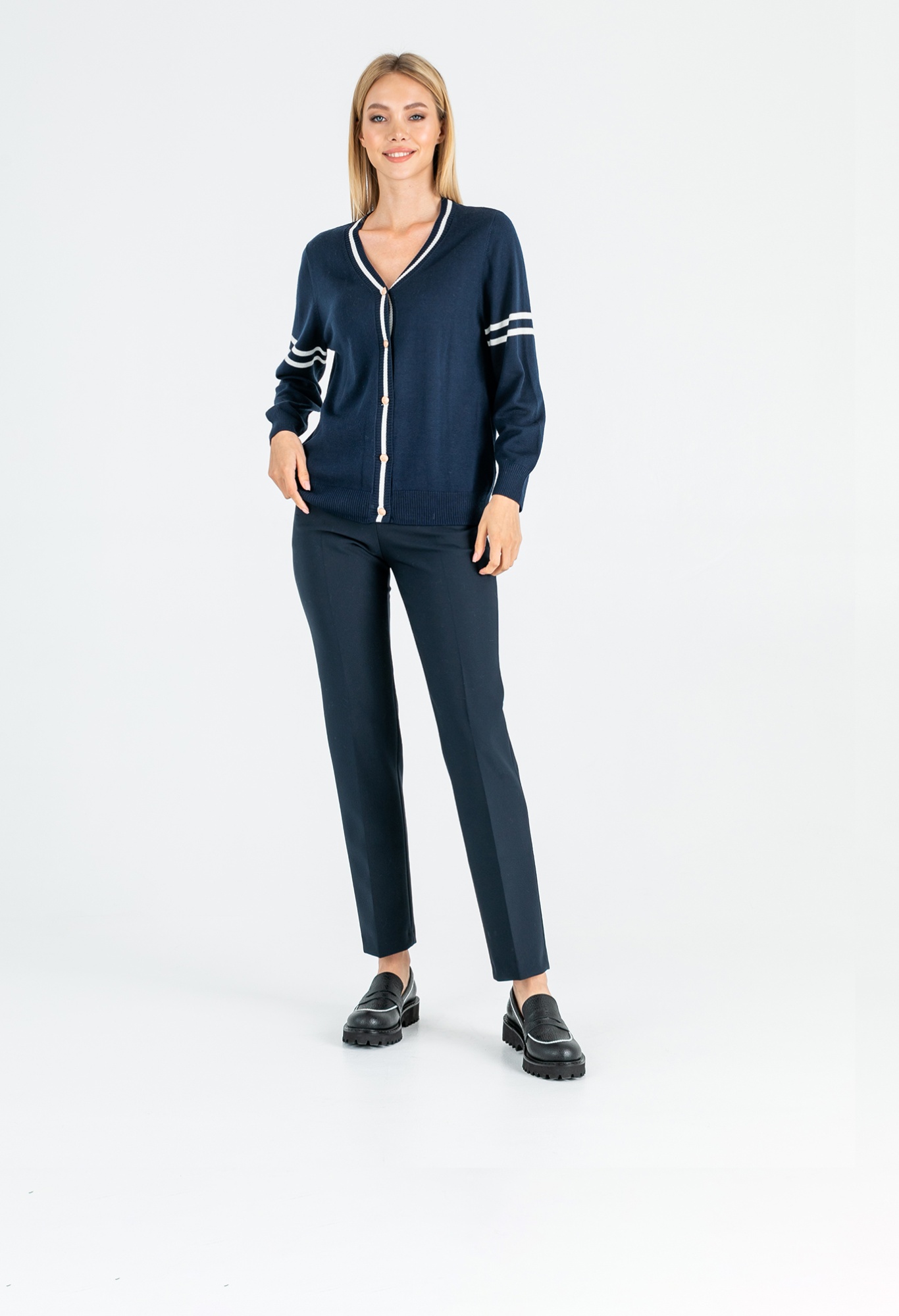 На сайте указаны российские размеры. Ткань: выполнен из мягкого и уютного материала – смеси шерсти и акрила. Крой: прямой силуэт, благородный темно-синий цвет и изысканный V-образный вырез делают этот кардиган лучшим вложением в стильный гардероб. Пуговицы – функциональны, а значит, можно носить кардиган как в застегнутом, так и в расстегнутом виде. Длина рукава с манжетом-резинкой регулируется до желаемого уровня. Отделка: кардиган в стиле casual со спортивными элементами – контрастными полосками, которые моментально делают образ запоминающимся. Золотистые фактурные пуговицы с оттиском добавляют шика и приковывают внимание к себе. На спине расположен фирменный шильдик-эмблема. Кардиган может выступать как самостоятельная деталь одежды, так и служить компаньоном для водолазки, футболки, блузки и рубашки из ассортимента Stern. Рост модели - 177 см