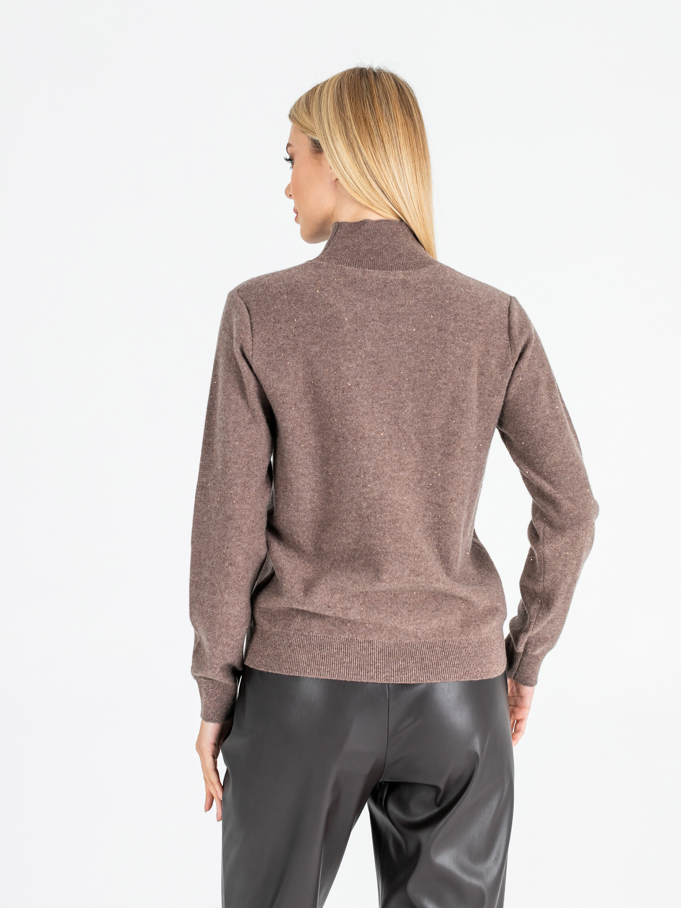 На сайте указаны Российские размеры. Ткань: 98% шерсть мериноса, 2% полиакрил. Крой: базовый однотонный джемпер приталенного силуэта. Модель, напоминающая привычную водолазку, выделяется длинным воротом-резинкой, который защищает от холода и ветра. Универсальная модель из шерсти мериноса – идеальный вариант для зимы и межсезонья. Джемпер представлен в двух стильных цветах – черном и коричневом. Отделка: легкое благородное сияние ткани придают прозрачные пайетки. Базовый компаньон для джинсов, брюк, джемперов, сарафанов, юбок и рубашек. Рост модели - 177 см