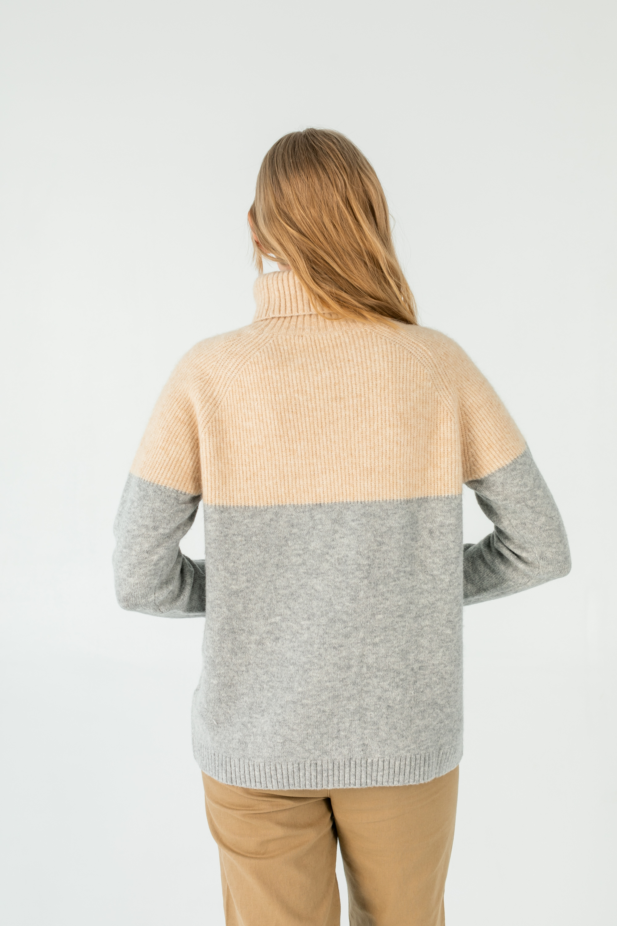 На сайте представлены российские размеры. Ткань: 13% мохер, 35% шерсть, 49% нейлон, 3% эластан. Крой: джемпер с прямого силуэта с высоким воротом-резинкой, надежно защищающим от ветра и холода. Плотный материал с шерстью и мохером отлично держит форму, что позволяет скрывать возможные несовершенства фигуры, не акцентируя на них внимание. Отделка: джемпер выделяется сочетанием двух цветов и фактур в разных частях изделия: бежевый верх – в рубчик, серый низ – гладкой вязки. Сочетайте со спокойным низом в одном цветовой гамме. Бежевые и серые модели брюк вы можете найти в соответствующем разделе на сайте. Рост модели 177 см