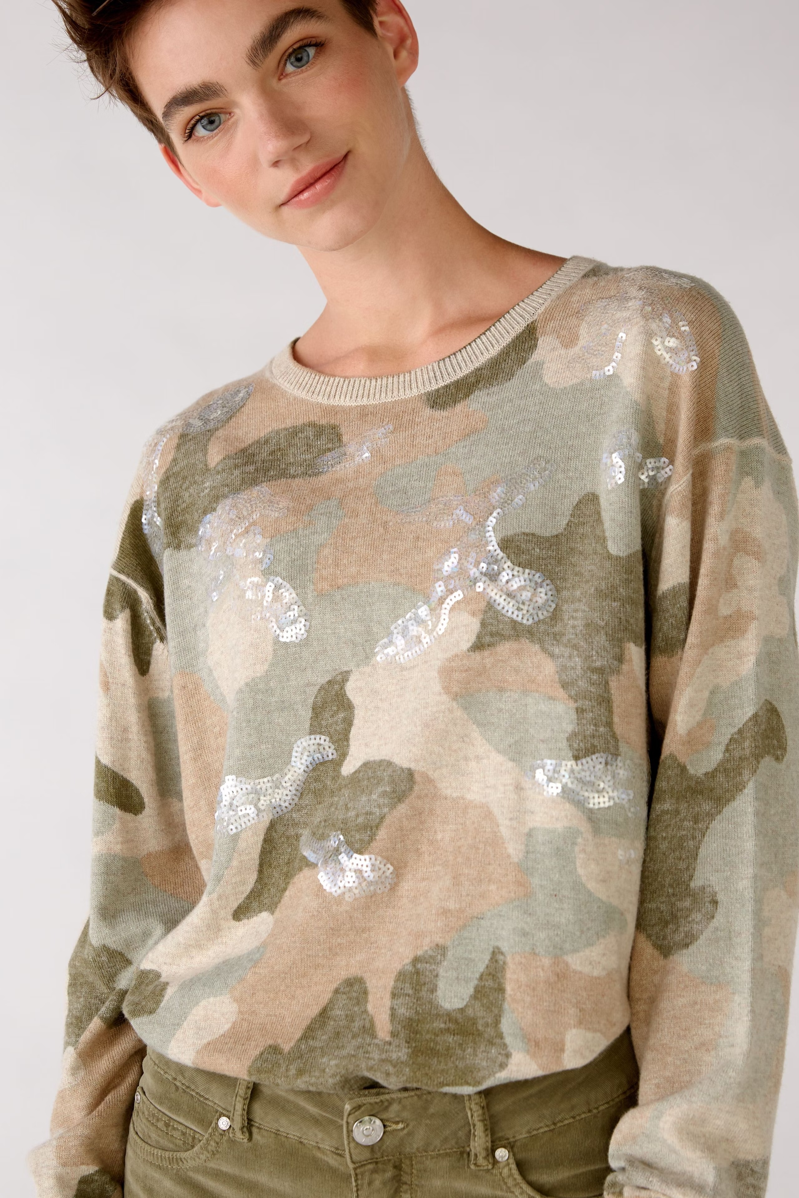 На сайте указаны российские размеры. Пуловер прямого покроя. Стразы, сужающиеся от плеча к талии. Декоративная строчка на плече яркого цвета. Ребристый низ, рукава и воротник. Рост модели 178 см.