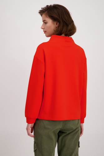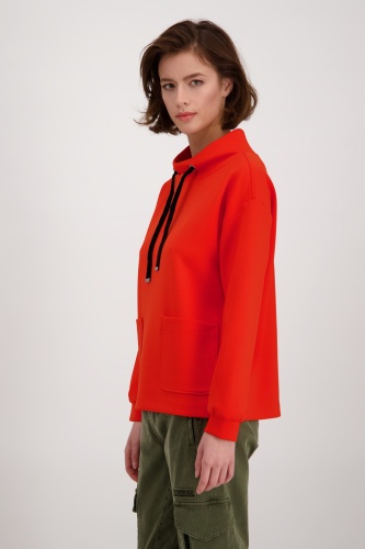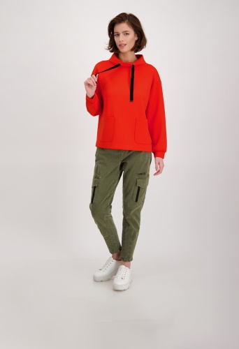На сайте указаны российские размеры. Повседневная толстовка с длинными рукавами от monari выполнена в мягком, приятном на ощупь, эластичном и женственном стиле. Классический крой с воротником-стойкой, манжетами с воланами и заниженной линией плеча. Два накладных кармана и бархатные ленты на воротнике искусно украшают перед. Заявите о себе с помощью этой модной вещицы. Модель ростом 178 см.