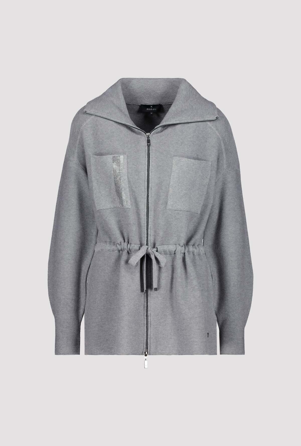 На сайте указаны российские размеры. Блейзер из хлопка с завязками на молнии. Мягкий кардиган от monari имеет модный дизайн изнаночной вязки. Рукава реглан, вставка чулочной вязкой на плечах и прямой крой с воротником-тройе и кулиской с завязками на талии придают модели непринужденный вид. Два накладных кармана с узором лицевой гладью и сверкающими стразами на груди украшают перед. Модель ростом 176 см.