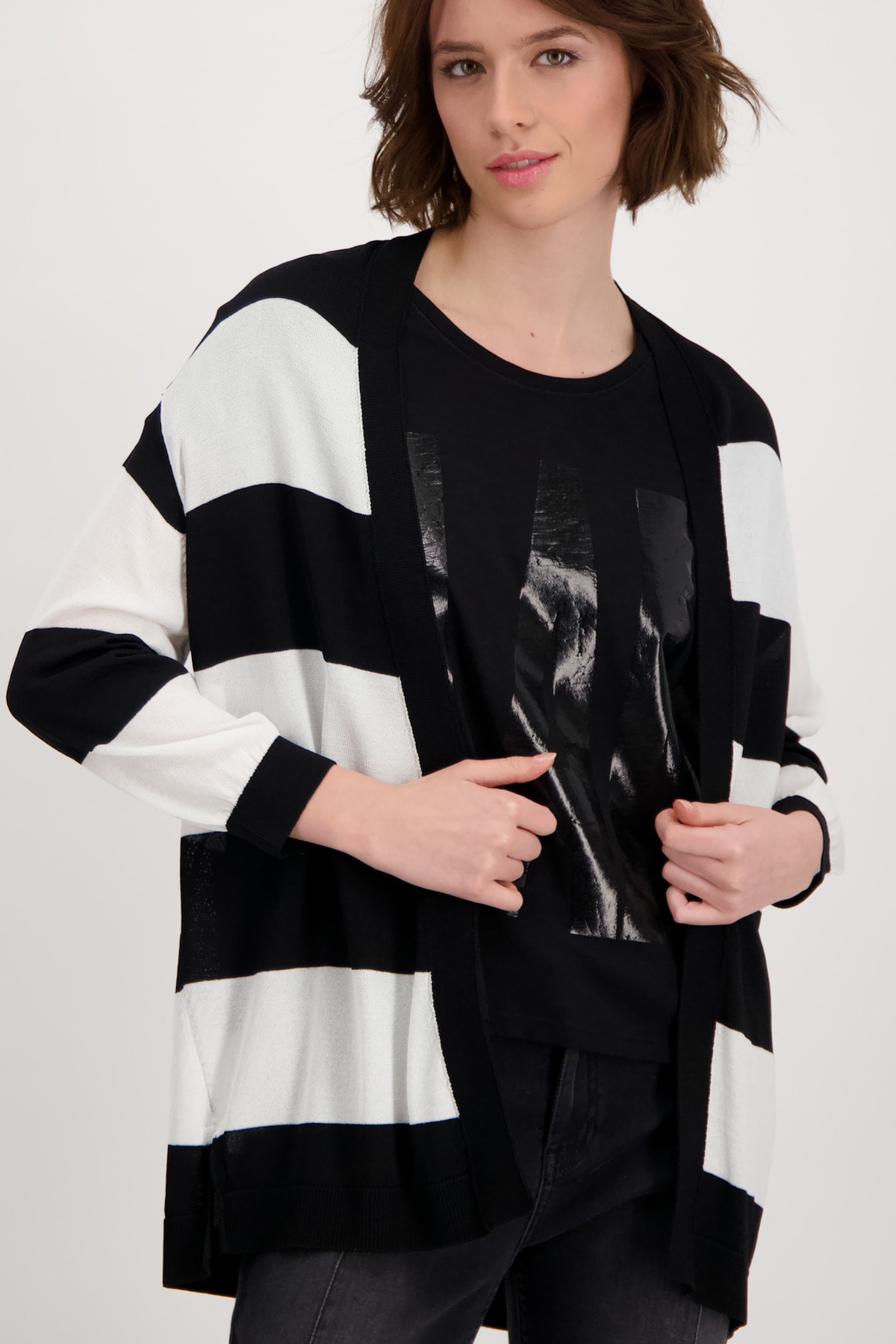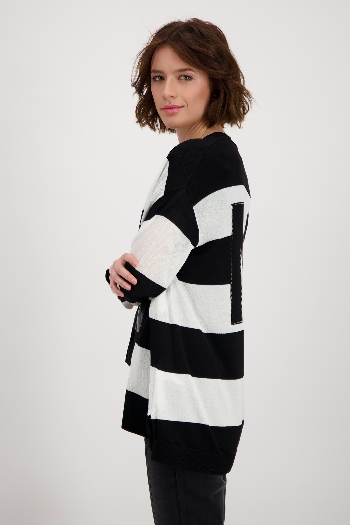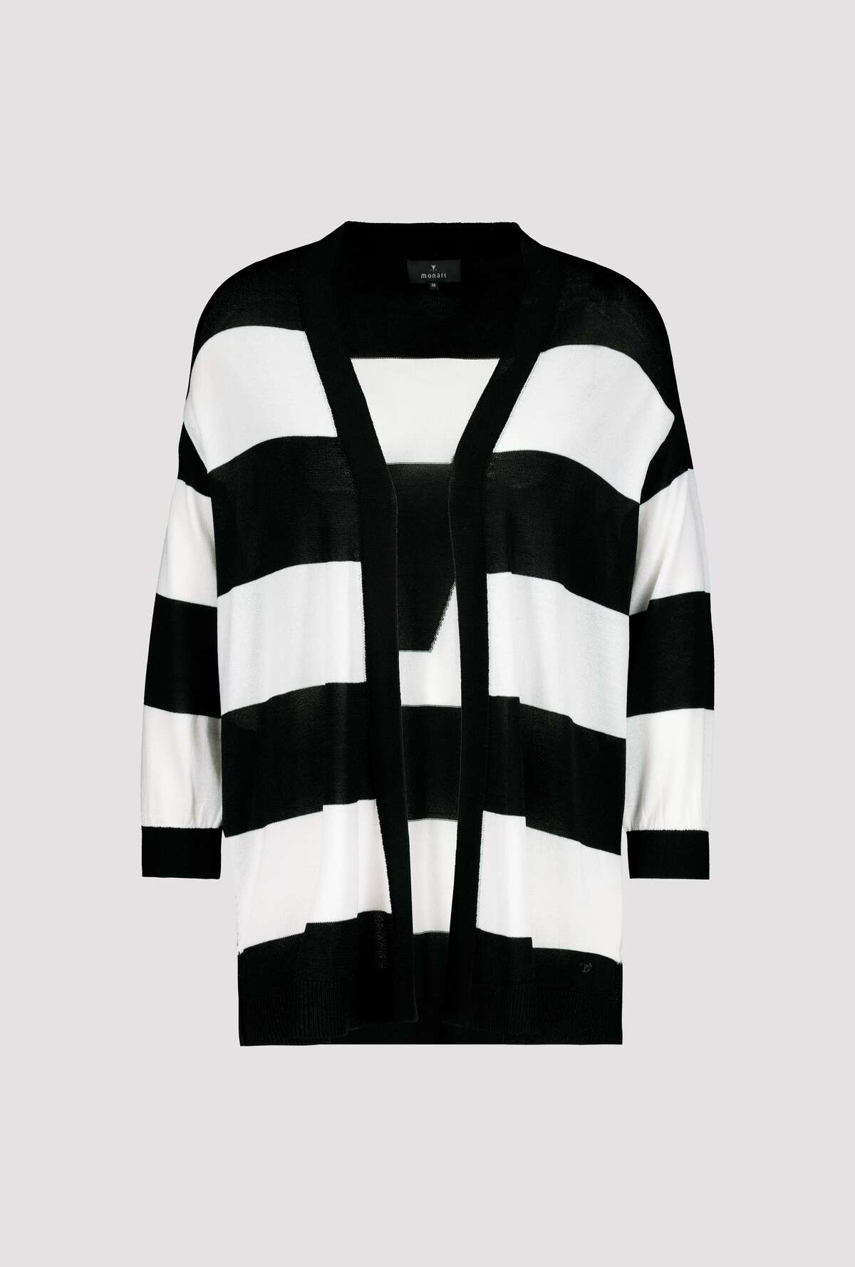 На сайте указаны российские размеры. Открытый кардиган с рукавом 3/4 и деталью на спине. Кардиган с открытым передом придает вашему образу великолепный вид и идеально подходит для комбинирования. Прямой фасон дополнен манжетами и рюшами на концах рукавов, боковыми разрезами и низом с манжетами в резинку. Вывязанная буква со сверкающими стразами украшает спину модели, украшенной полосками по всей поверхности. Струящаяся вискоза в смеси также обеспечивает удобную посадку. Побалуйте себя. Модель ростом 178 см Длина спины 72 см.