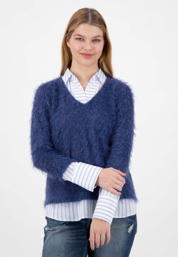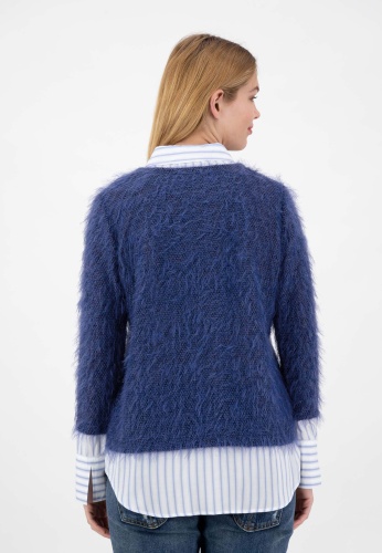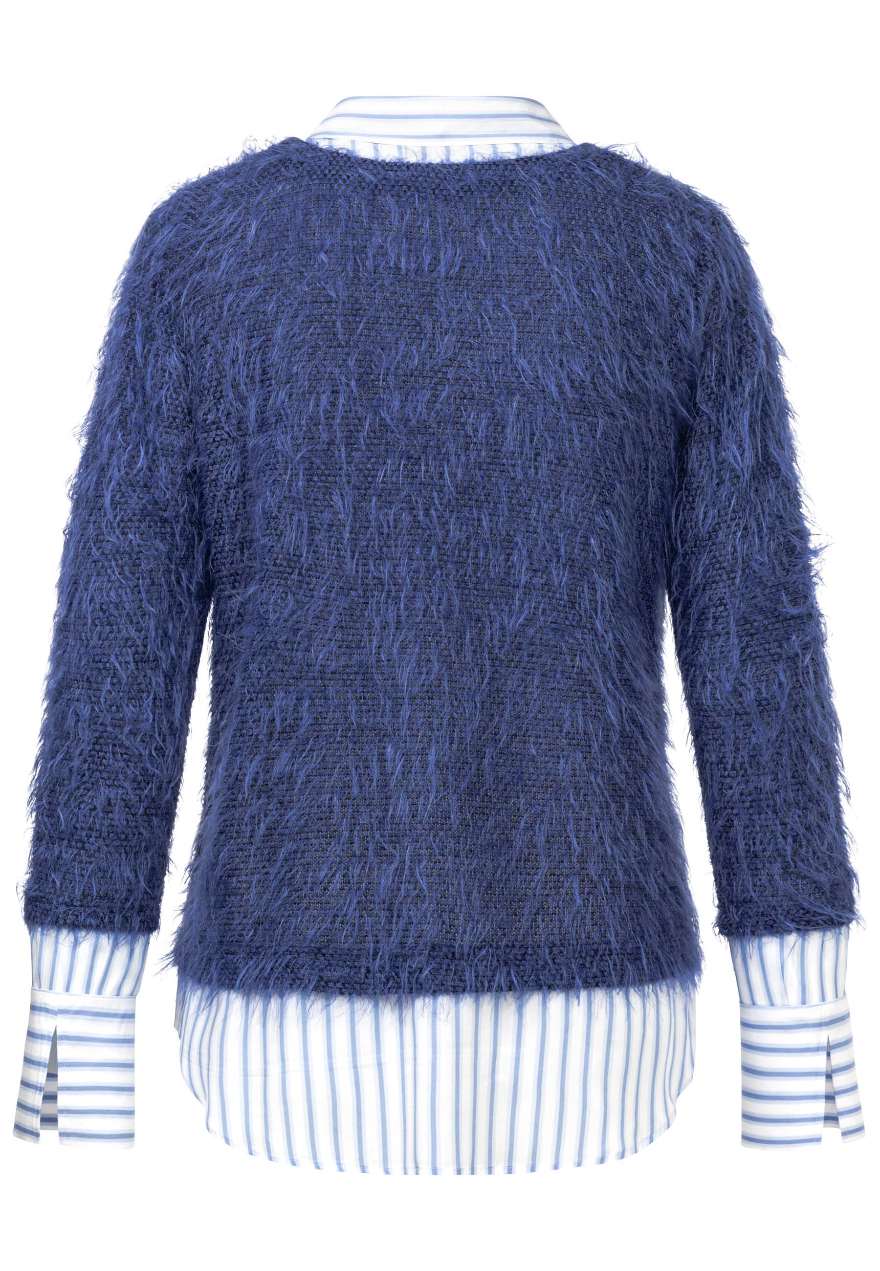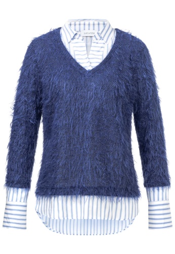 На сайте указаны российские размеры. Уютный свитер с модной блузочной вставкой. Свитер и блузка в одном – так создаются спортивные, незамысловатые наряды. Наряд два в одном, состоящий из уютного свитера и полосатой блузки со вставками, идеален для повседневного образа. Классические элементы блузки, такие как воротник рубашки и манжеты с прорезями, которые можно небрежно вывернуть наизнанку, также придают этой блузке оригинальный деловой вид для повседневного использования в офисе. Наша модель ростом 177 см. Измерения для 44 размера: Окружность груди: 104 см Талия: 101 см Ширина бедер: 110 см Длина спинки: 70 см. Длина рукава: 62 см.