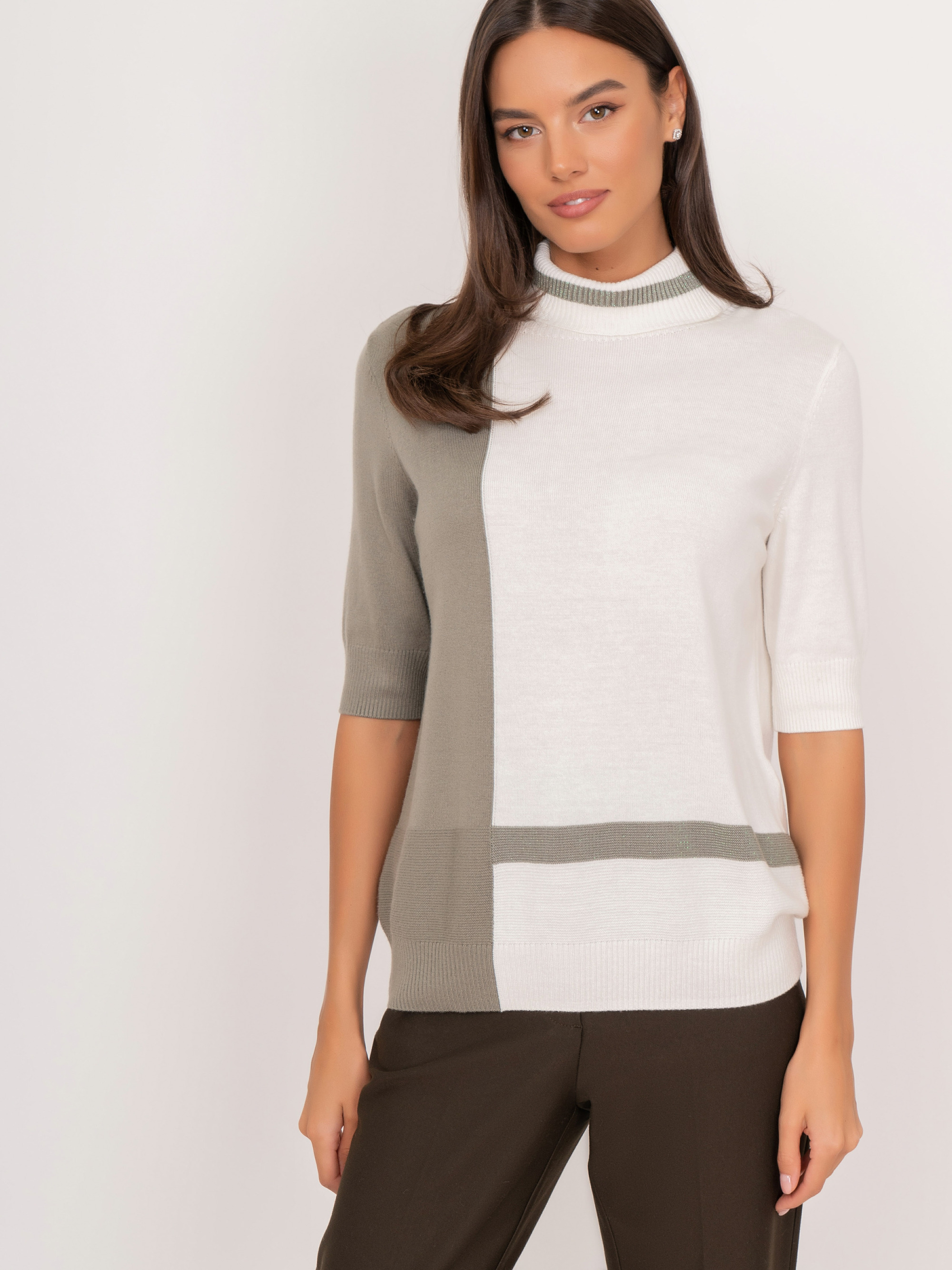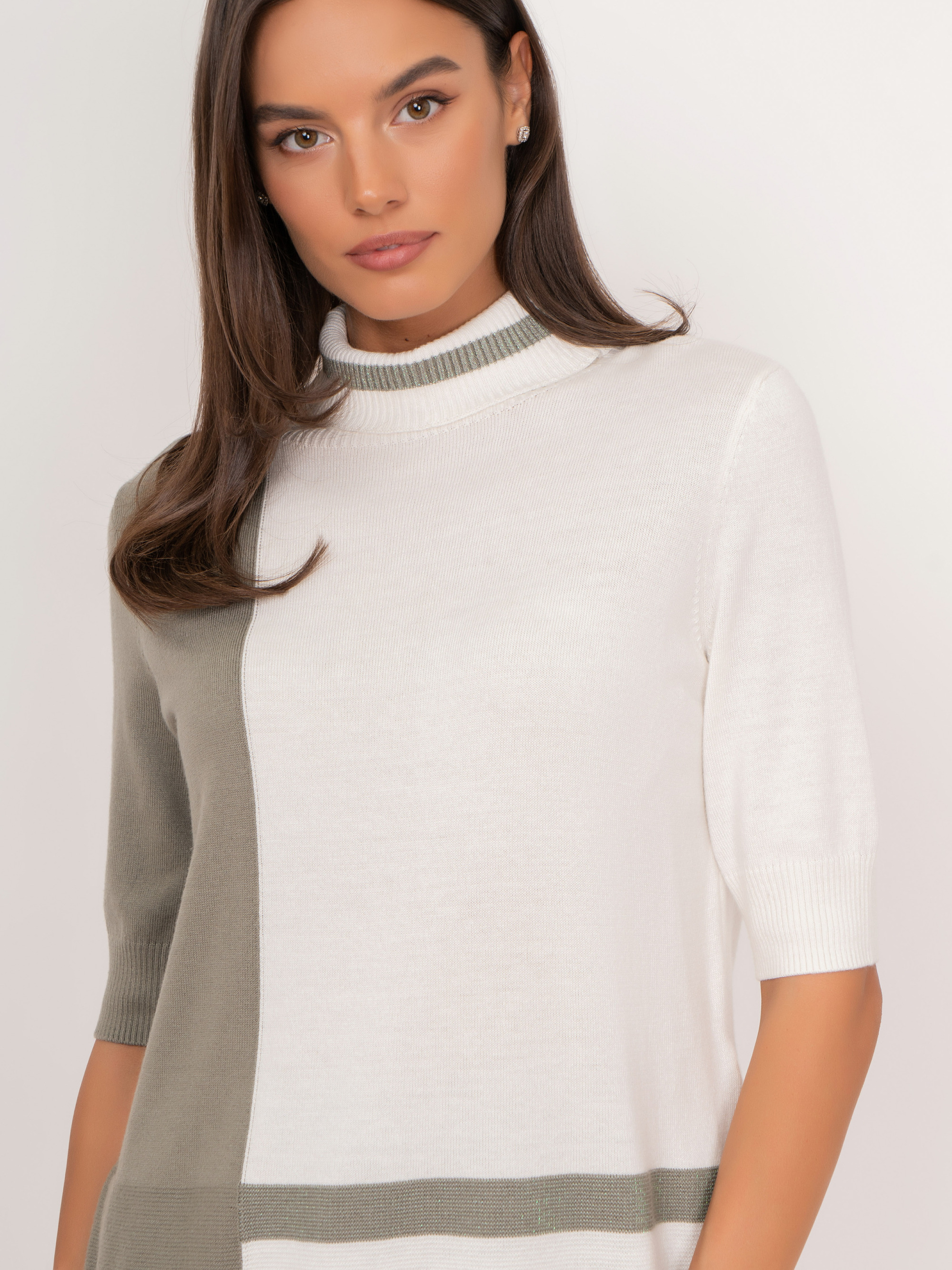 На сайте указаны российские размеры. Трикотажный полуприлегающий белый джемпер с воротником воронка, с коротким 1/2 рукавом, с хаки вставками и полоской. Рост модели: 175 см. Длина джемпера: 57 см.