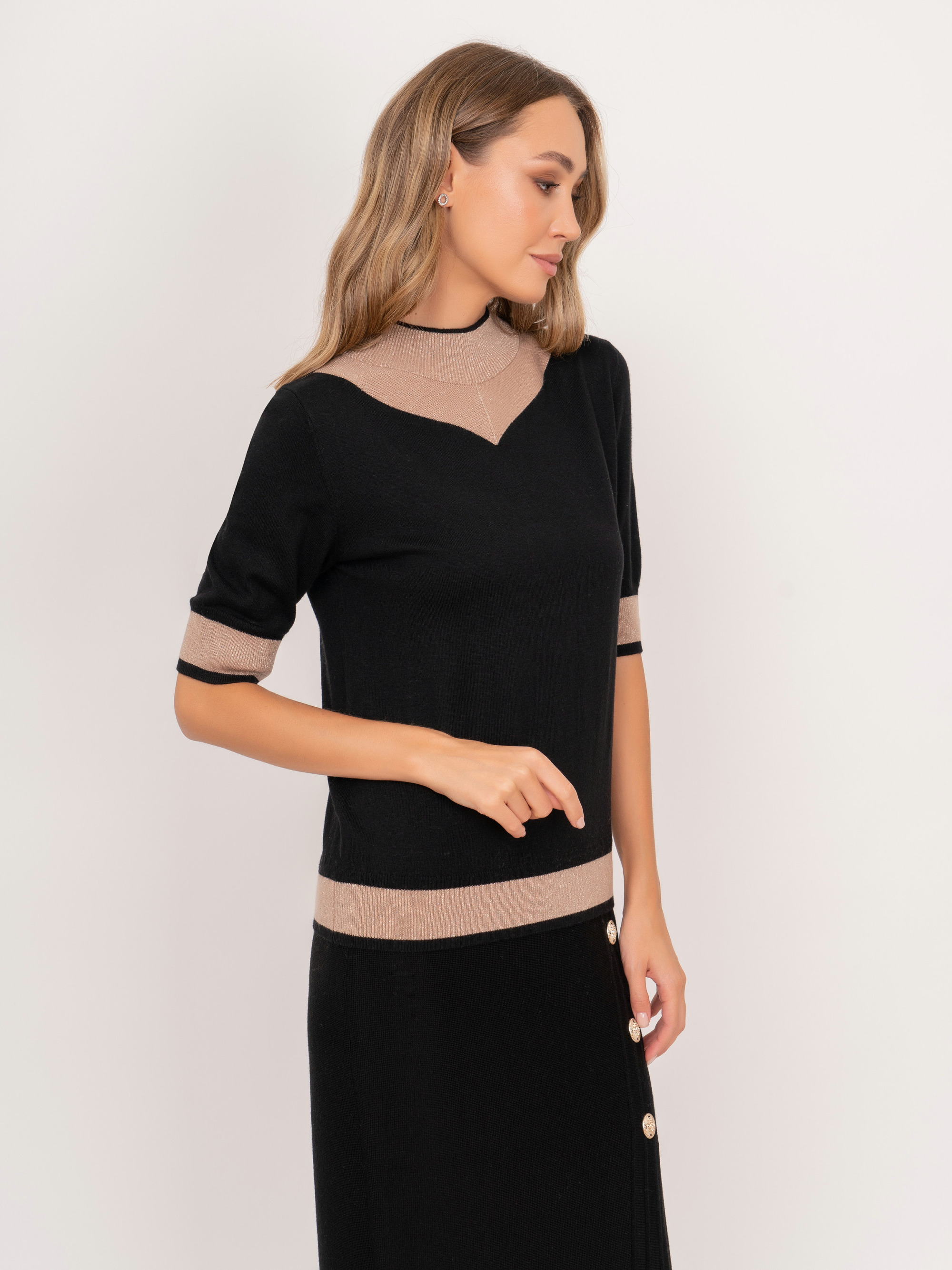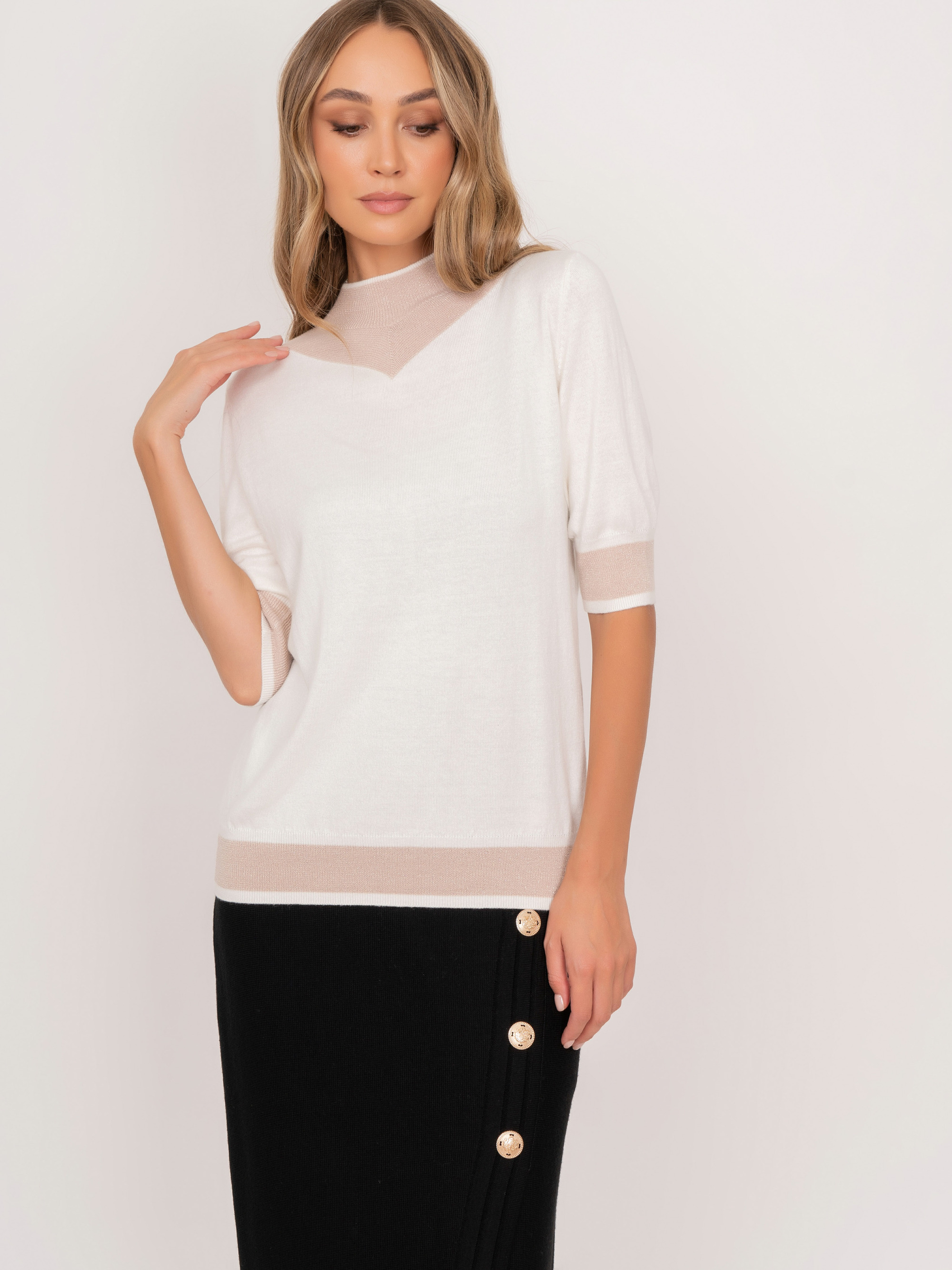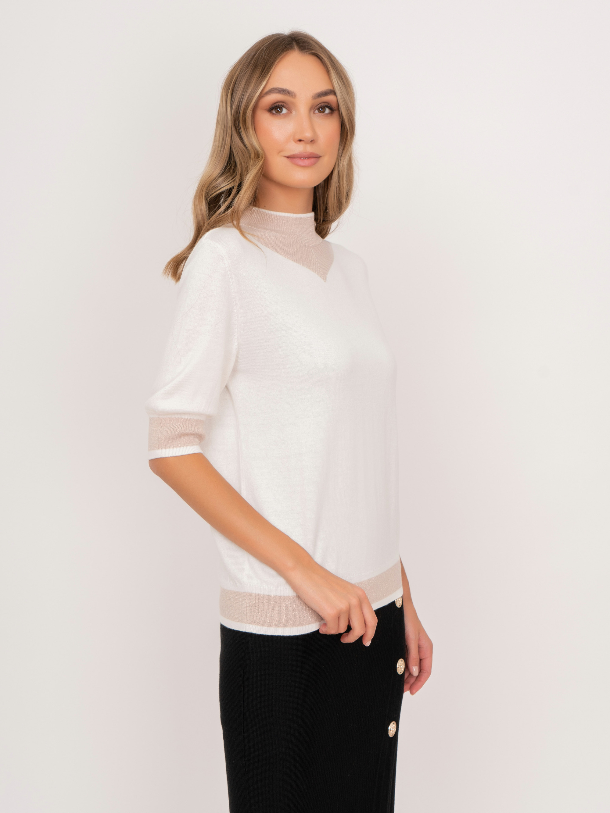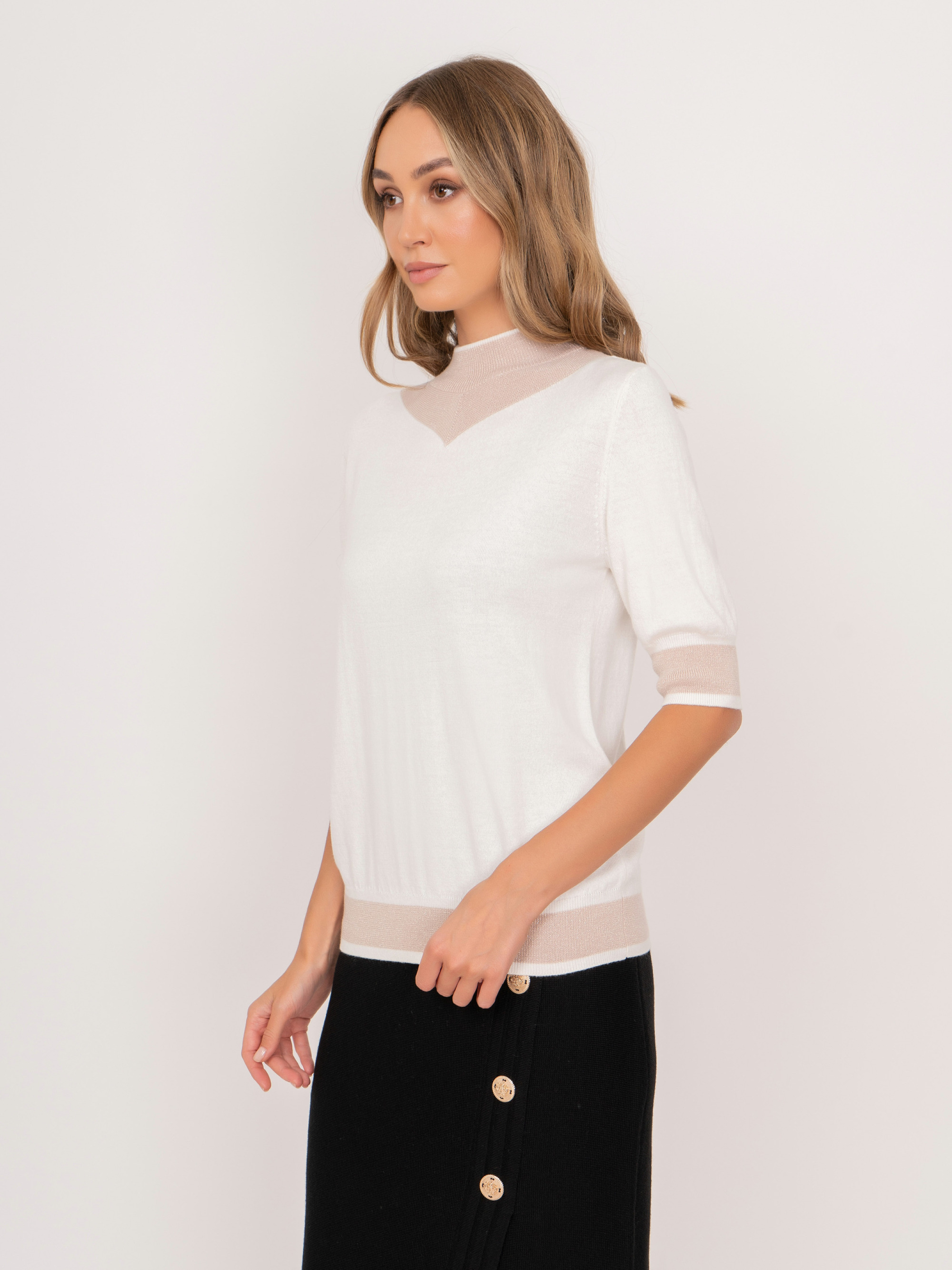 На сайте указаны российские размеры. Трикотажный полуприлегающий джемпер с воротником воронка, с коротким 1/2 рукавом, с бежевыми вставками. Представлен в молочном и черном цветах. Рост модели: 175 см. Длина джемпер: 57 см.