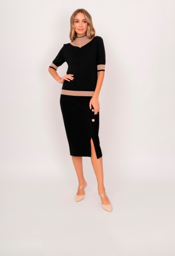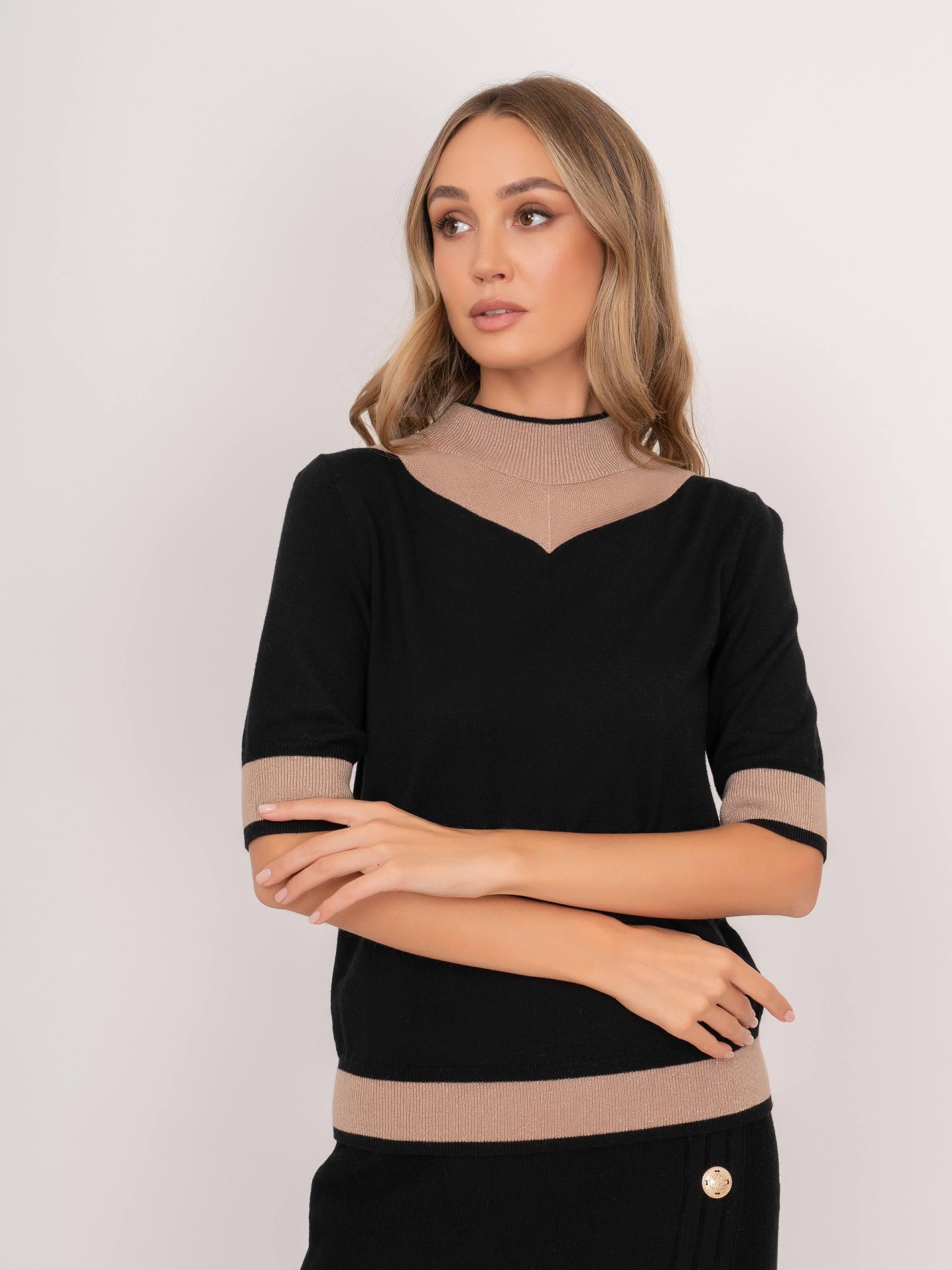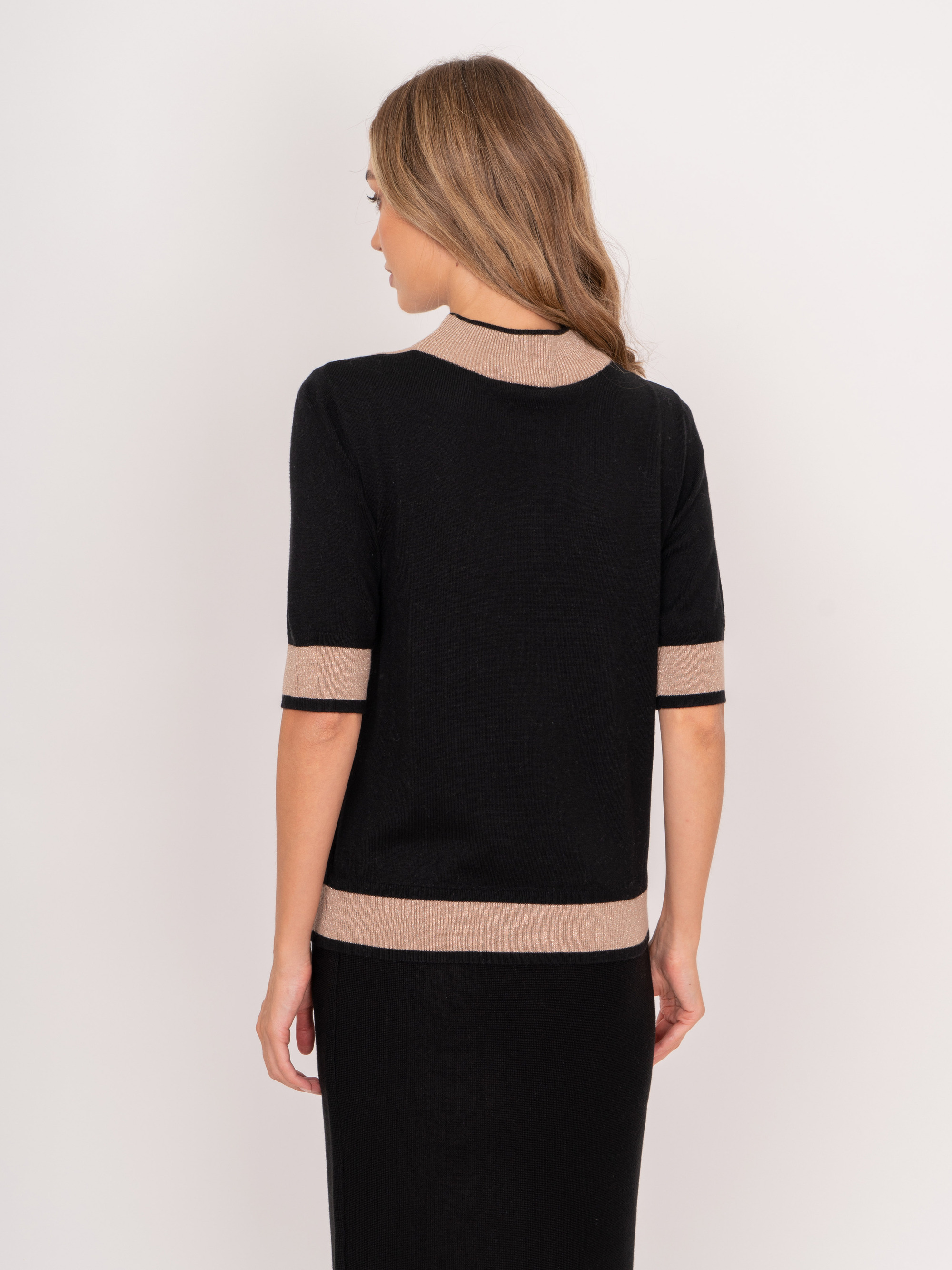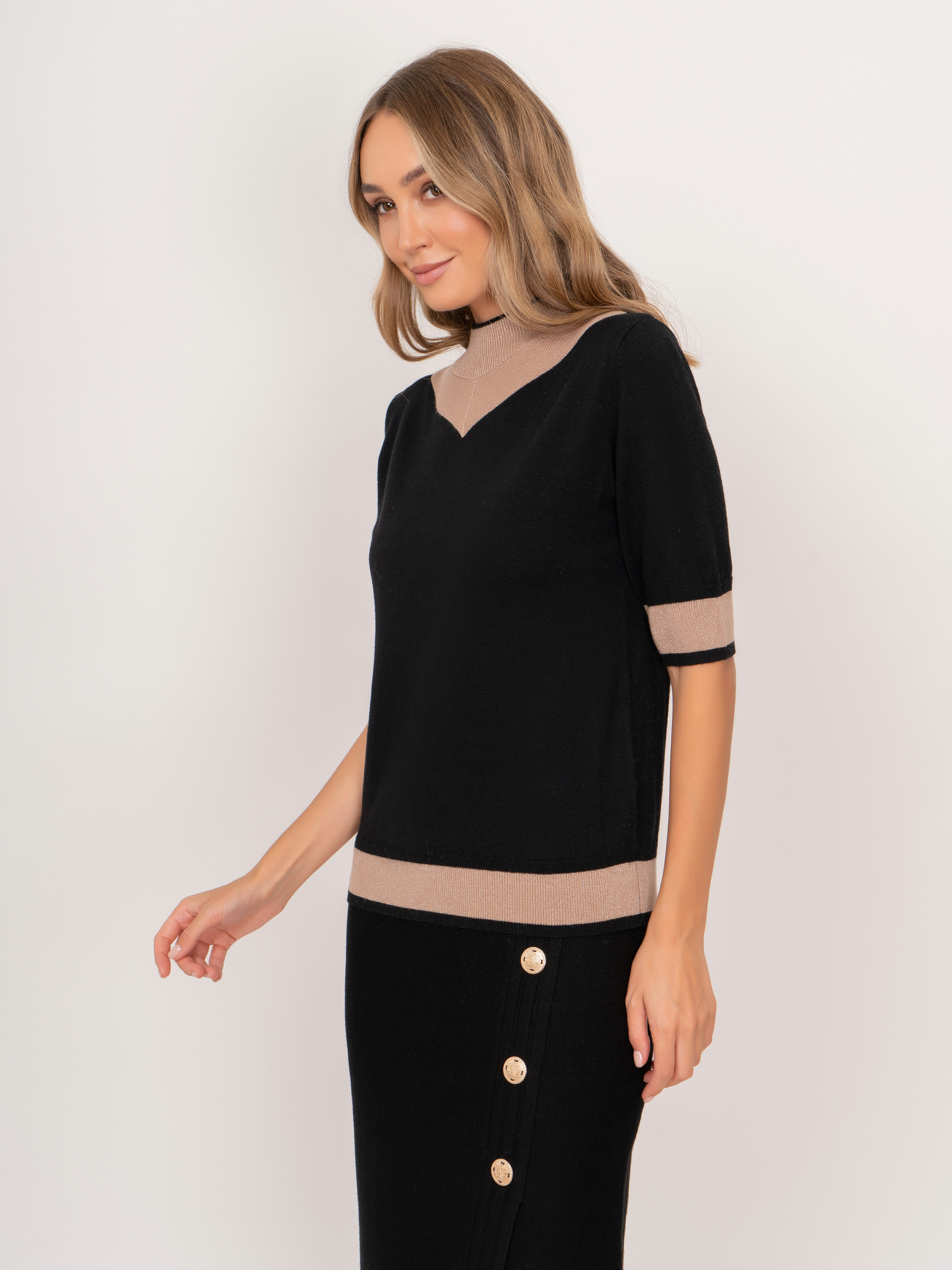 На сайте указаны российские размеры. Трикотажный полуприлегающий джемпер с воротником воронка, с коротким 1/2 рукавом, с бежевыми вставками. Представлен в молочном и черном цветах. Рост модели: 175 см. Длина джемпер: 57 см.